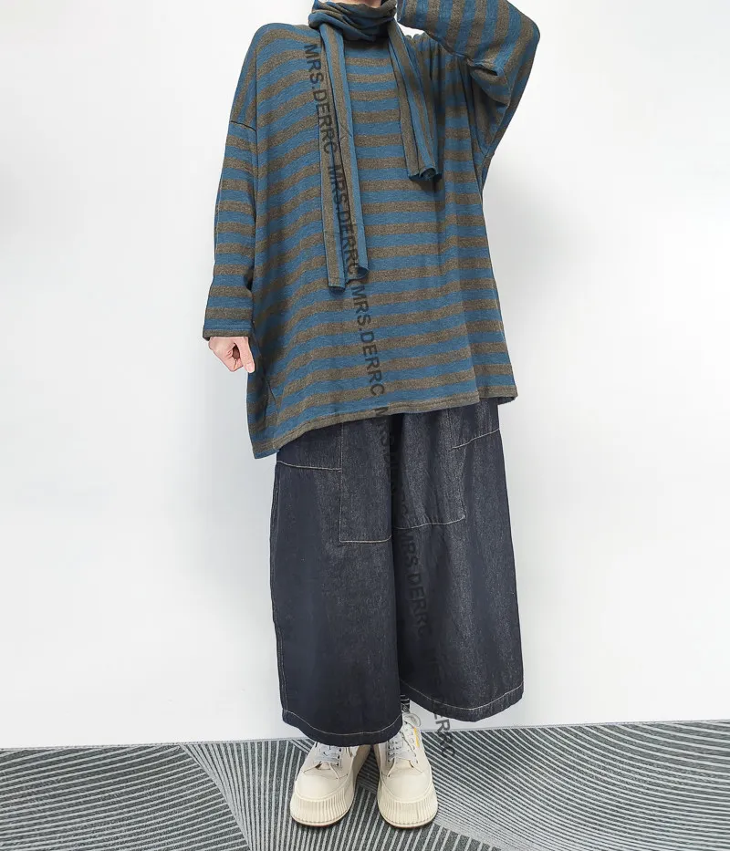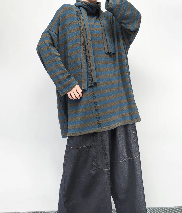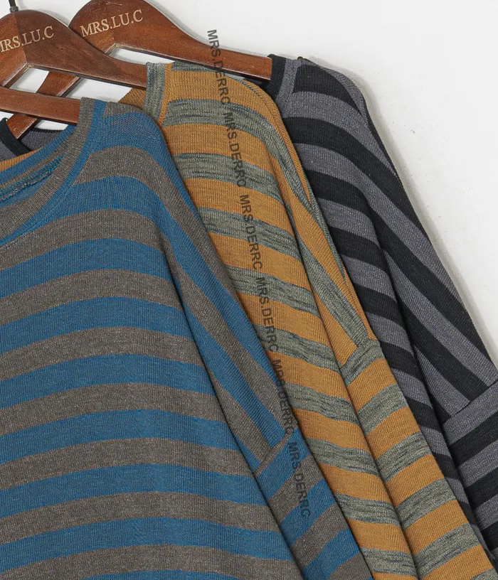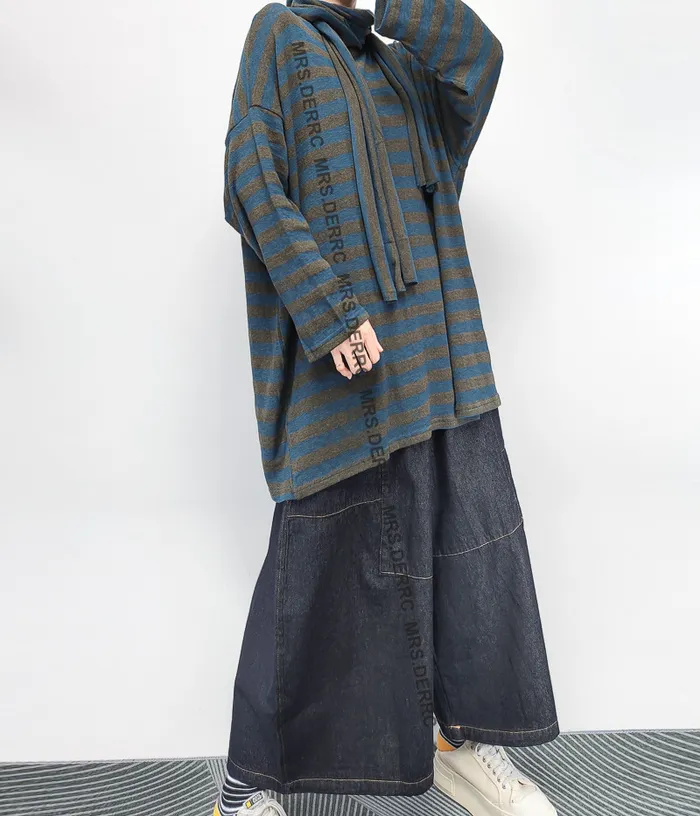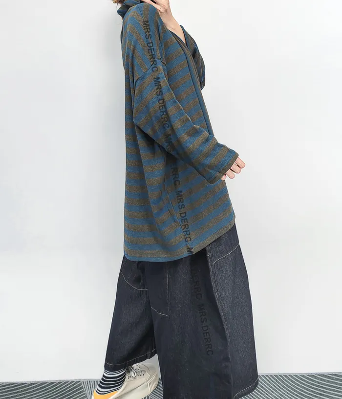 棉混紡軟料垂墜條紋寬鬆上衣(灰藍條)