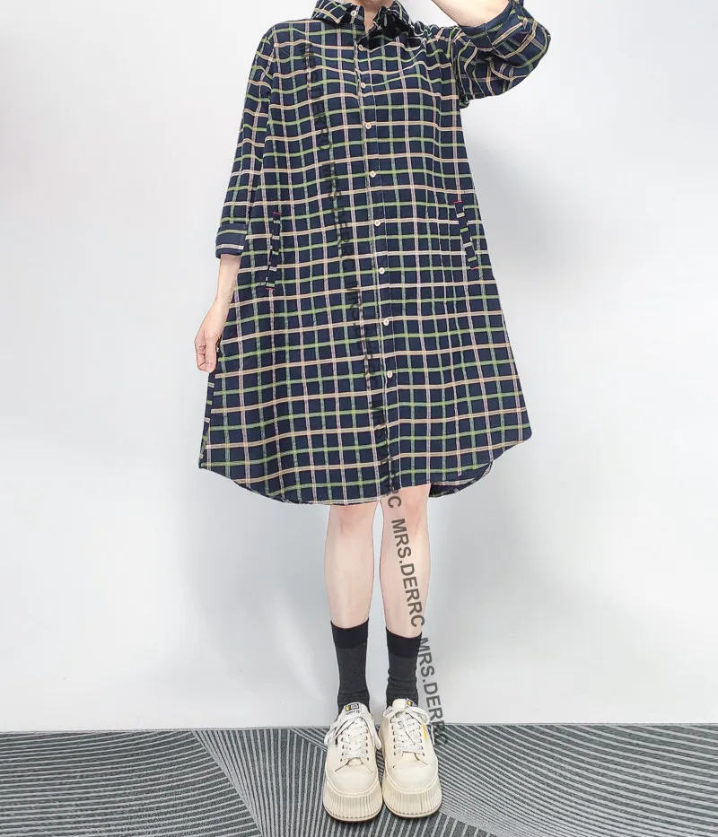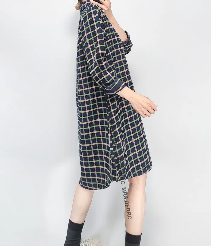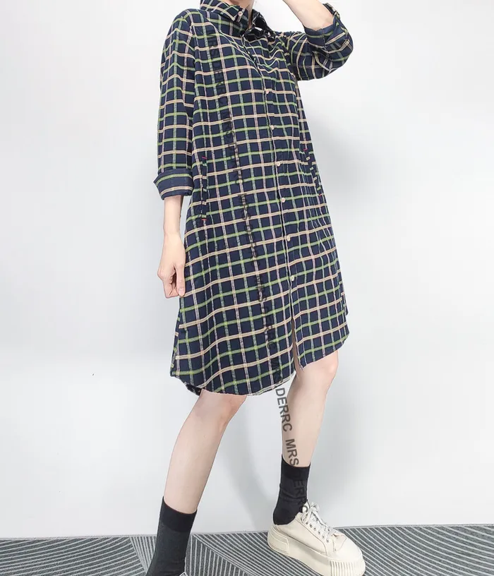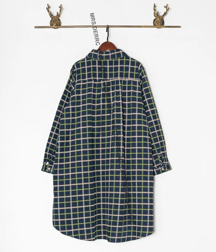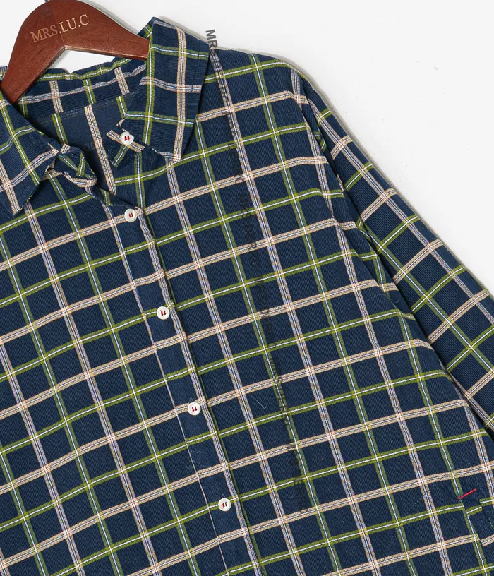 棉質細條絨格紋縫線口袋襯衫洋裝(藍格)
