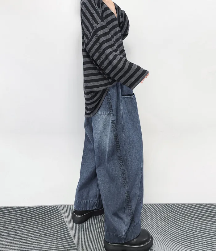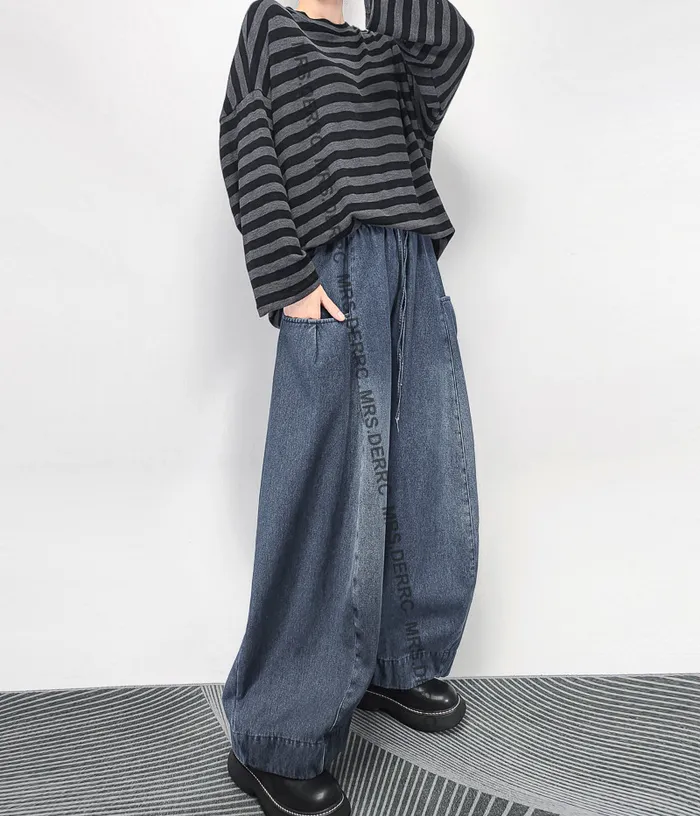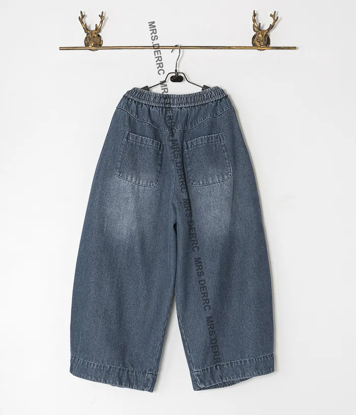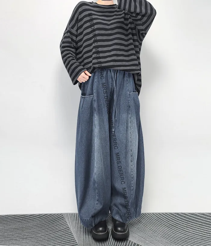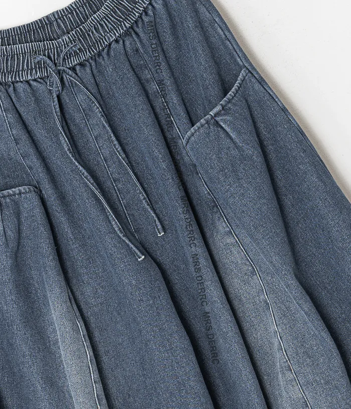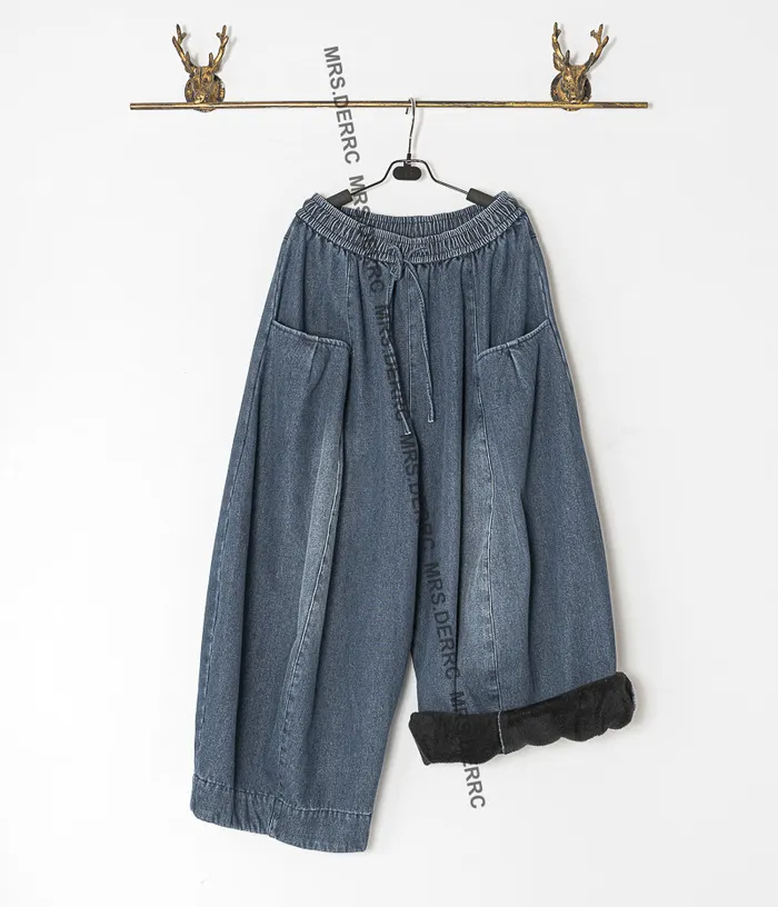 牛仔立體口袋刷色剪裁內磨毛抽繩寬褲