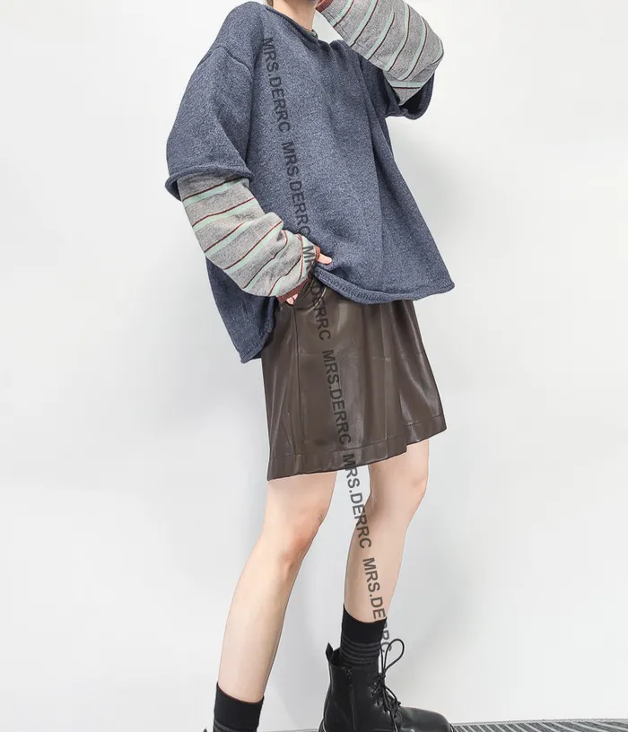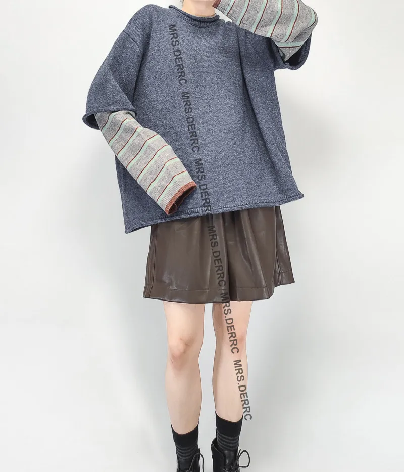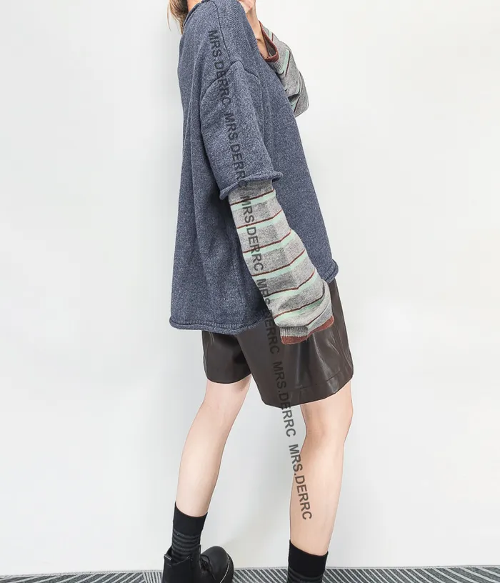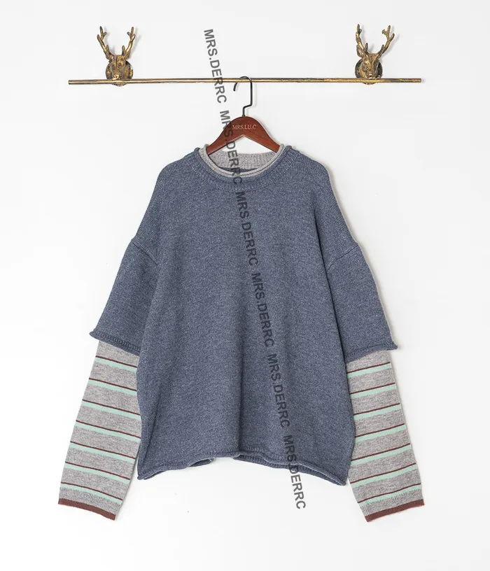 針織條紋拼接袖子假兩件上衣(灰藍)