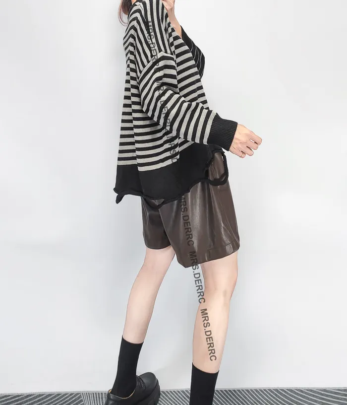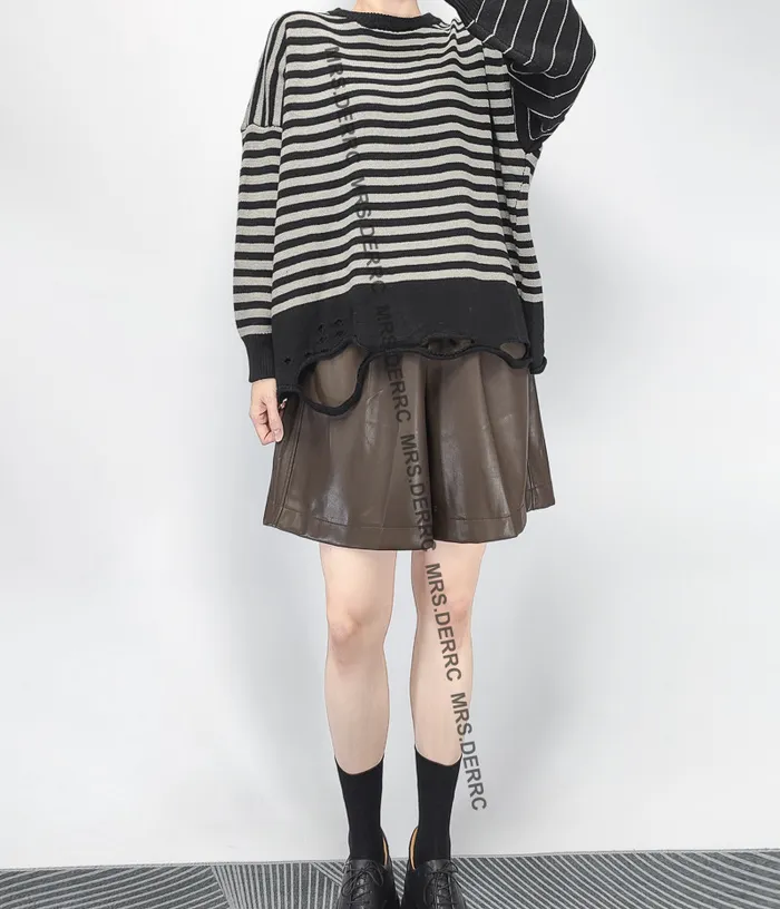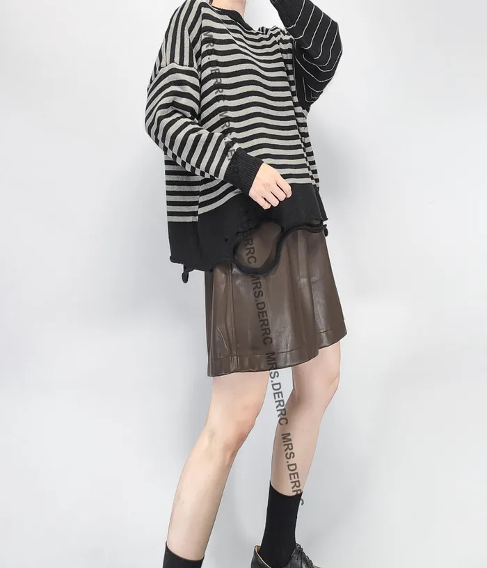 針織雙色條紋下擺剪破造型上衣(黑條)
