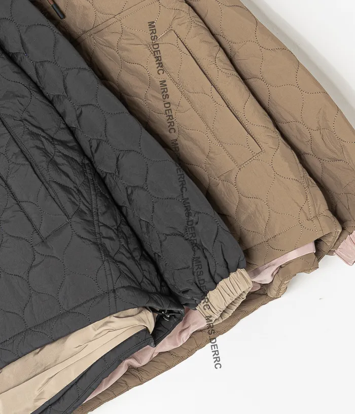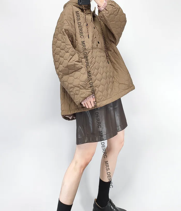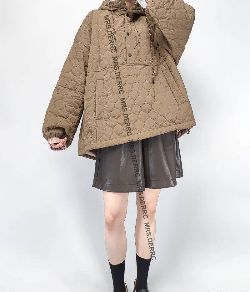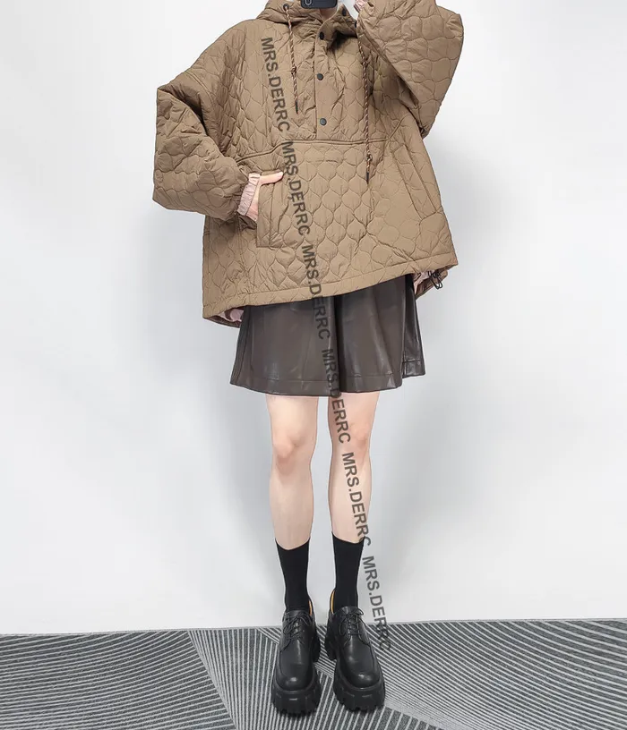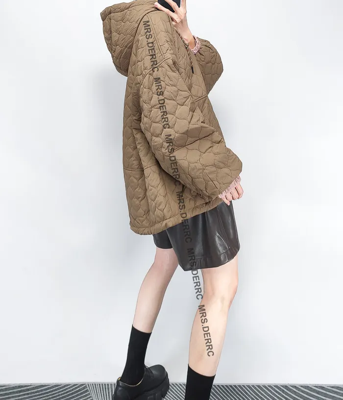 棉混紡衍縫半開釦鋪棉連帽口袋寬鬆上衣(咖色)