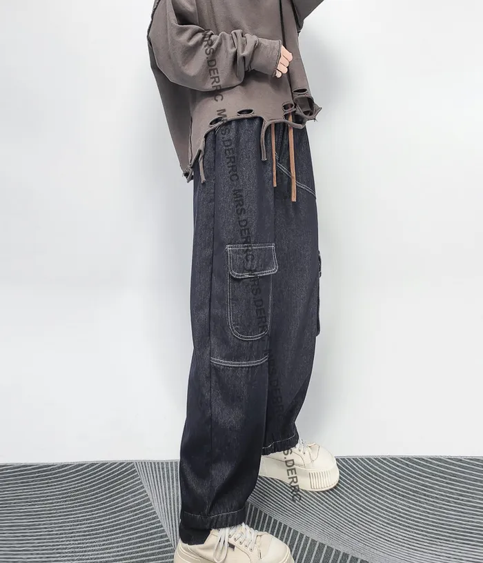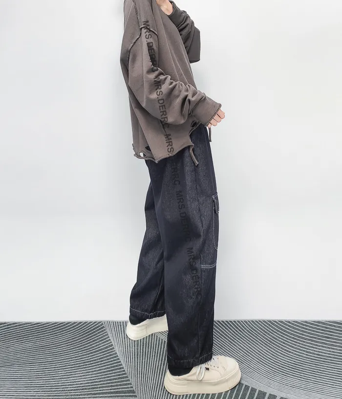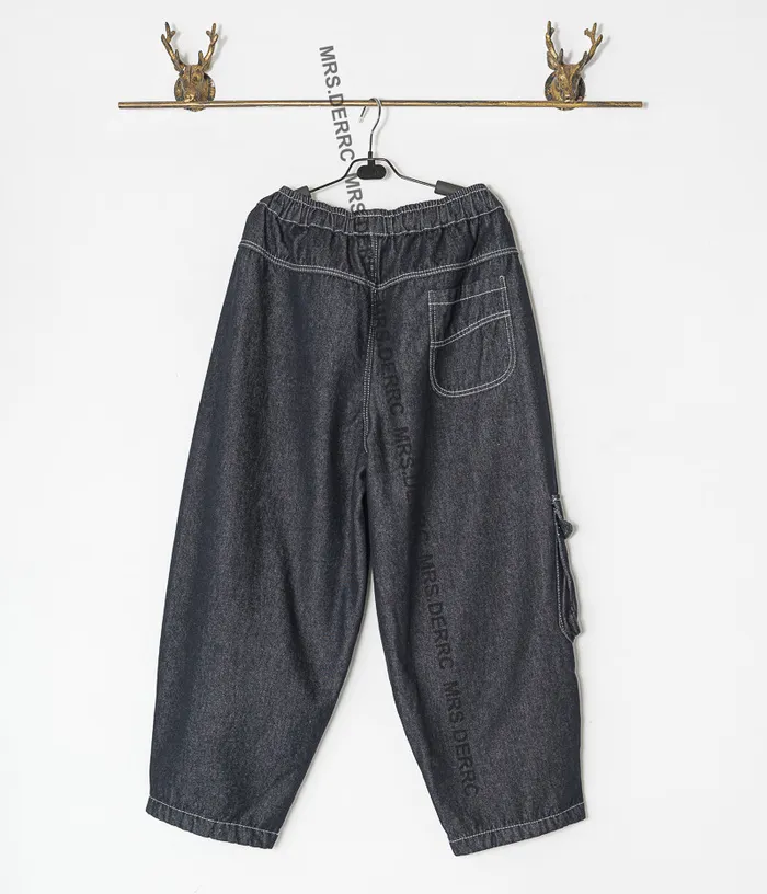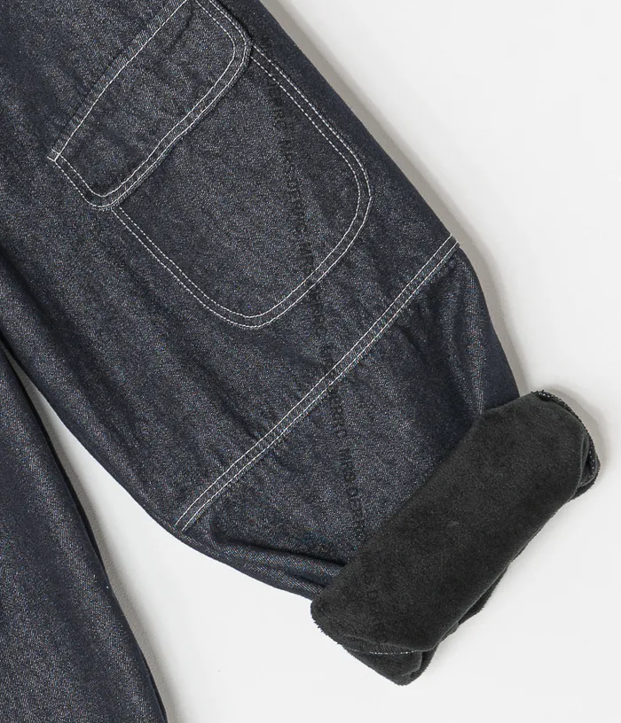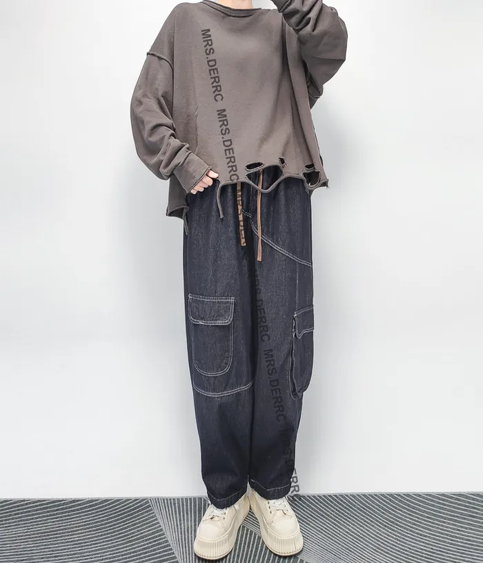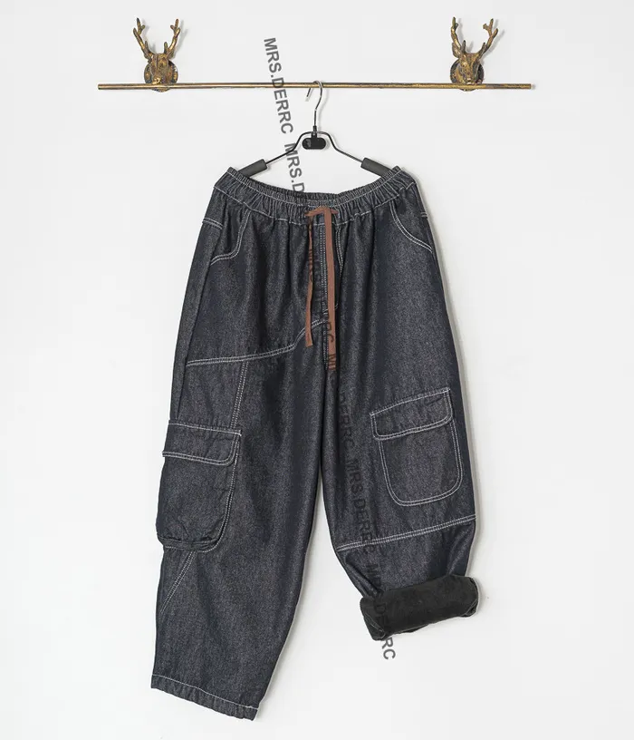 牛仔內磨毛白縫線抽繩不對稱口袋褲