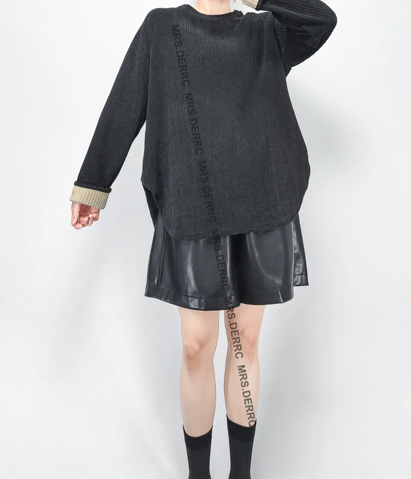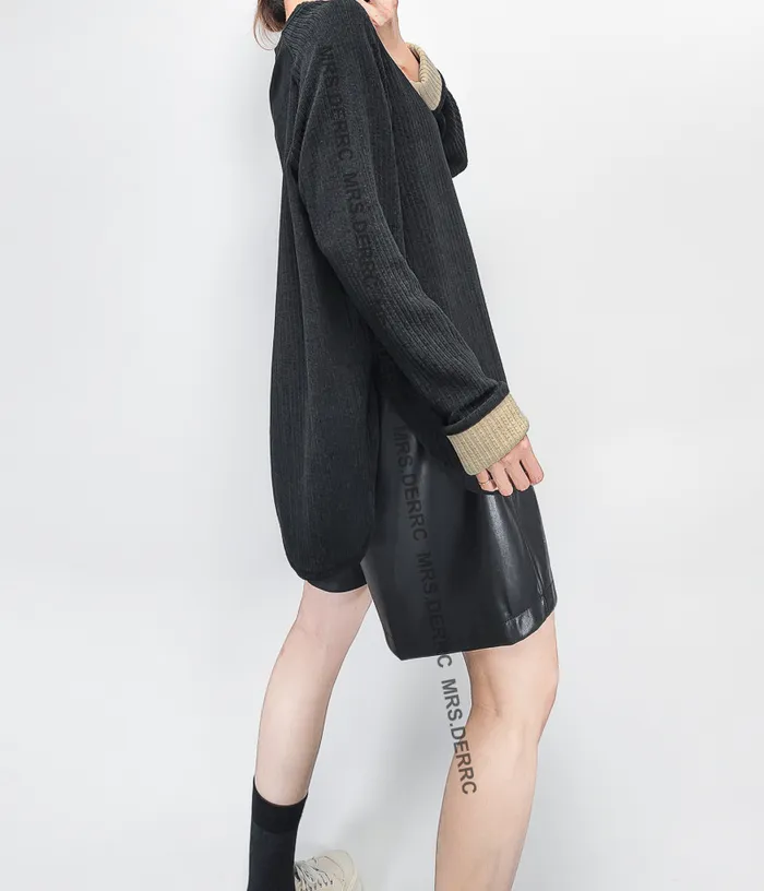 棉混紡坑條袖撞色反摺上衣(黑色)