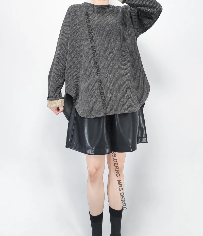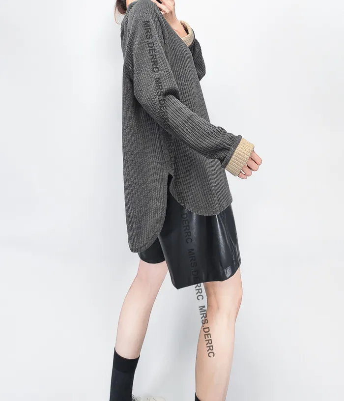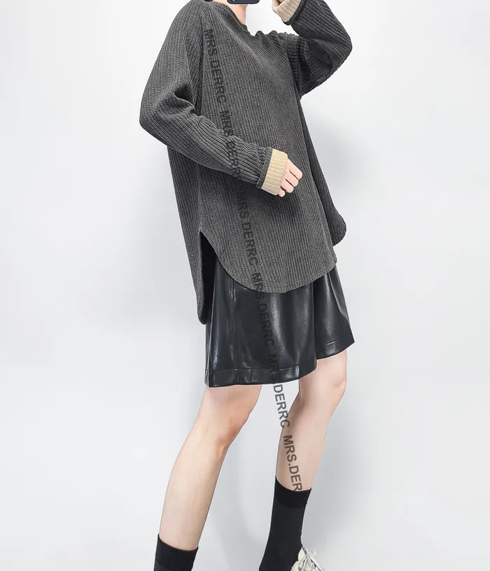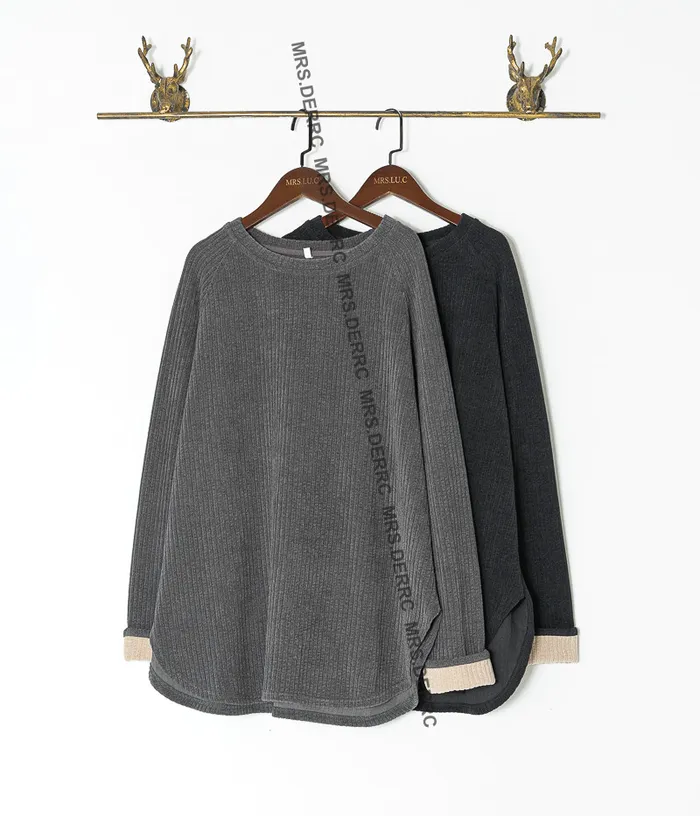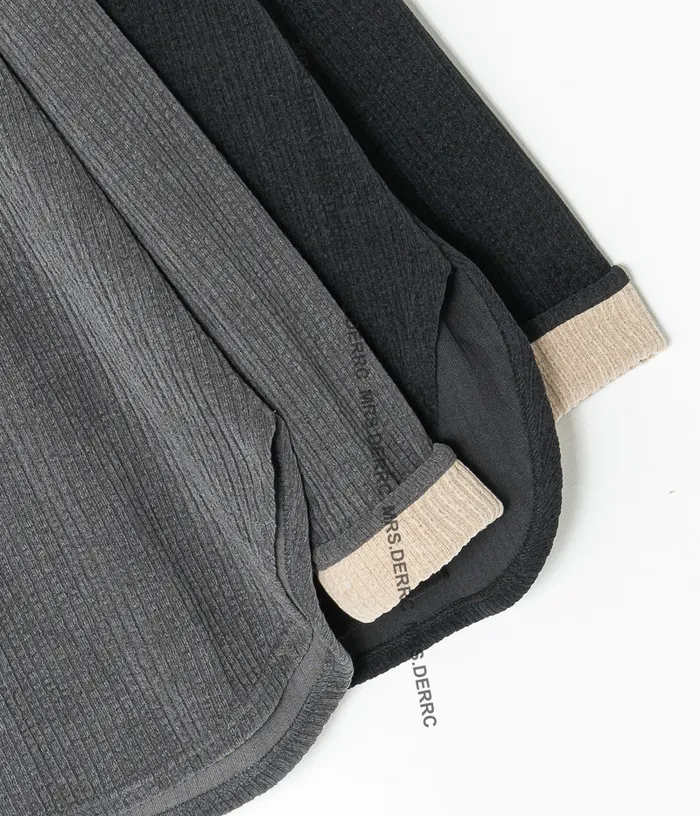 棉混紡坑條袖撞色反摺上衣(灰色)