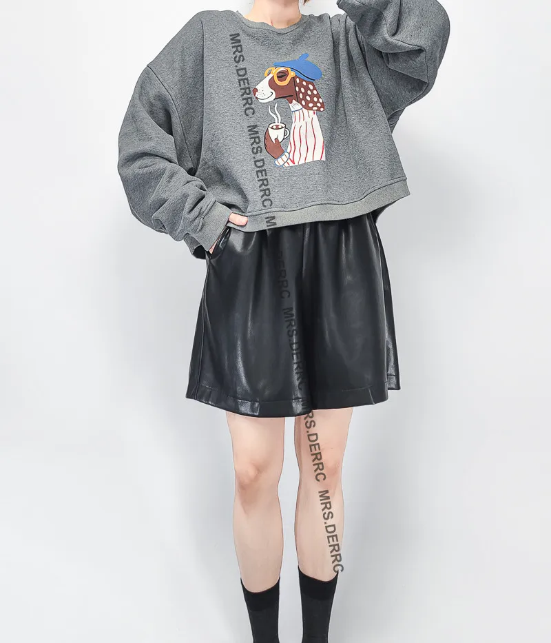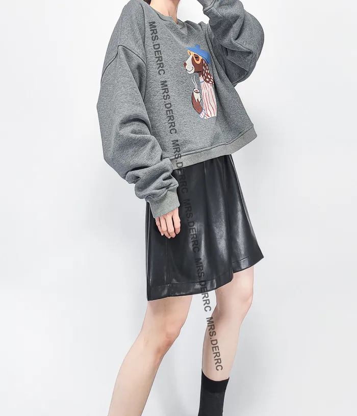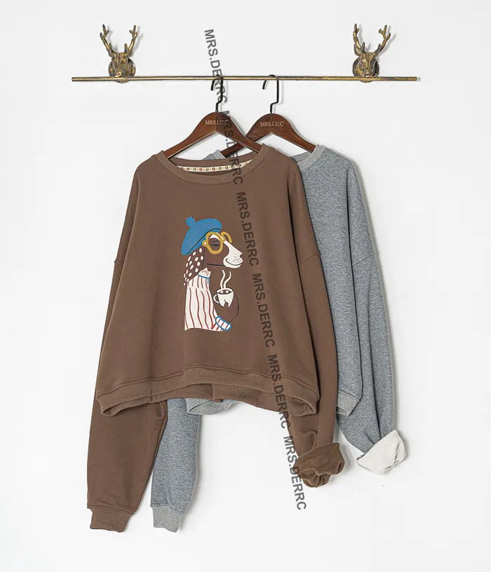 棉質內磨毛咖啡小狗寬鬆短版上衣(灰色)