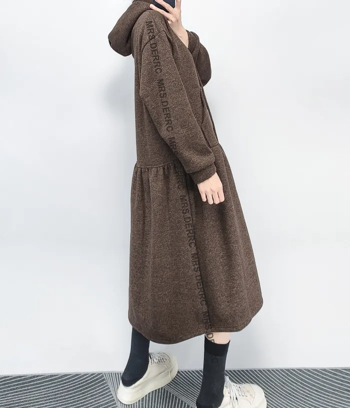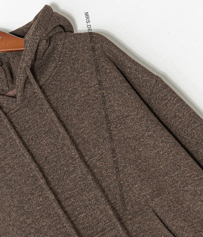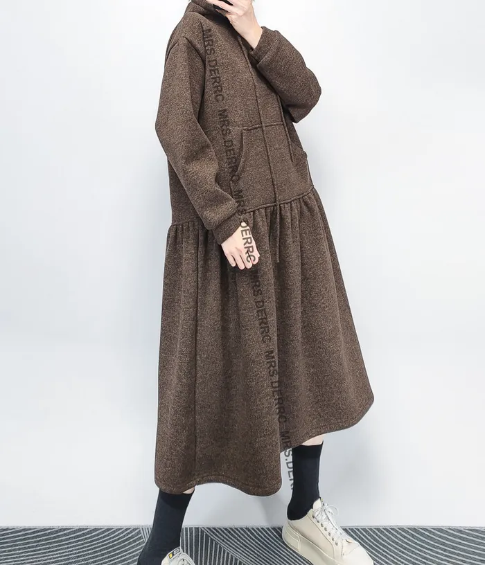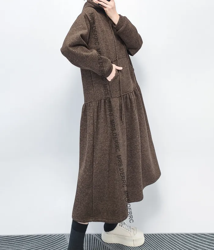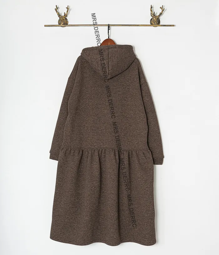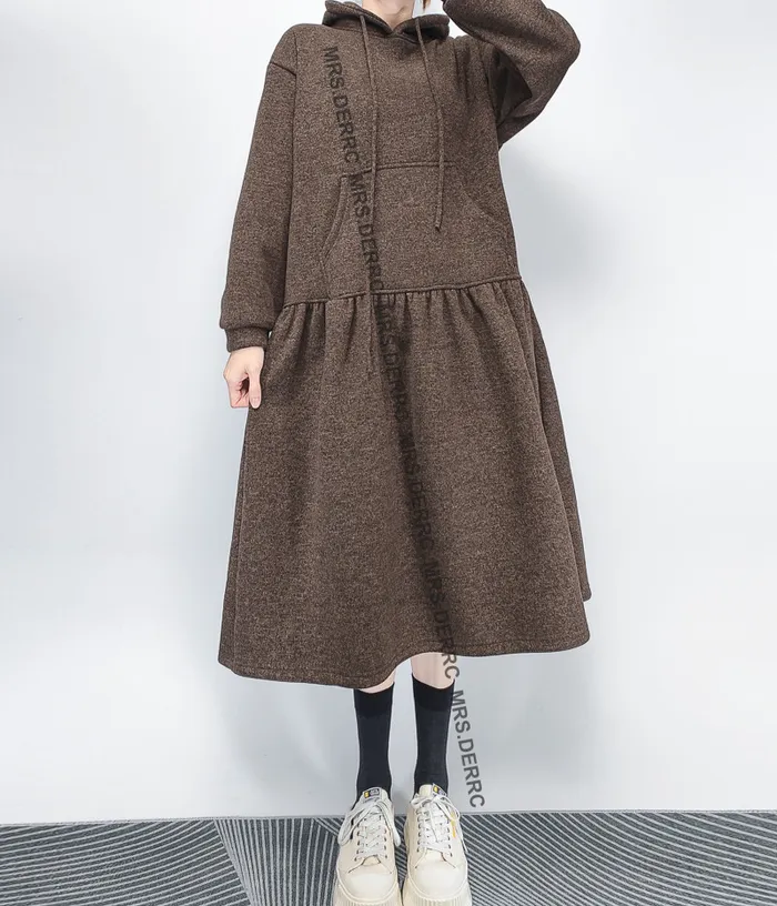 羊混紡內磨毛連帽下拼接肚子口袋洋裝(咖色)