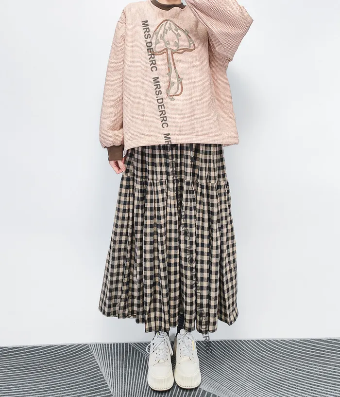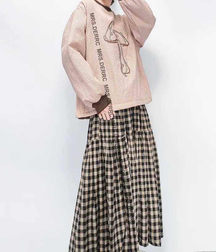 棉質微皺小格領撞色刺繡鋪棉上衣(灰粉)