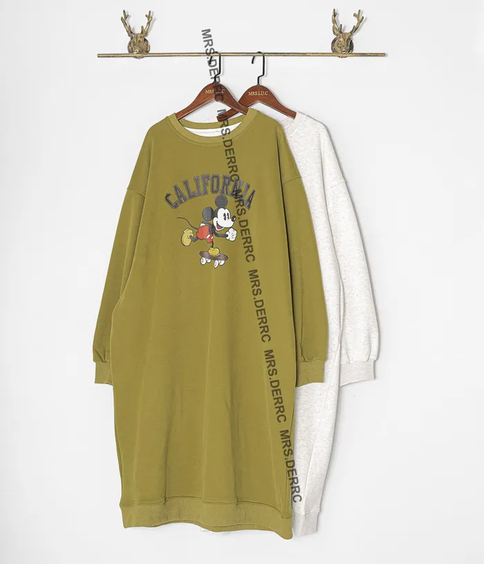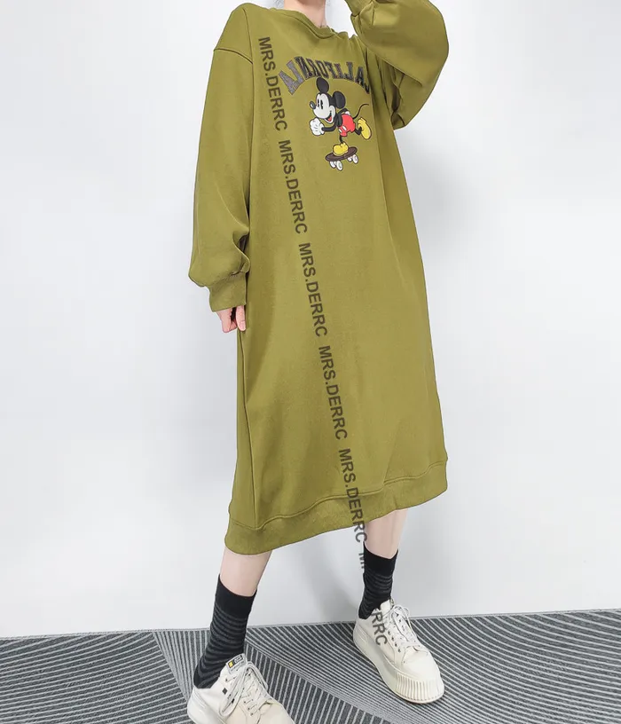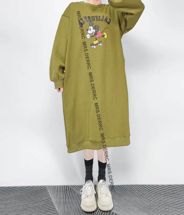 棉混紡內磨毛大米印花口袋洋裝(橄欖綠)
