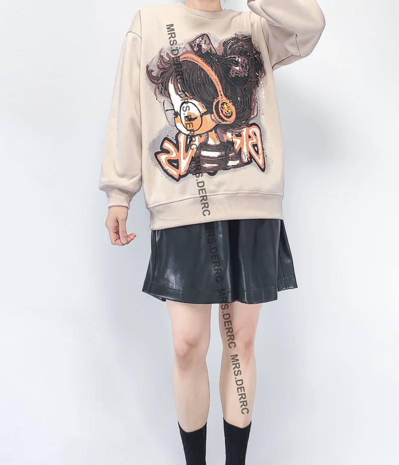 棉混紡內磨毛立體印花耳機女孩上衣(淺卡其)