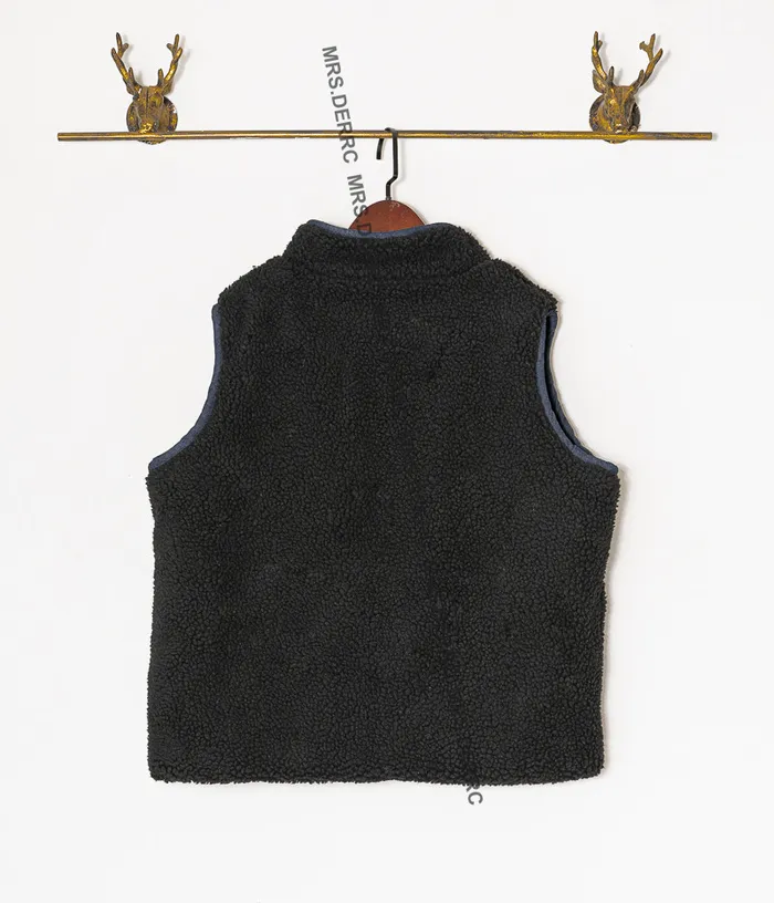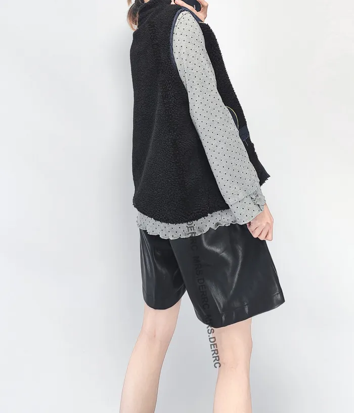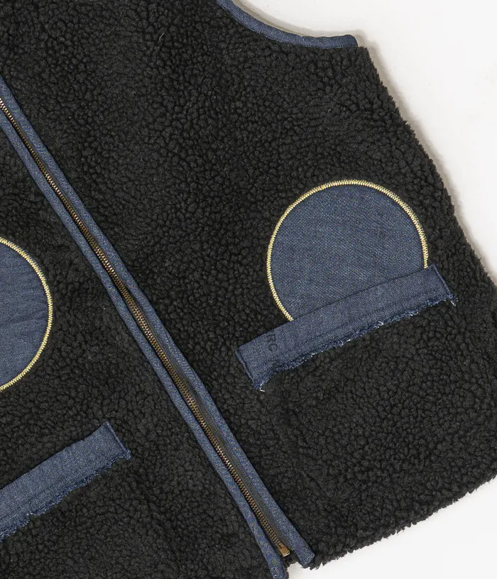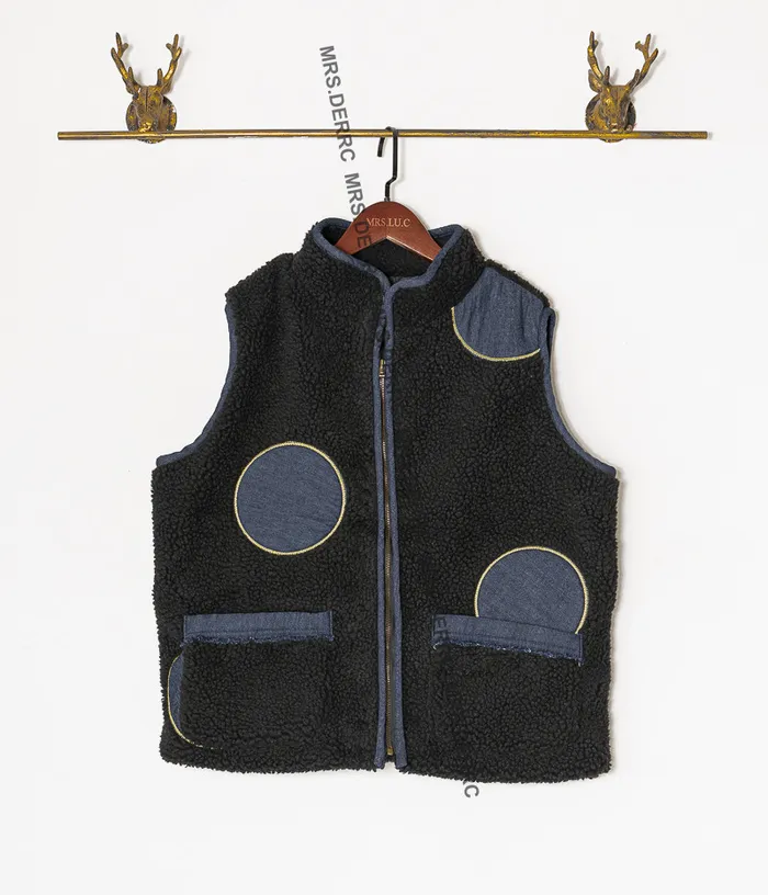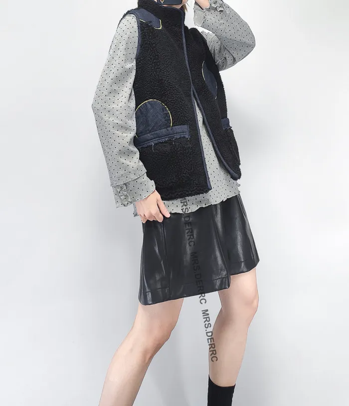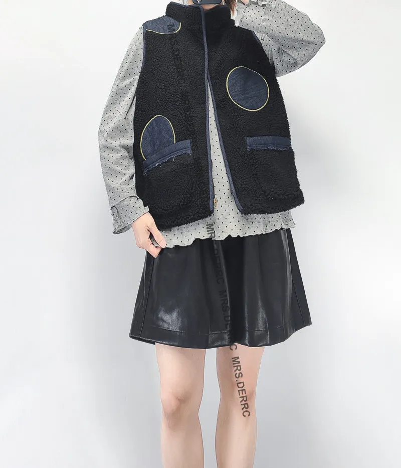 QQ毛牛仔拼布口袋拉鍊背心(黑色)