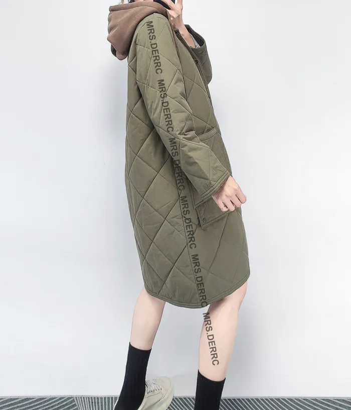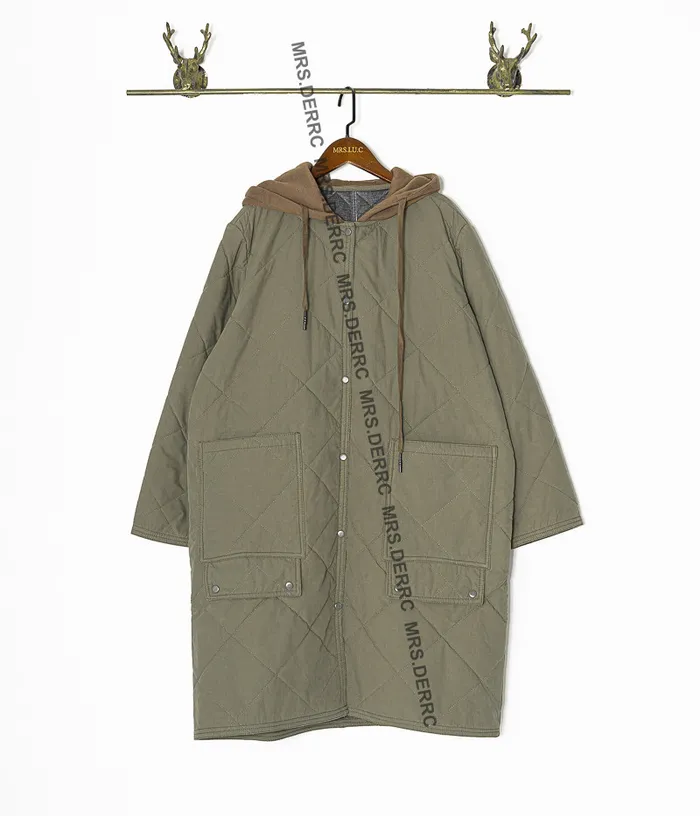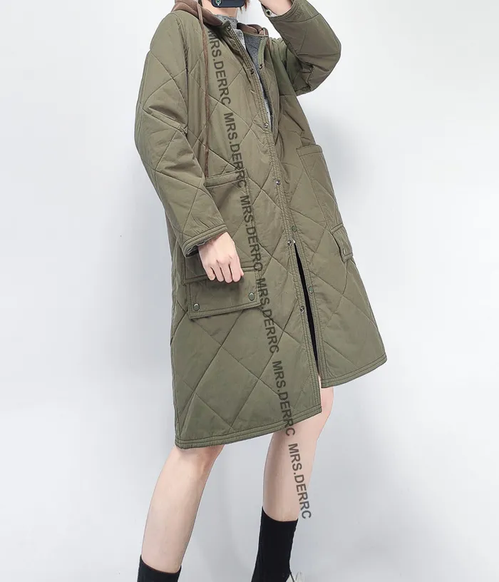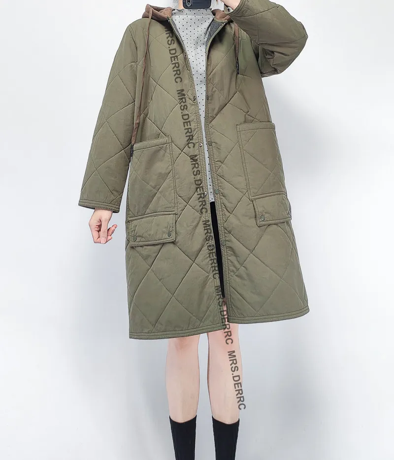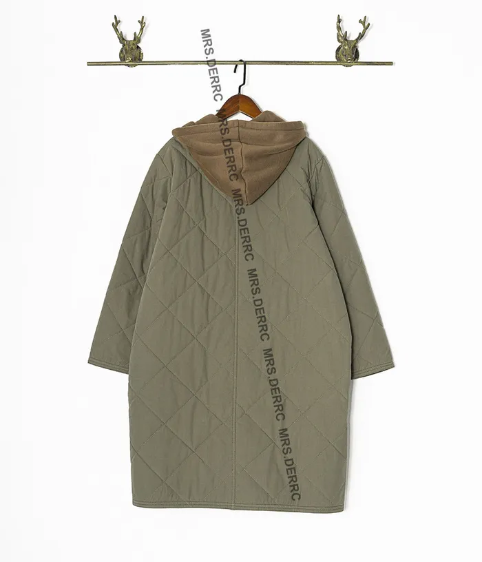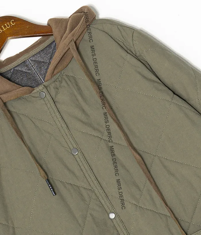 棉質菱格衍縫鋪棉撞色帽子開釦口袋外套(綠色)