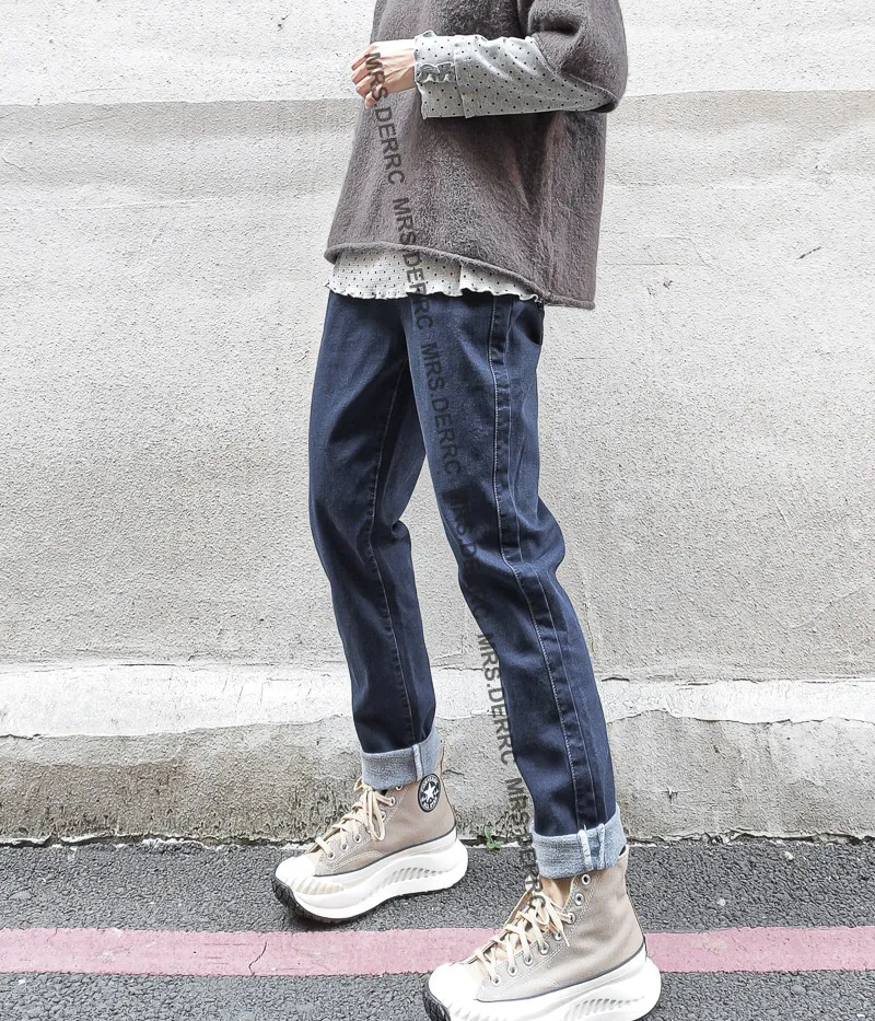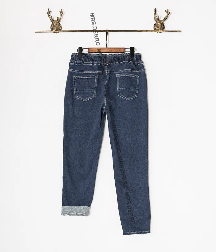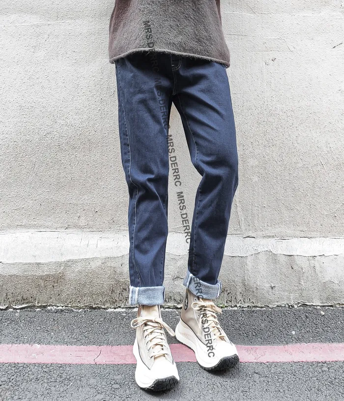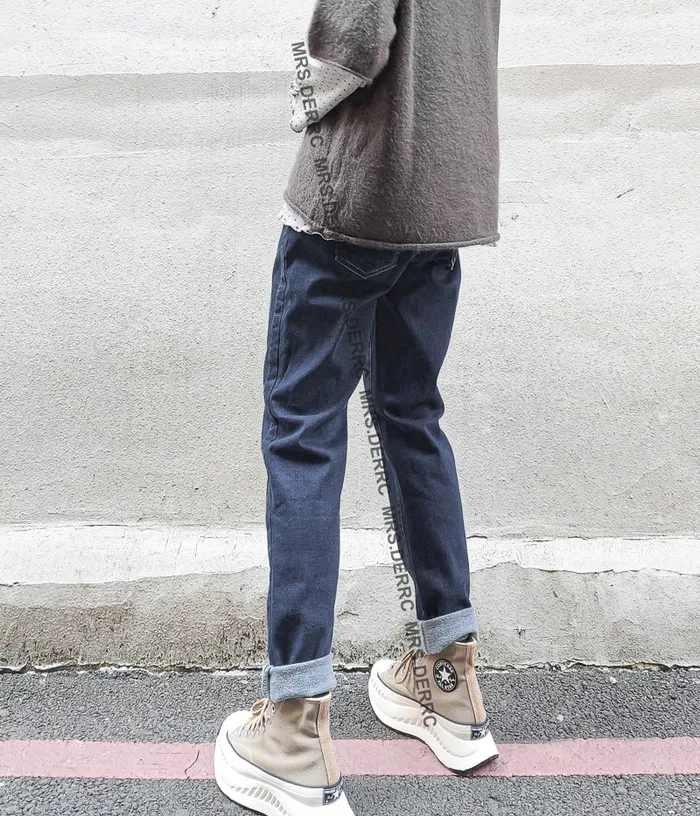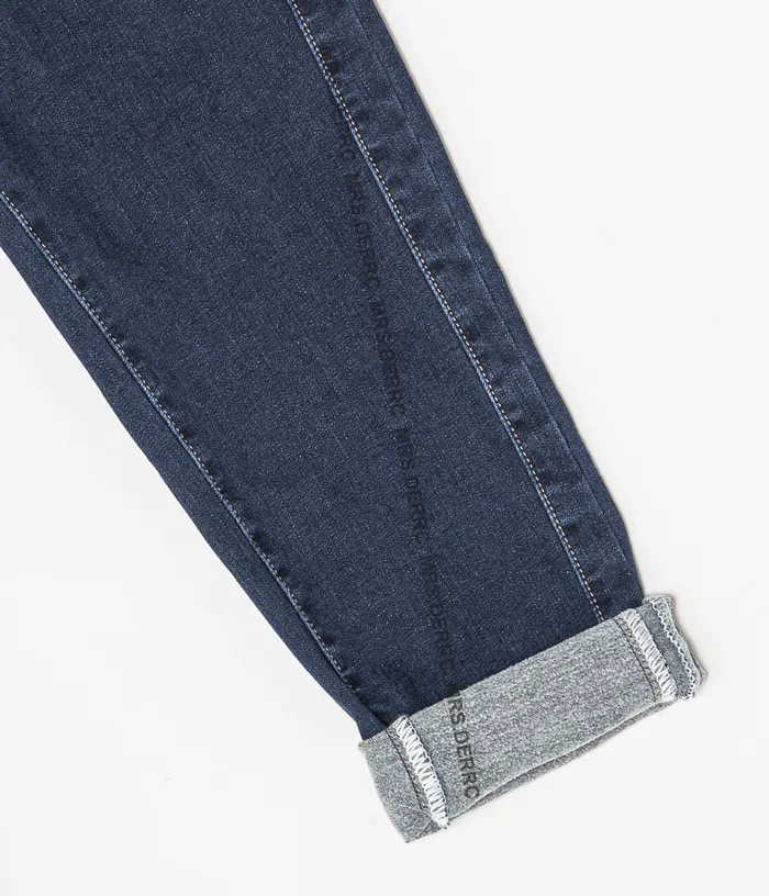 水洗牛仔薄磨毛側剪裁口袋褲(牛仔藍)
