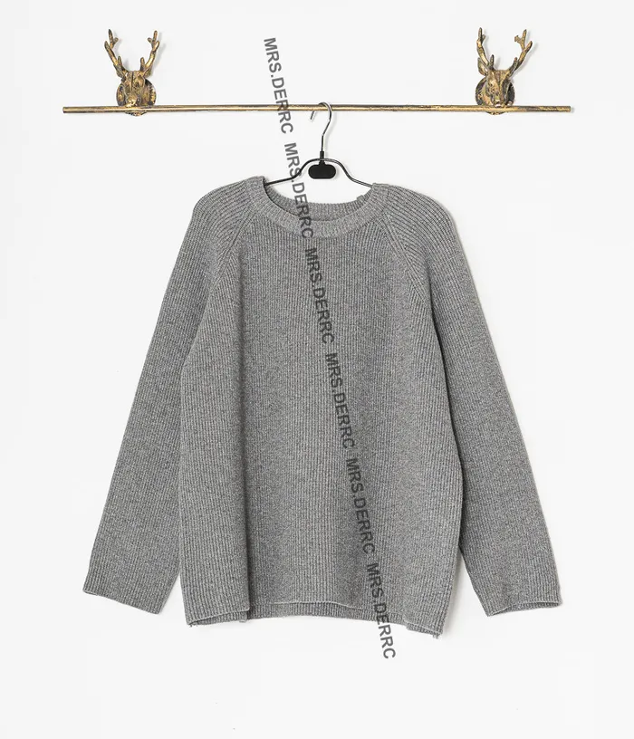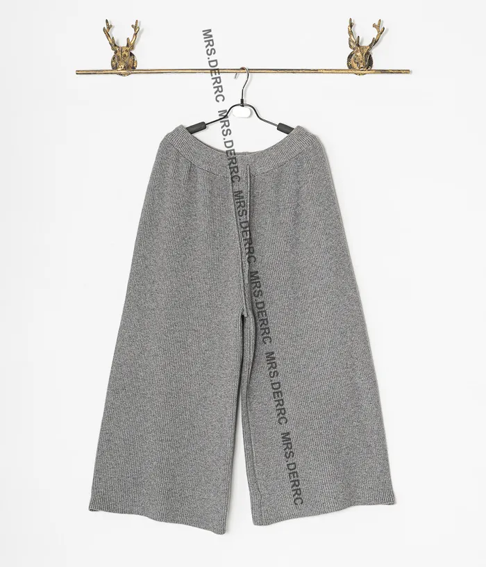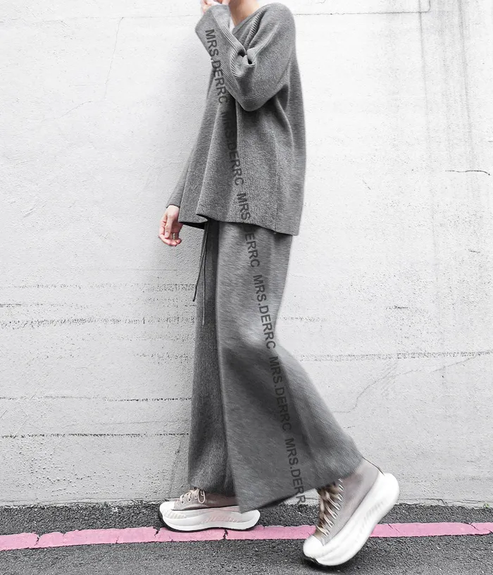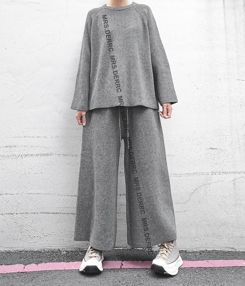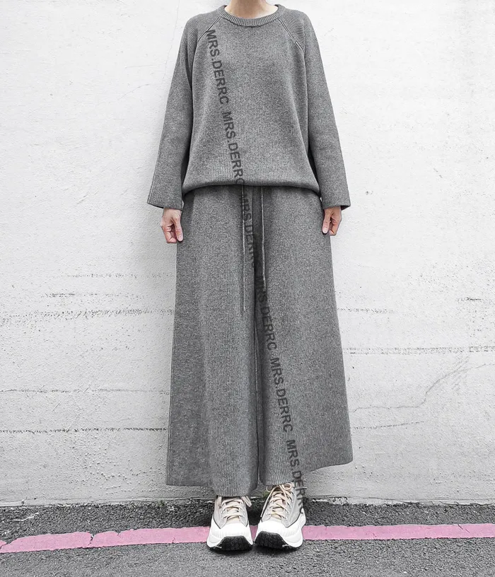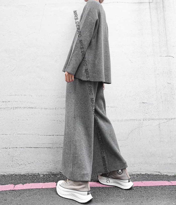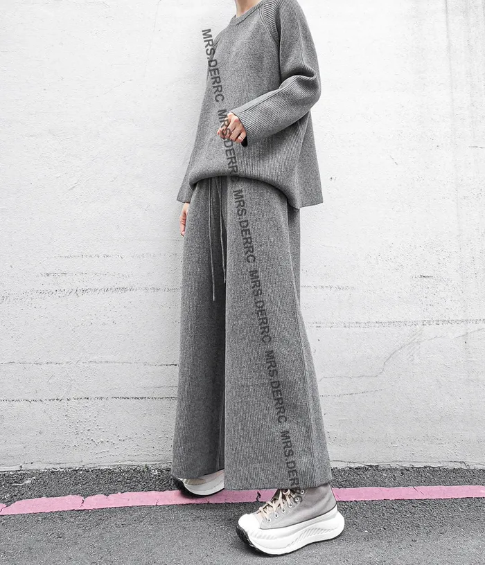 坑條針織上衣+抽繩寬褲套裝(淺灰)