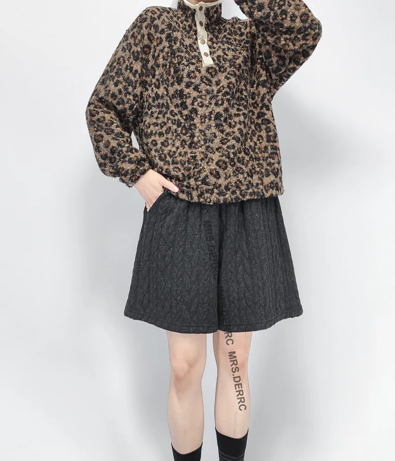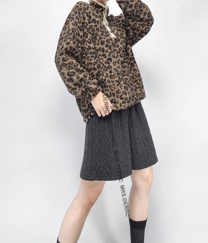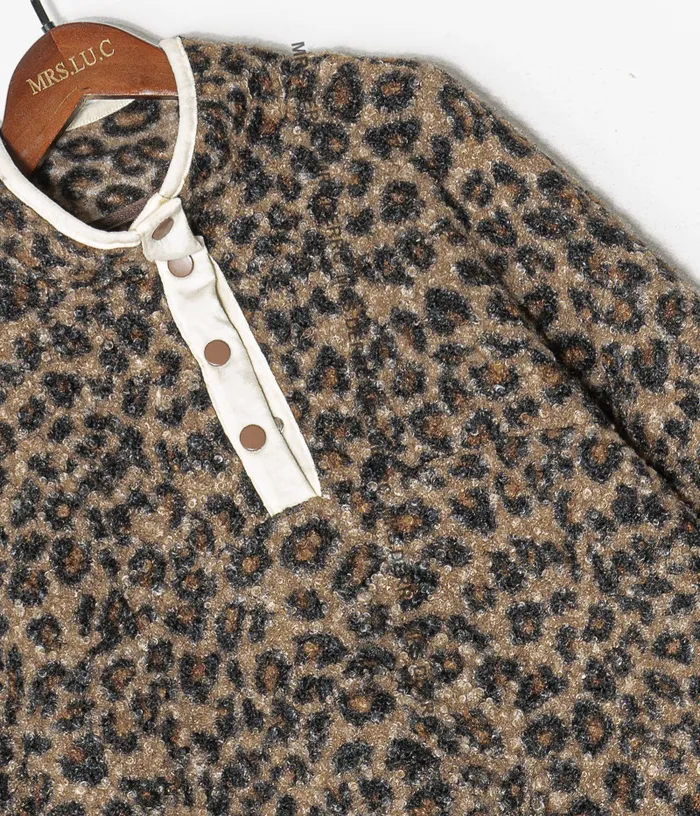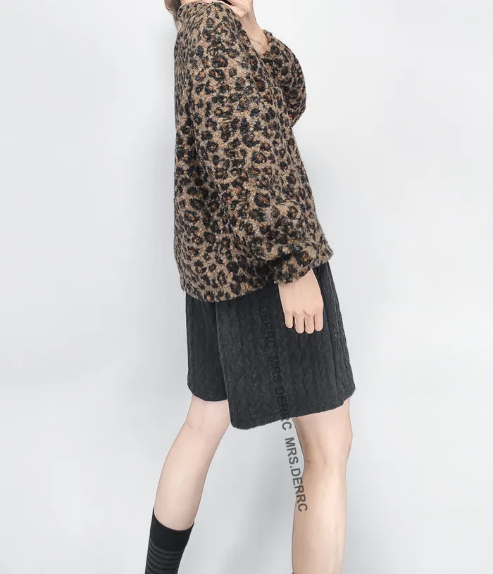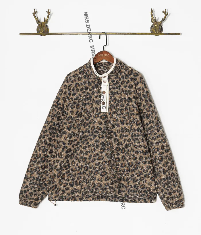 混紡QQ毛滾邊半開釦下抽繩上衣(豹紋)