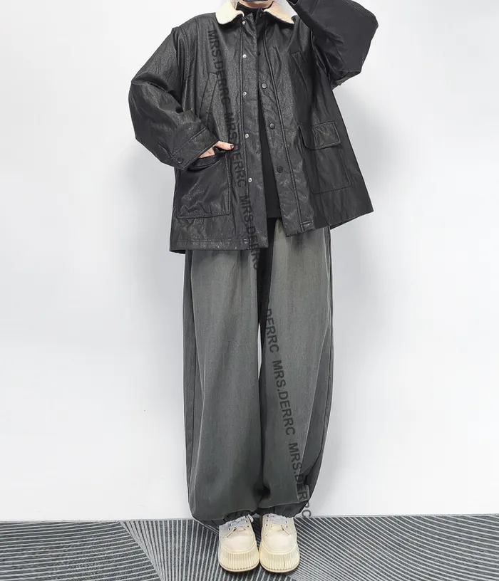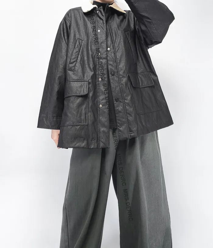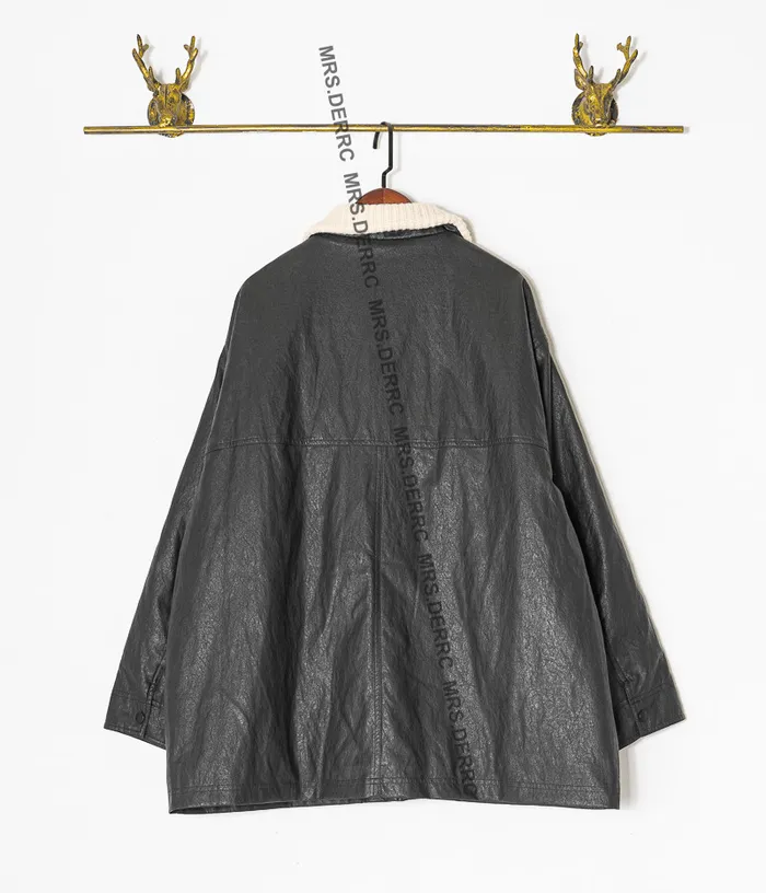 針織米白領鋪棉手揉感仿皮口袋外套(黑色)