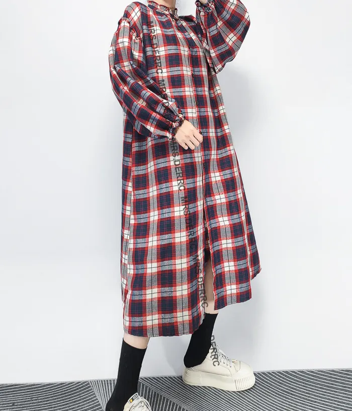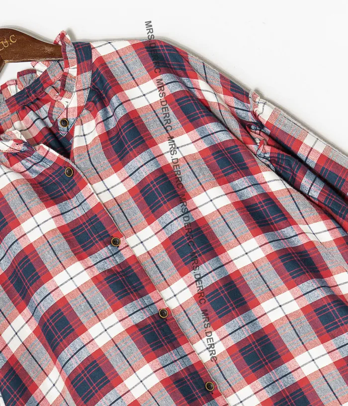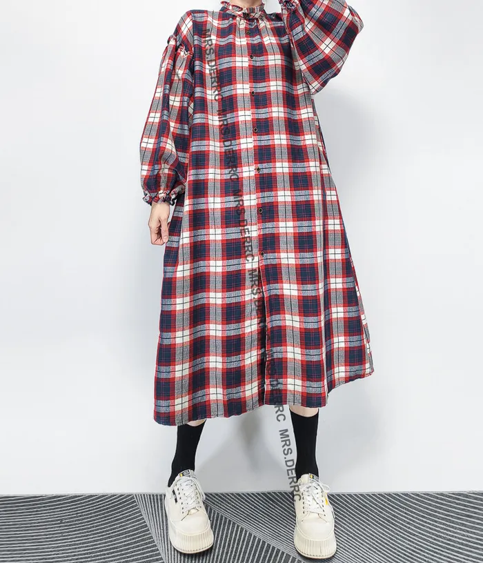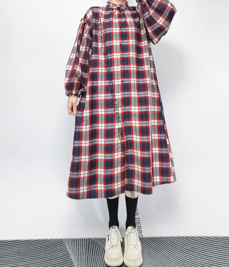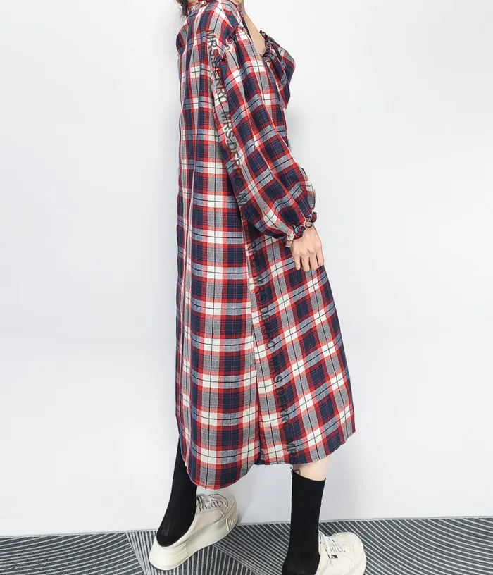 棉質格紋寬袖木耳領開釦口袋洋裝(紅藍格)