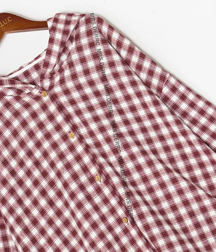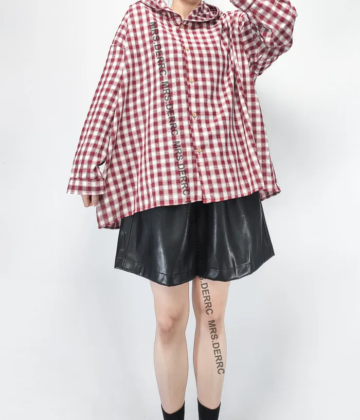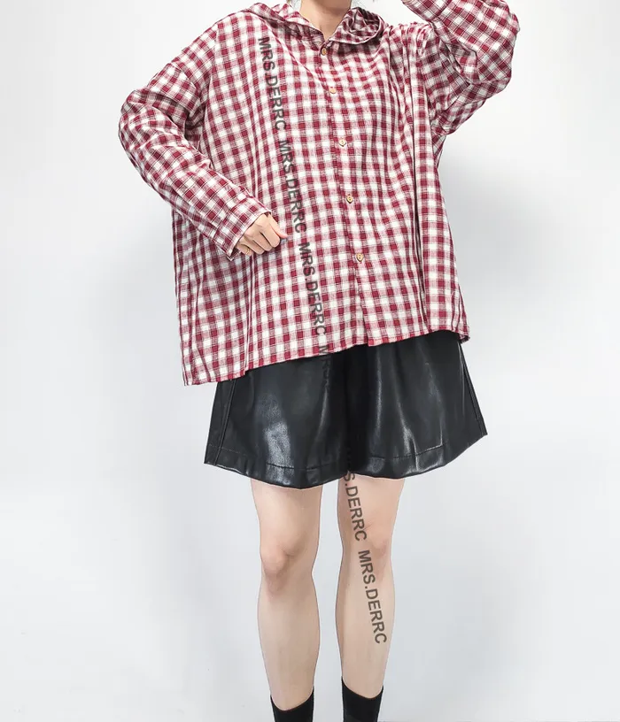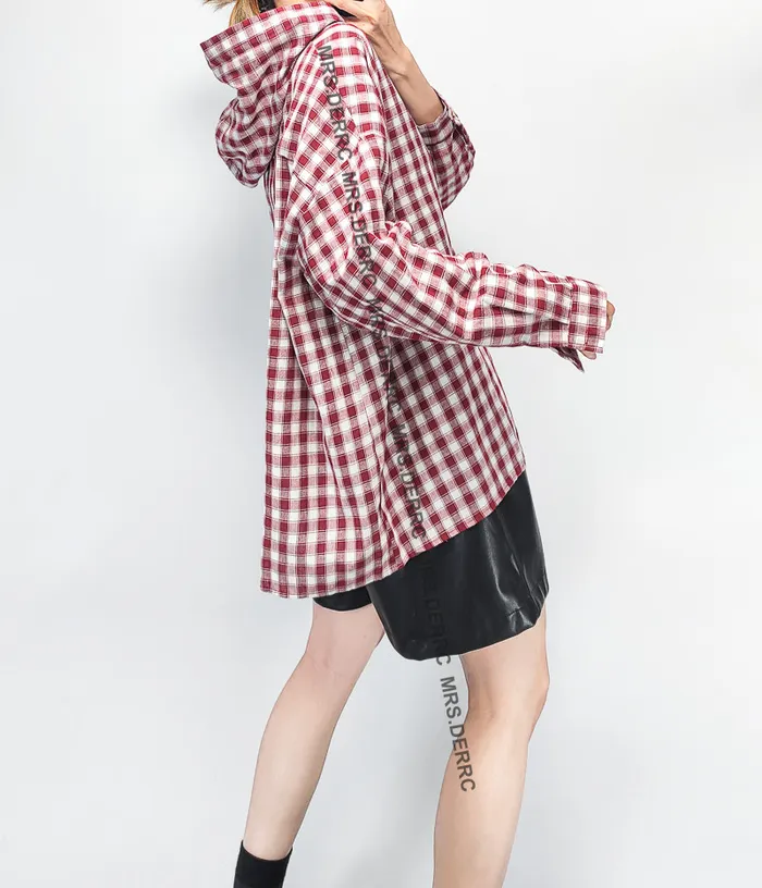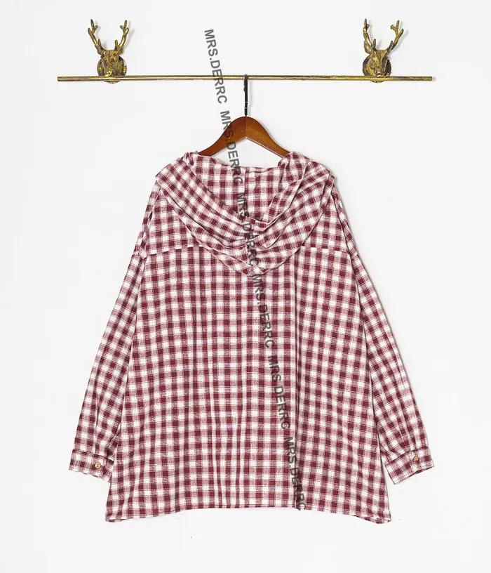 棉質連帽格紋開釦寬鬆上衣(紅格)