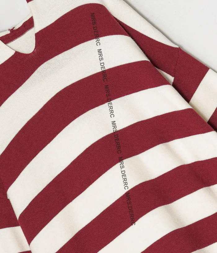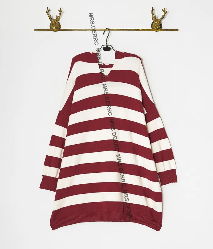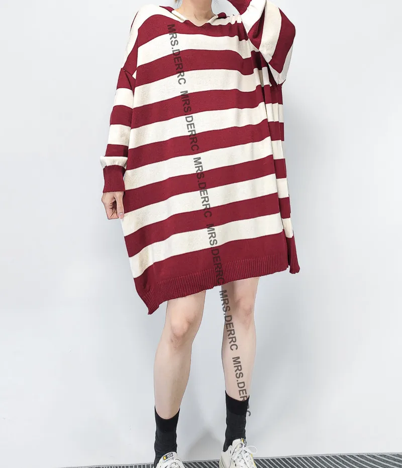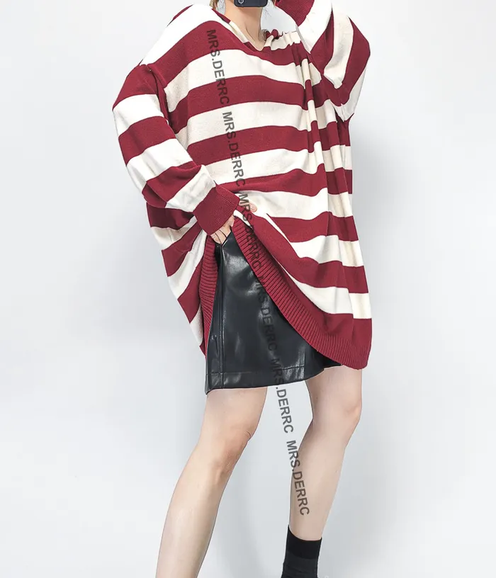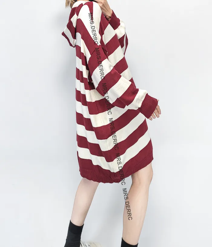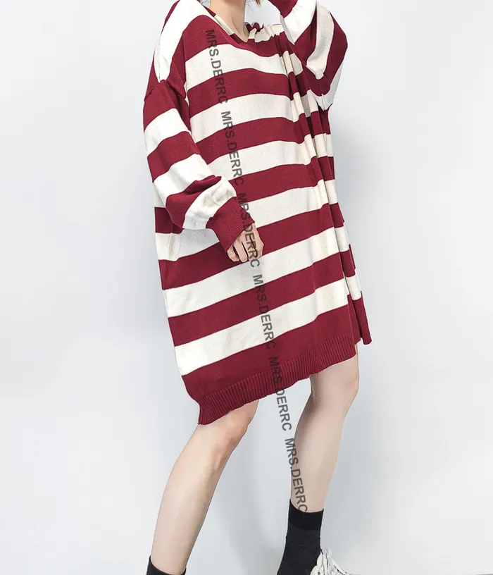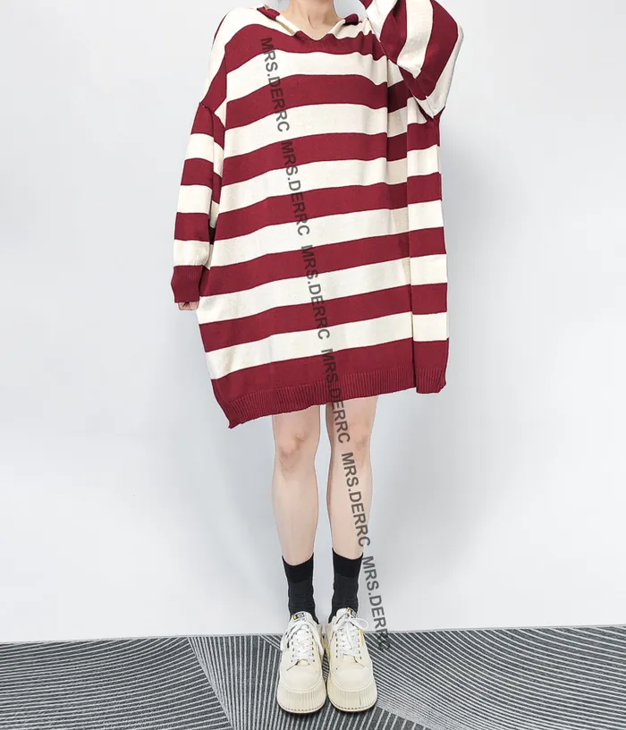 親膚針織連帽雙色條紋寬鬆長版上衣(紅條)