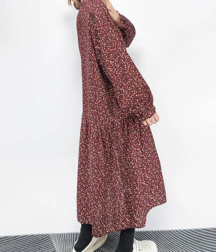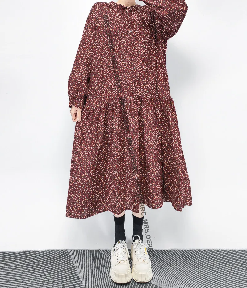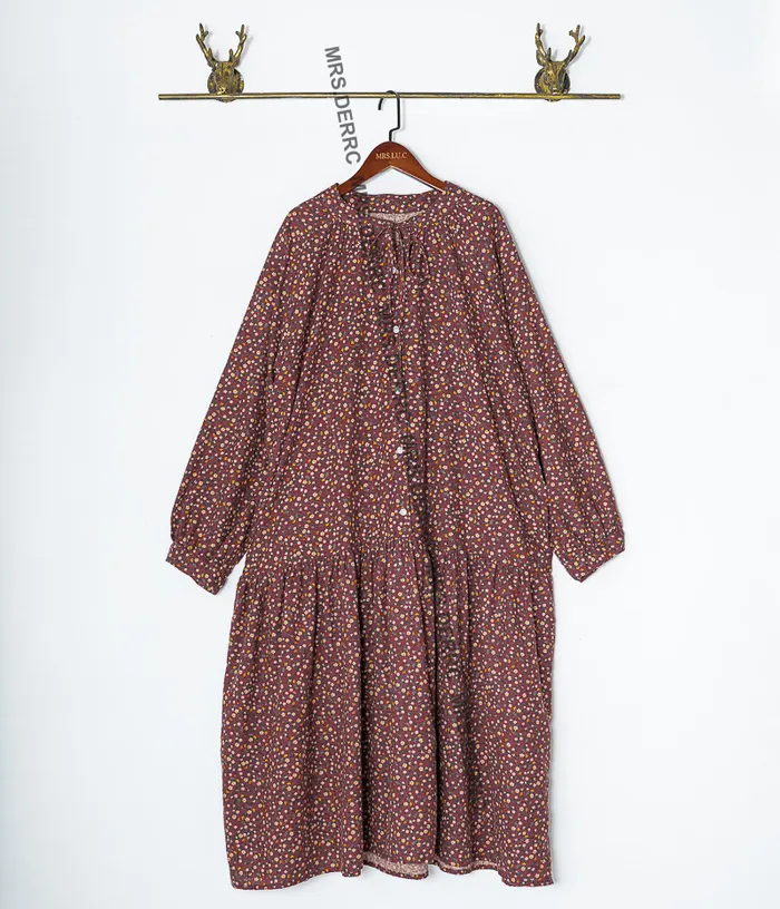 棉混紡水洗碎花領綁帶半開釦口袋洋裝