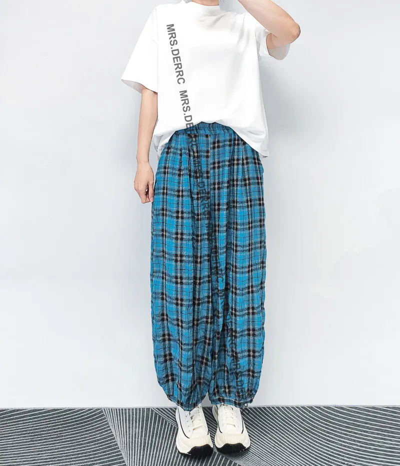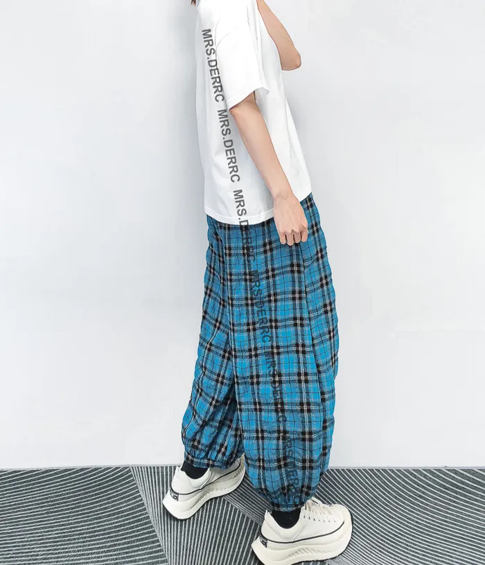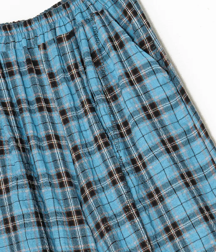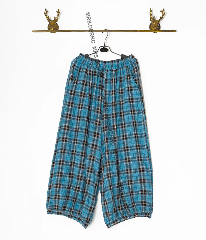 棉混紡微皺格紋鬆緊口袋褲(藍格)