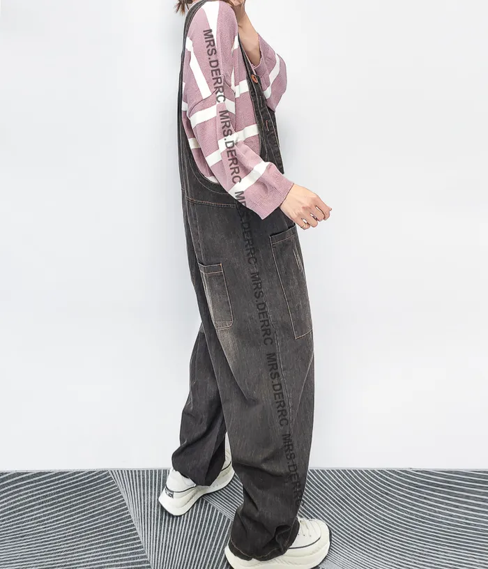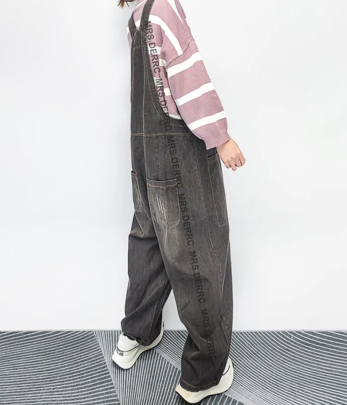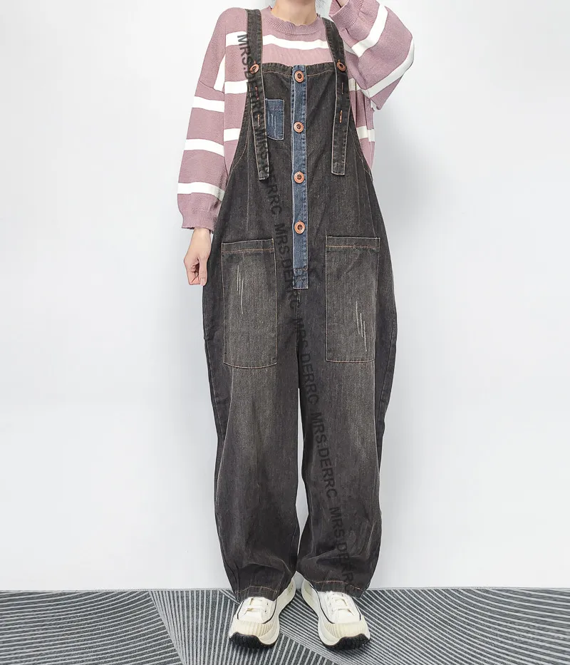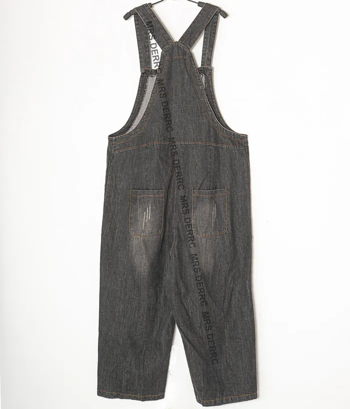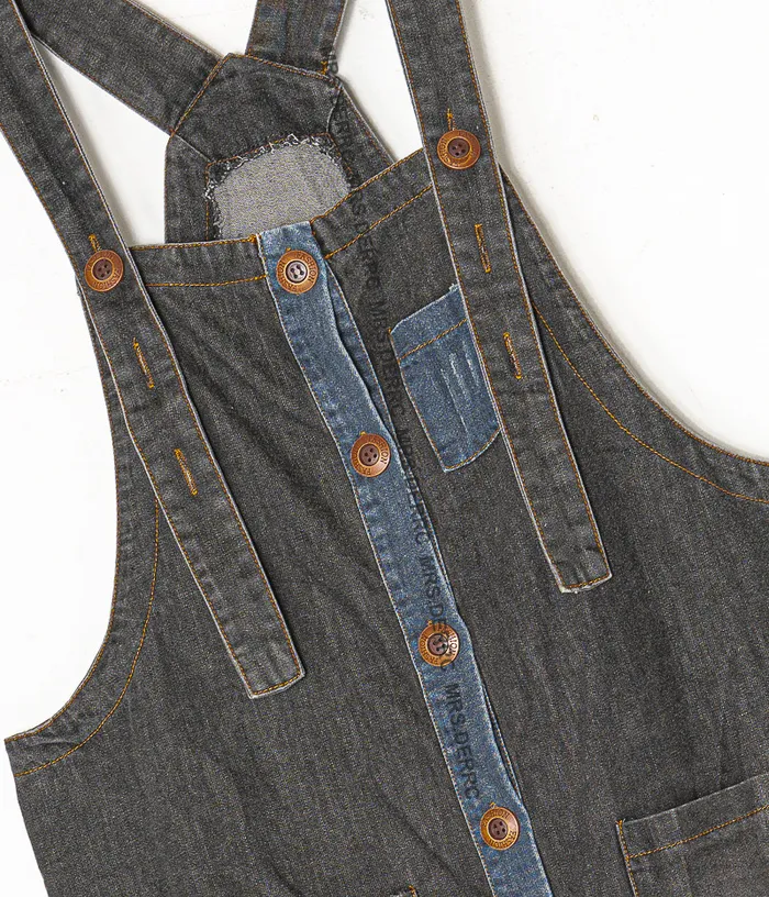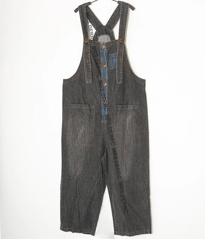 水洗牛仔拼布吊帶口袋褲(灰黑)