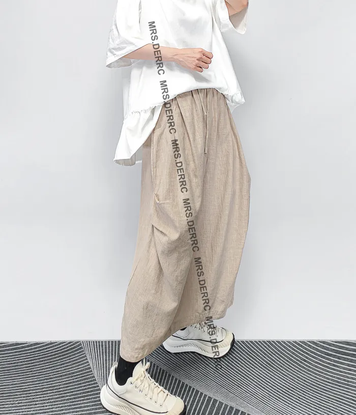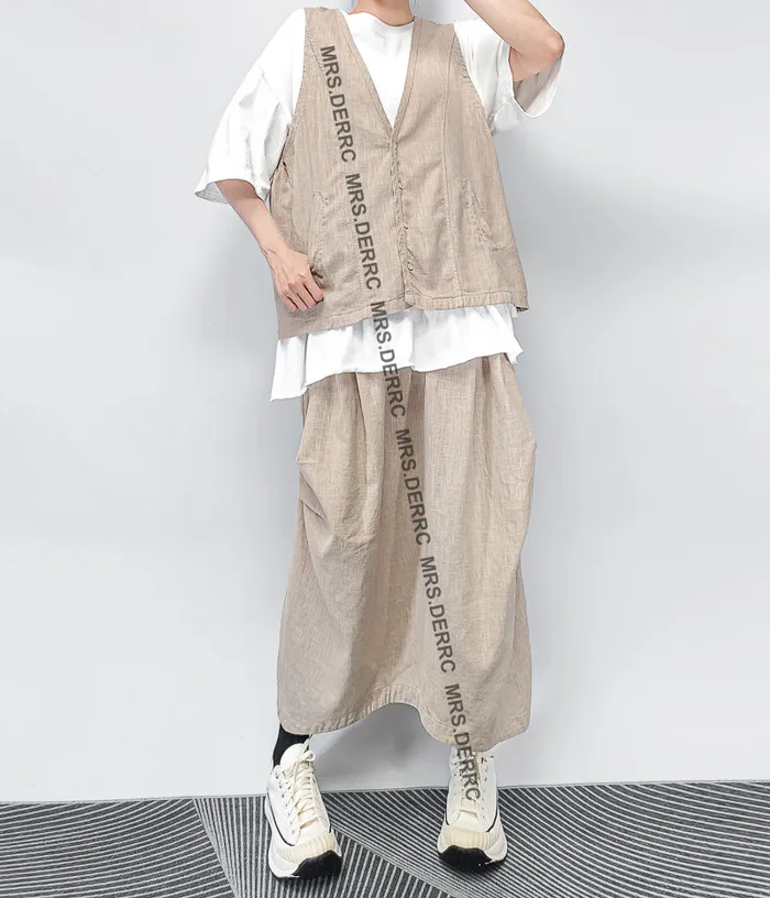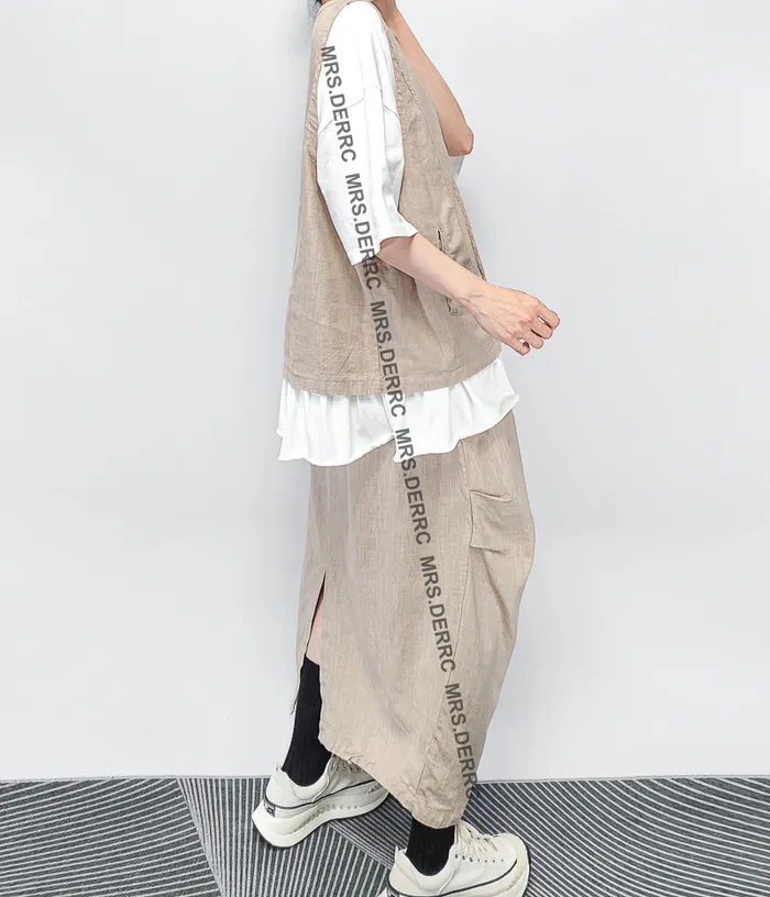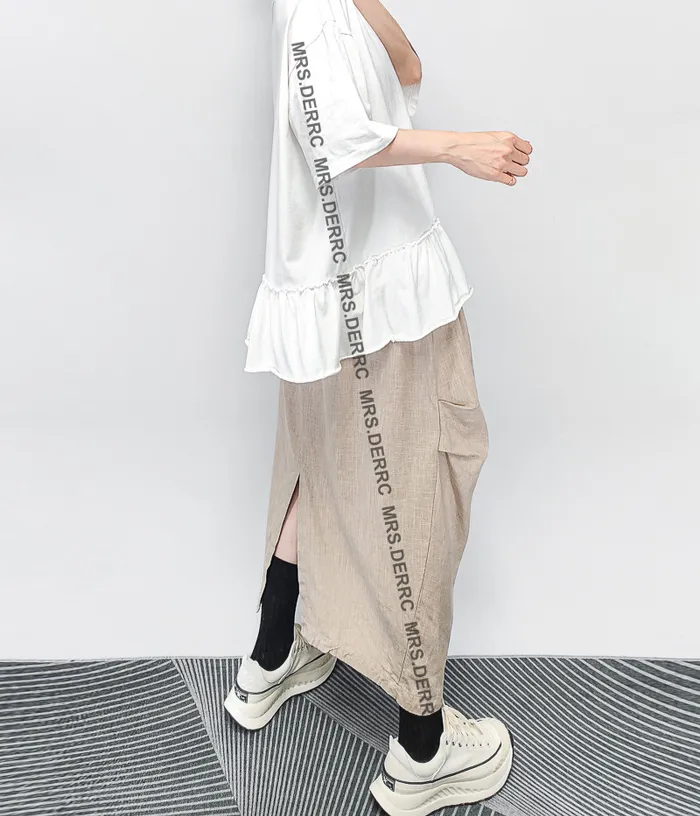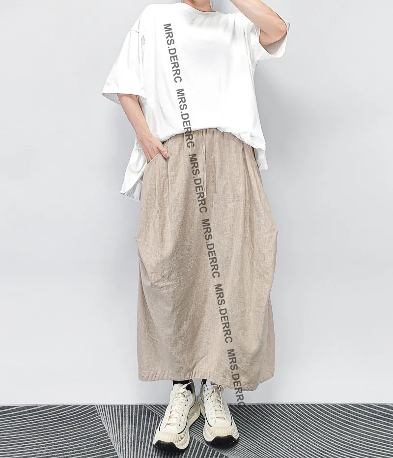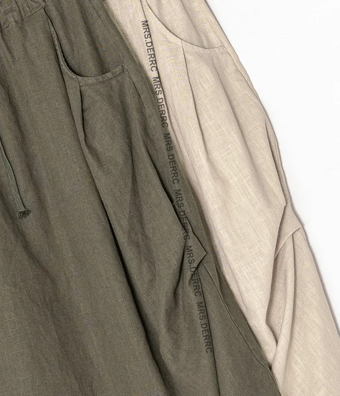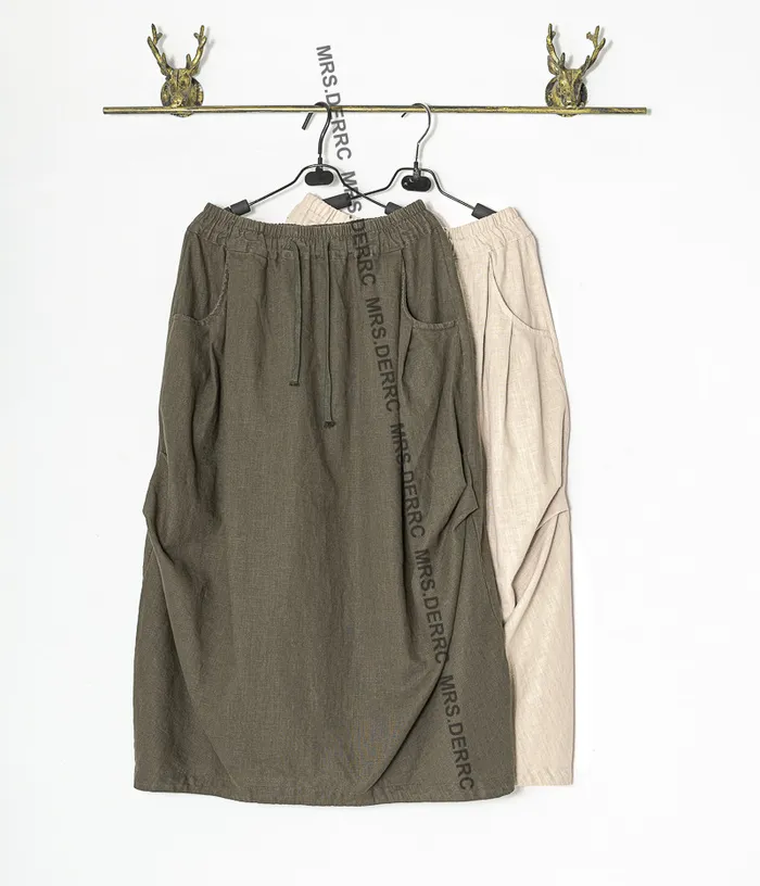 棉麻鬆緊抽繩側抓皺後開岔口袋裙(淺卡其)