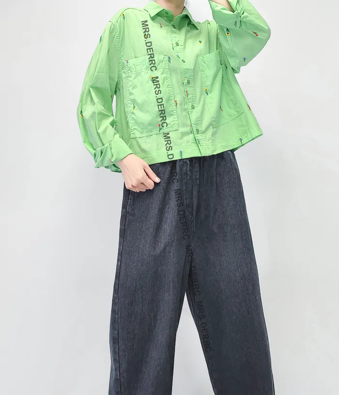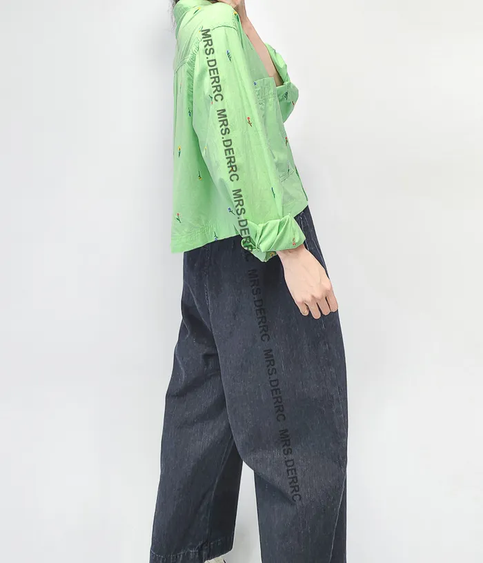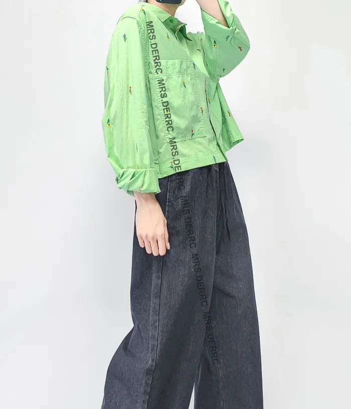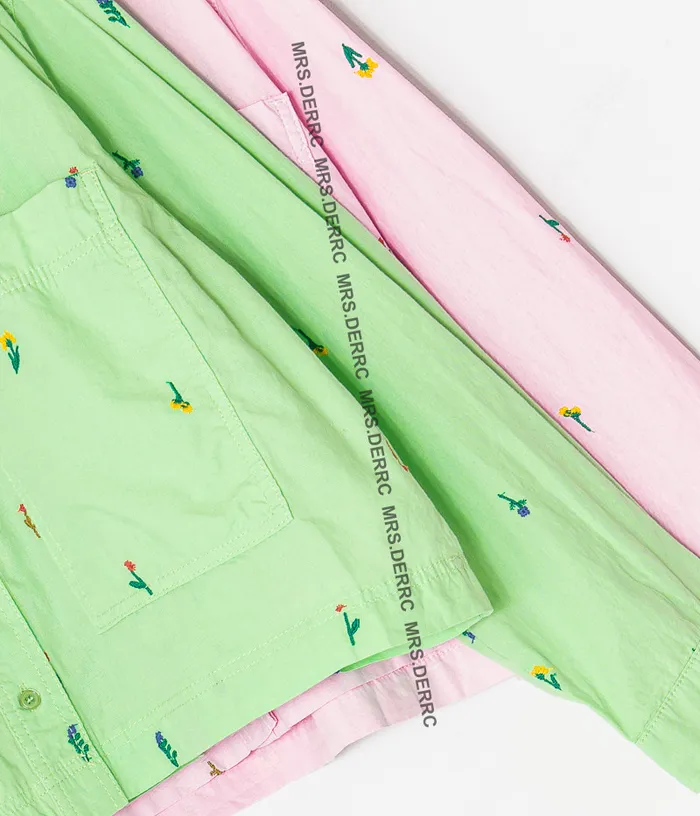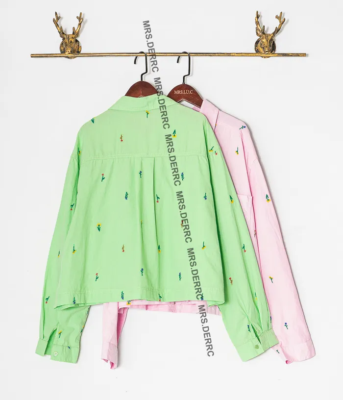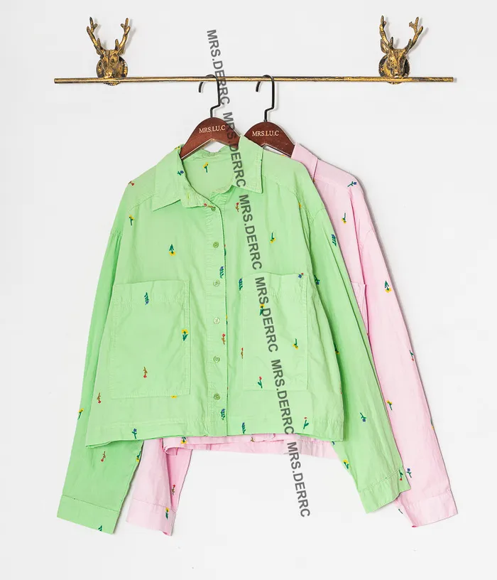 棉質刺繡小花短版大口袋襯衫(綠色)