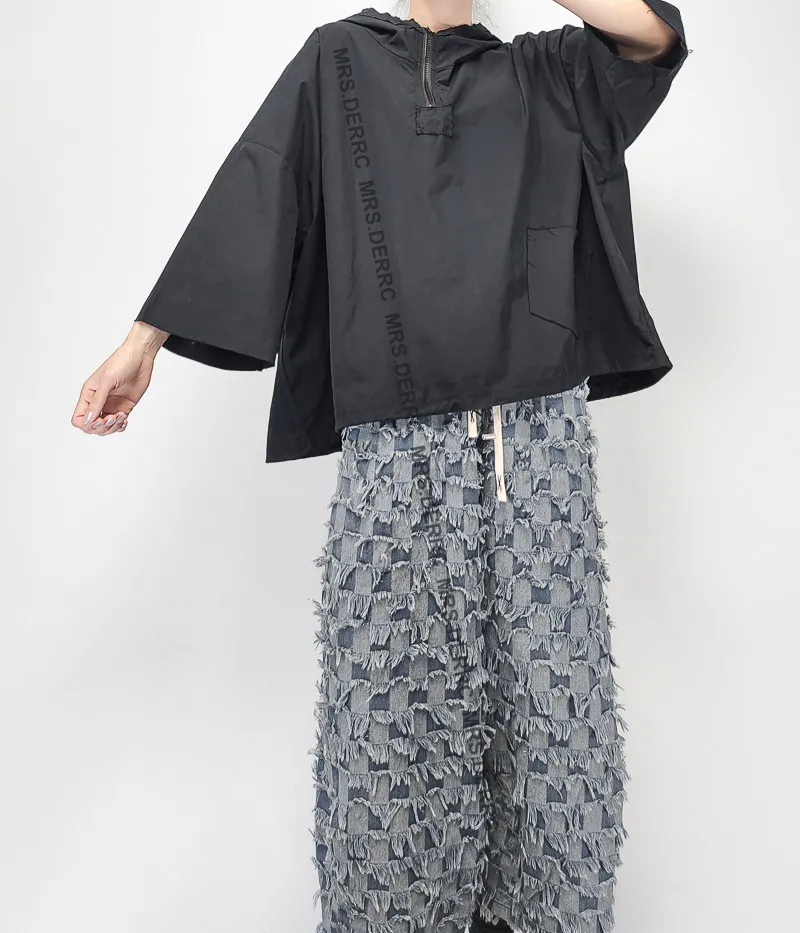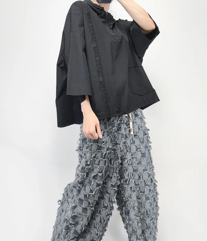 棉混紡不收邊連帽半拉鍊寬鬆口袋上衣(黑色)