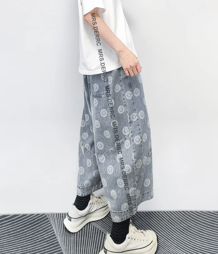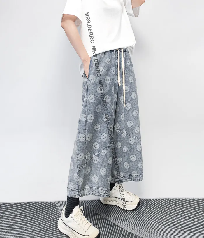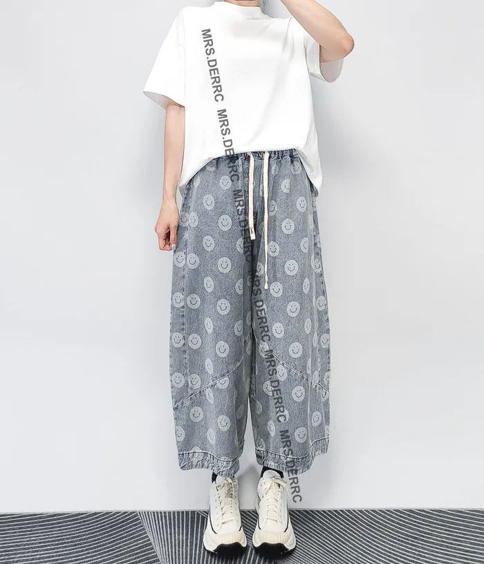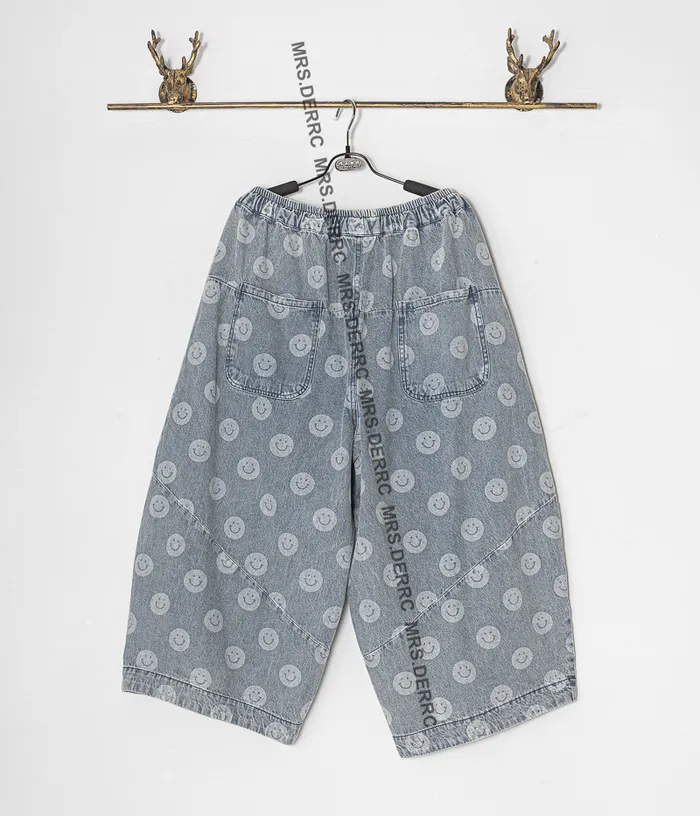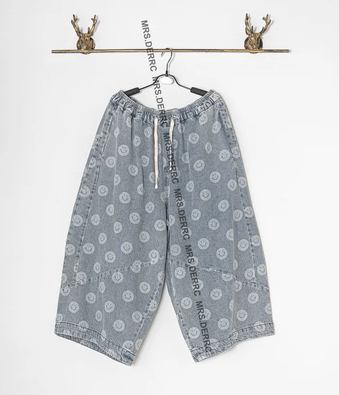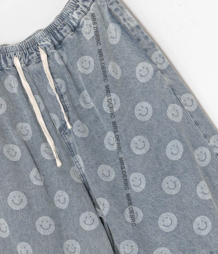 水洗牛仔笑臉抽繩口袋褲