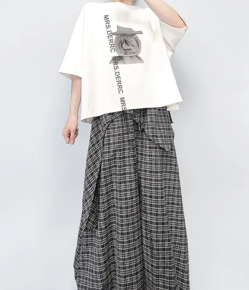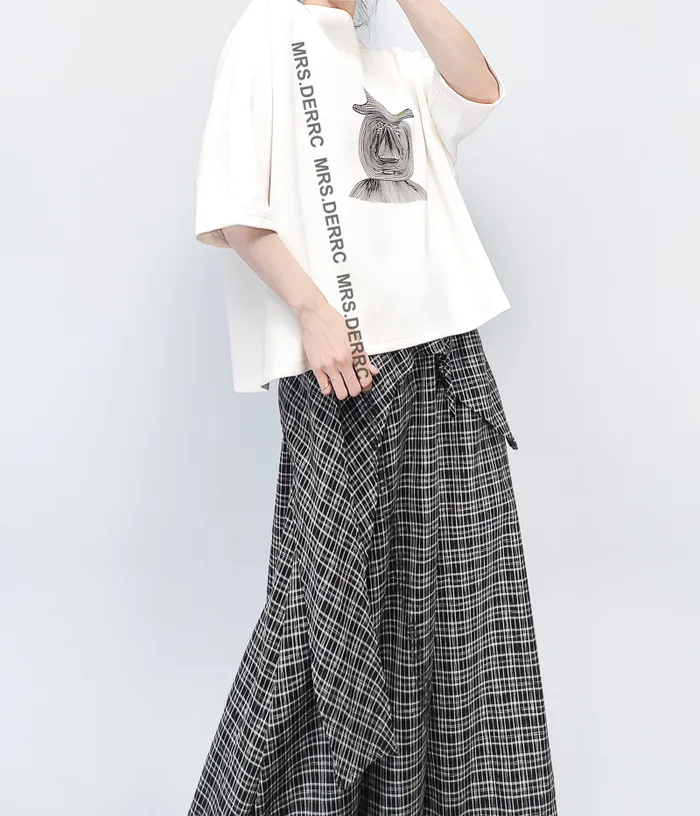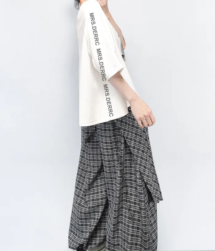 棉混紡不對稱拼布格紋雙層口袋褲(黑格)