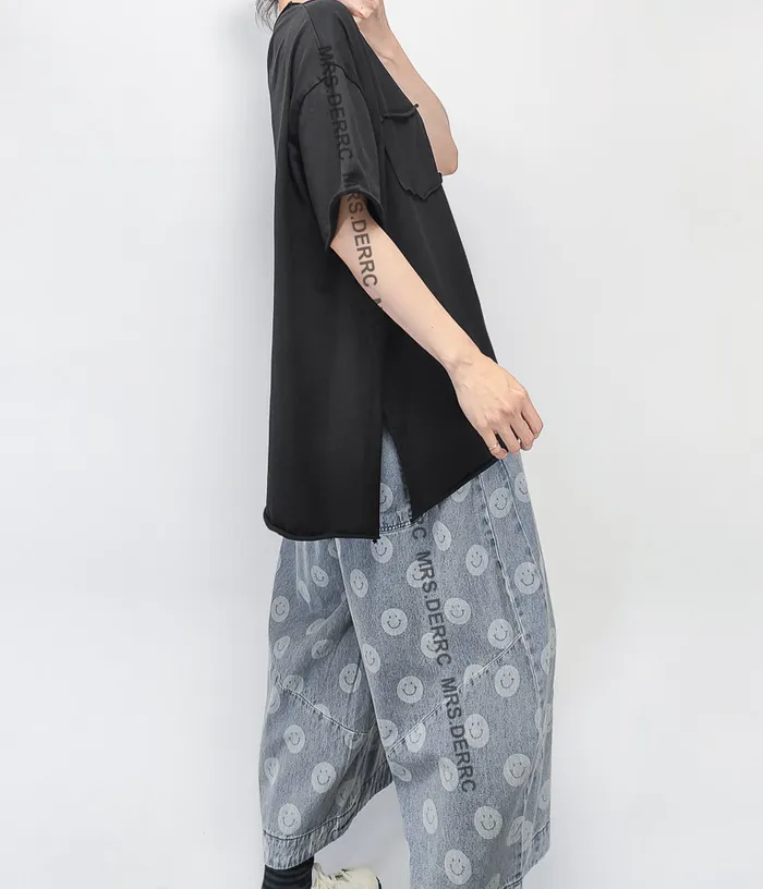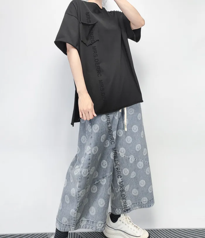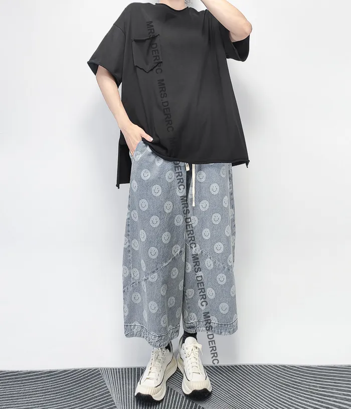 水洗牛仔笑臉抽繩口袋褲