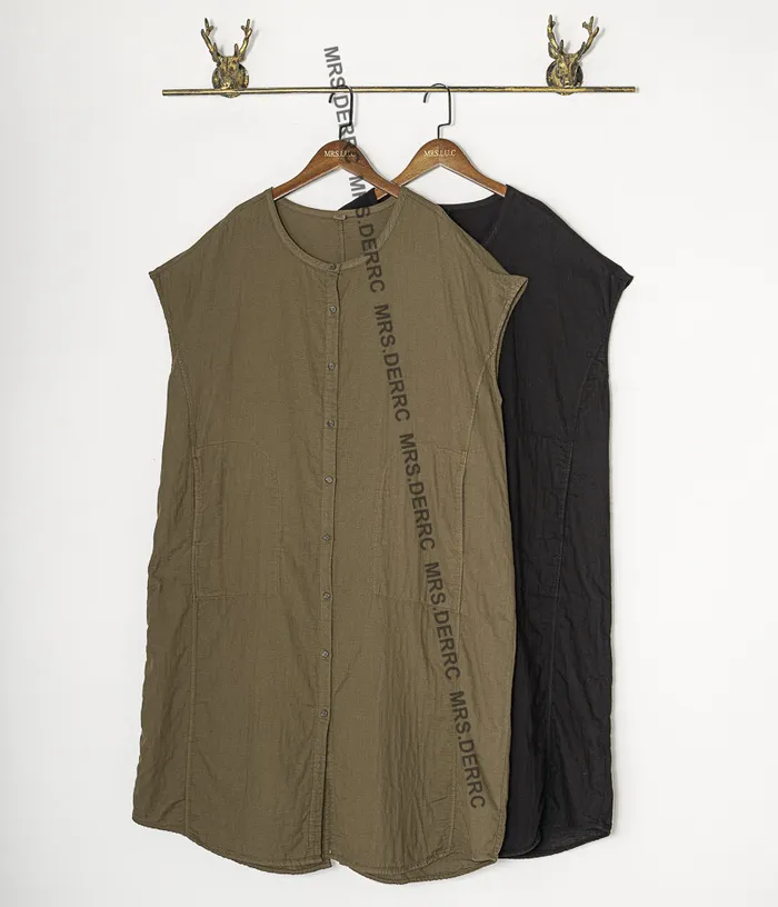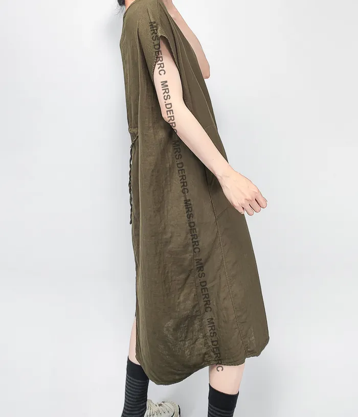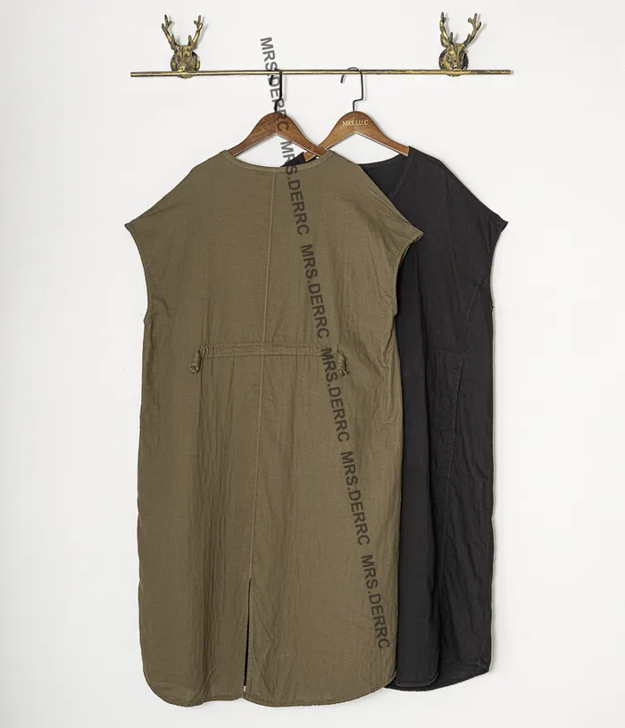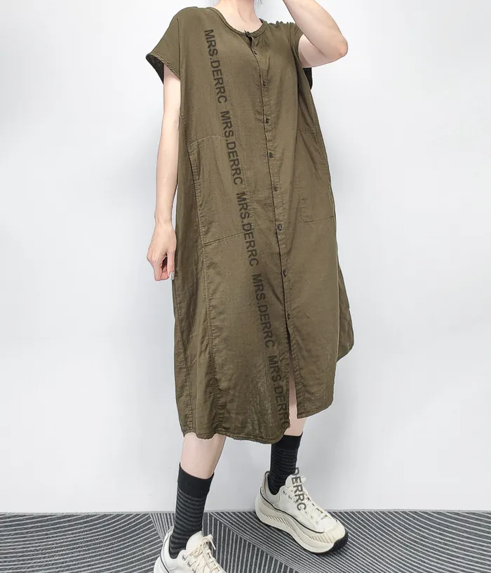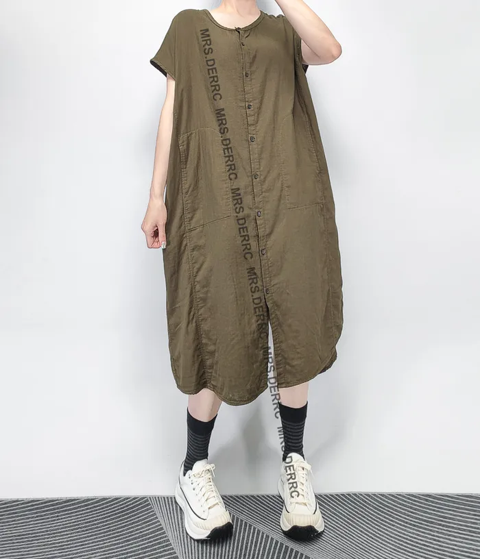 棉質包肩後開岔開釦口袋洋裝(咖綠)