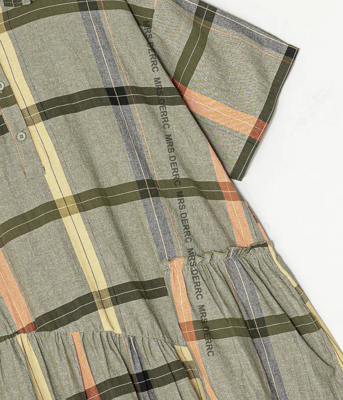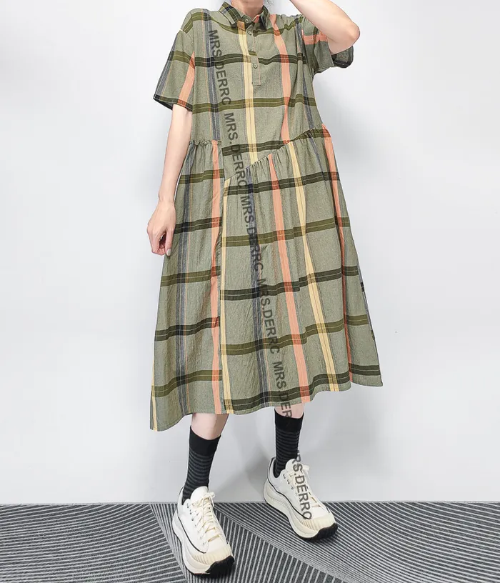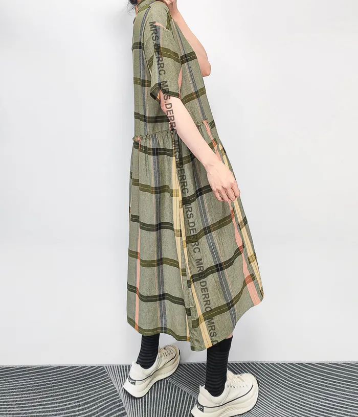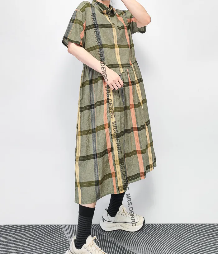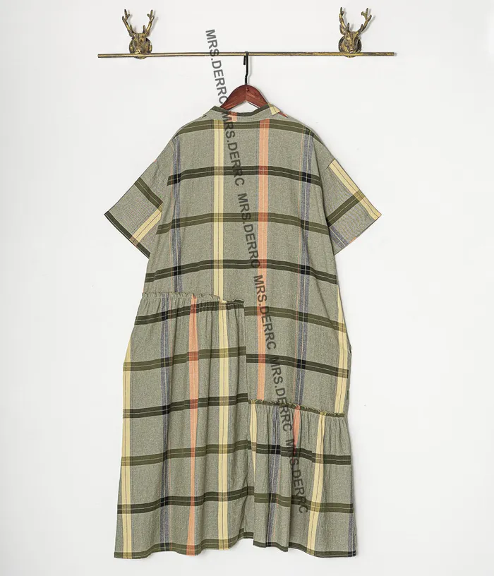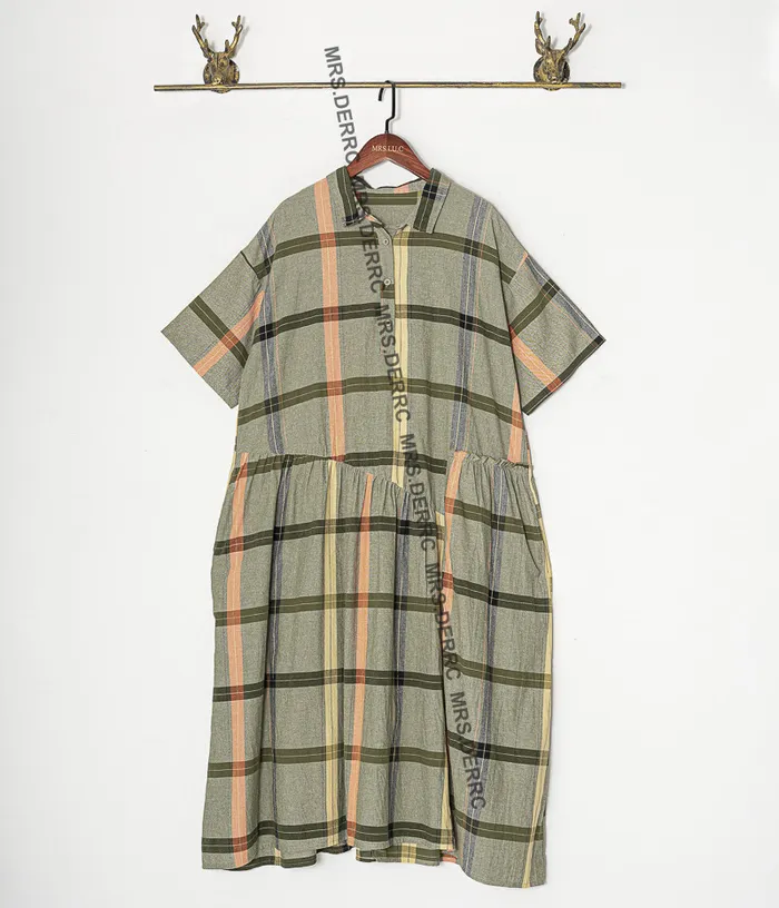 棉質半開釦拚接格紋口袋洋裝(綠色)