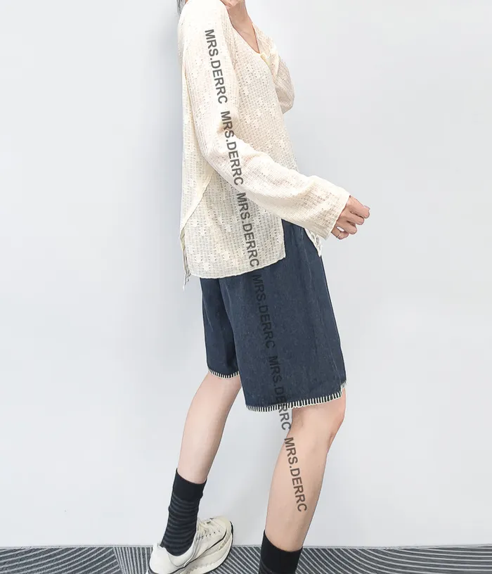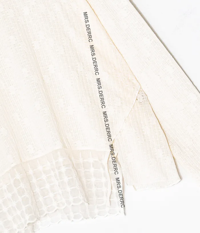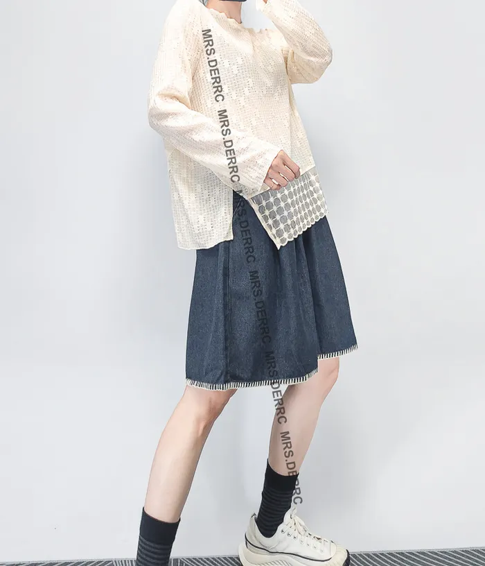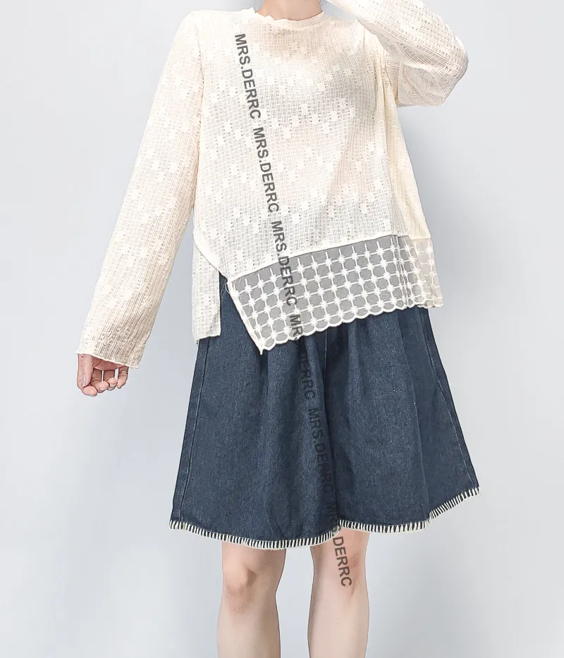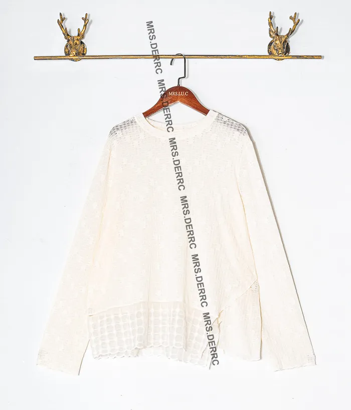 棉質微透簍空拼接下襬氣質上衣(杏色)