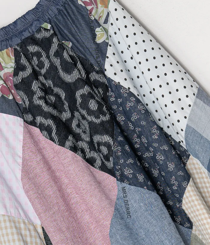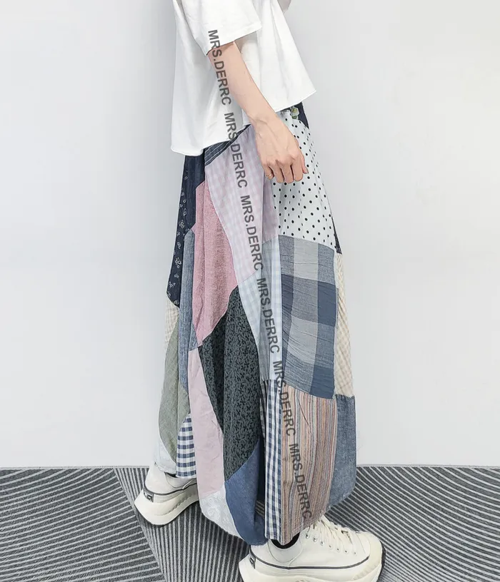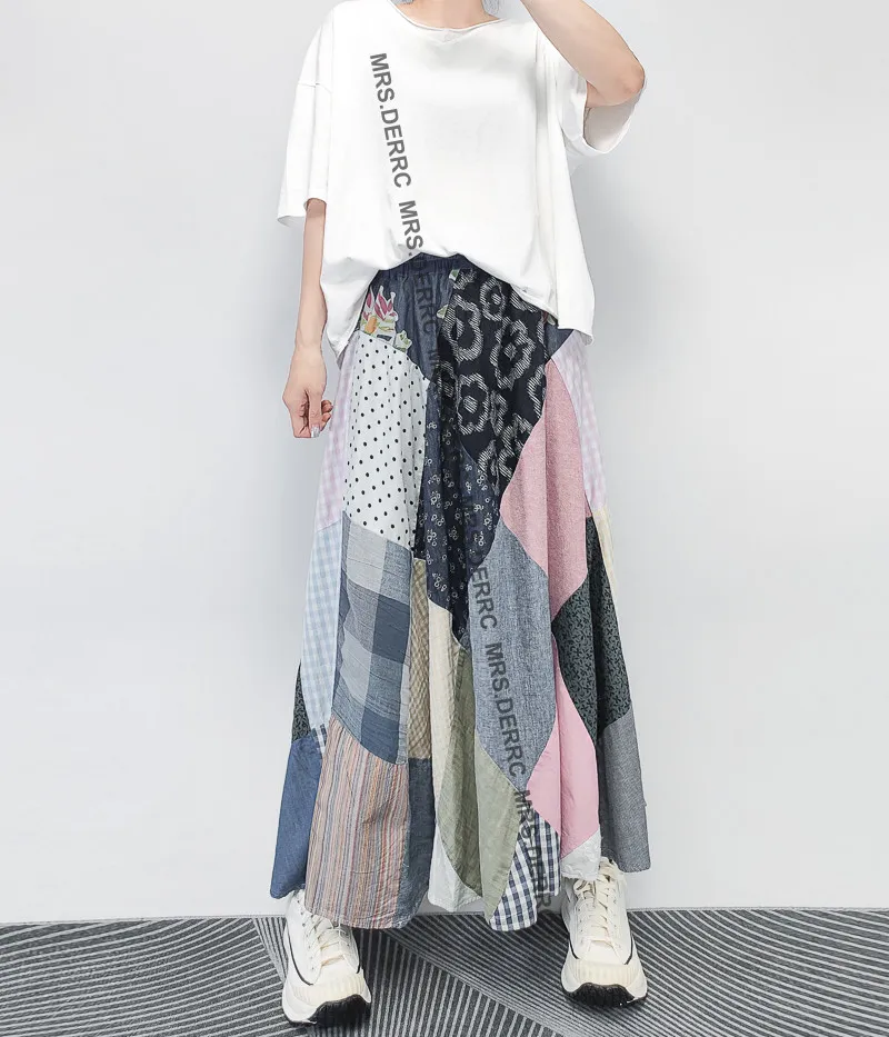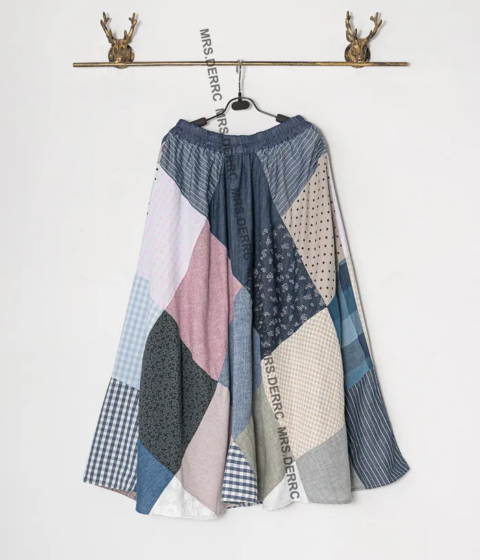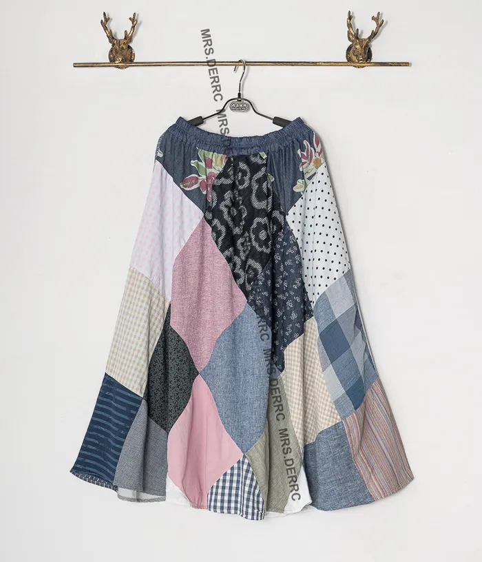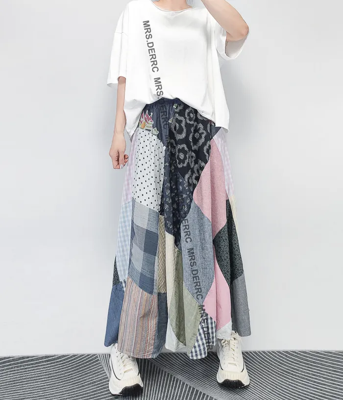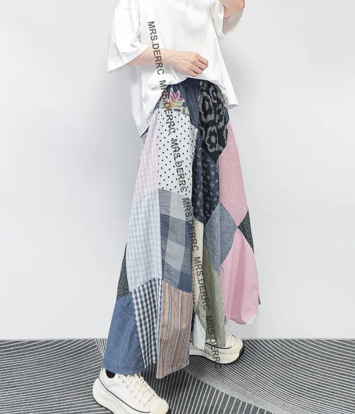 麻料格紋點點拼布鬆緊腰大裙襬裙