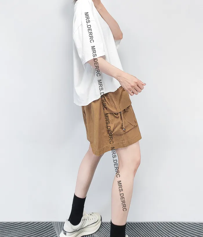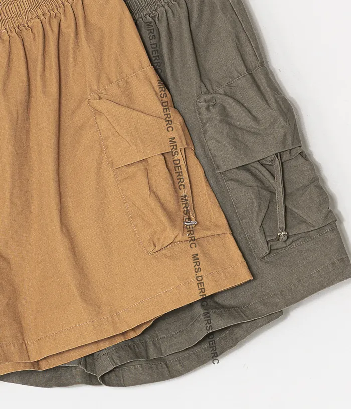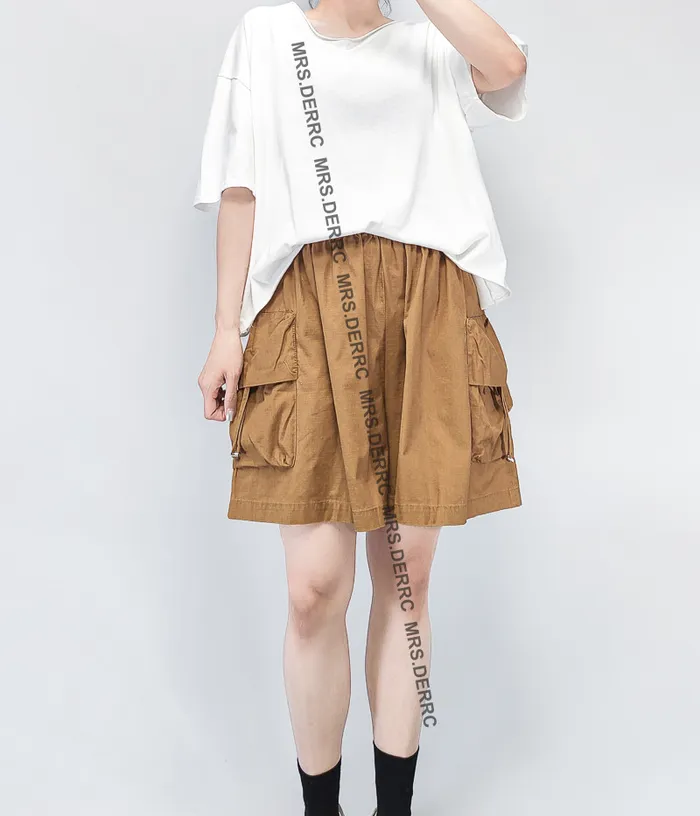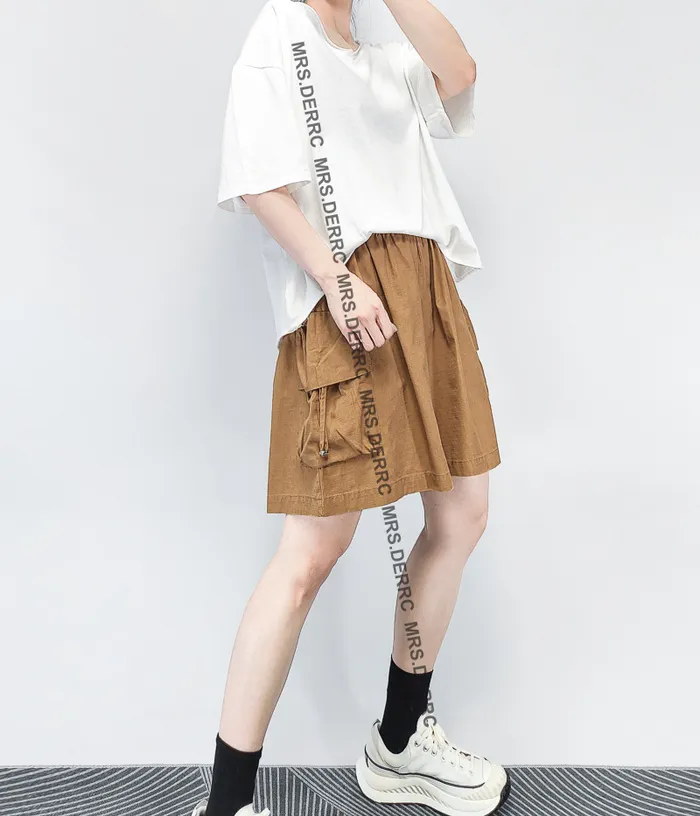 棉混紡隱約格紋抽繩口袋傘狀短褲(咖色)