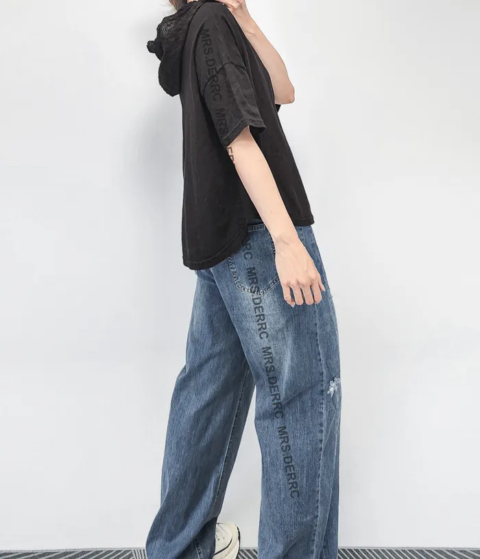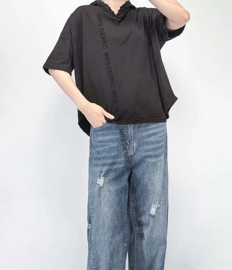 棉質簍空蕾絲拼接連帽上衣(黑色)