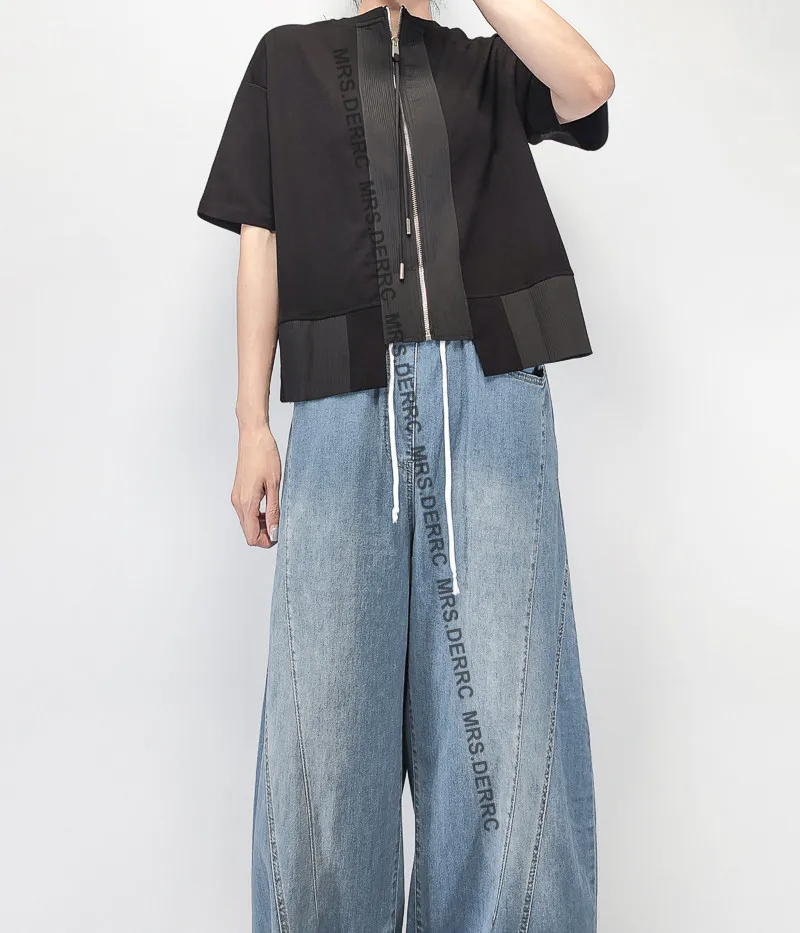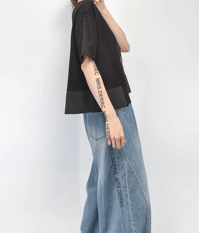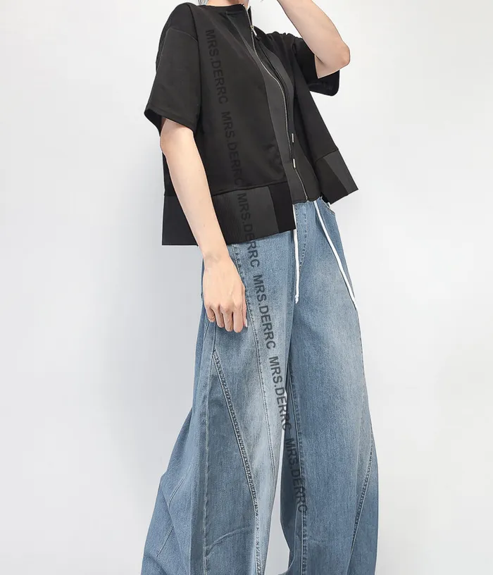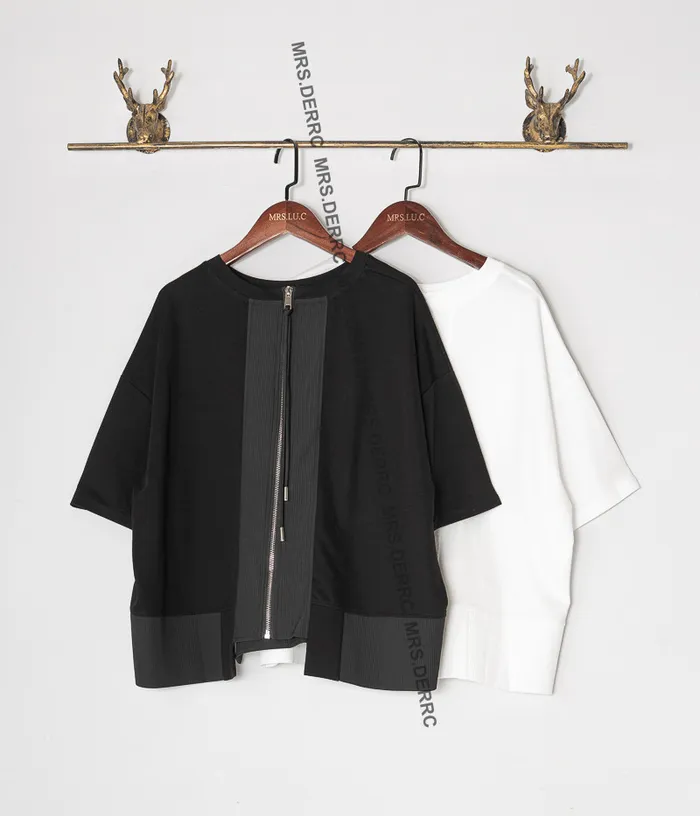 棉混紡兩面穿拉鍊坑條拚接下擺上衣(黑色)