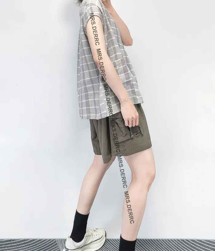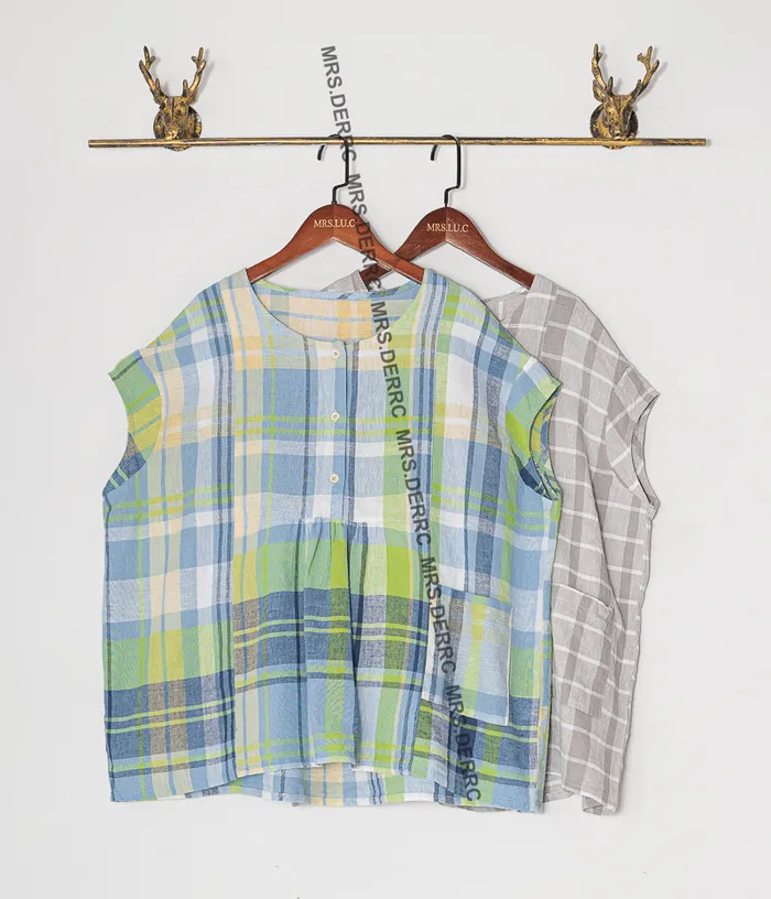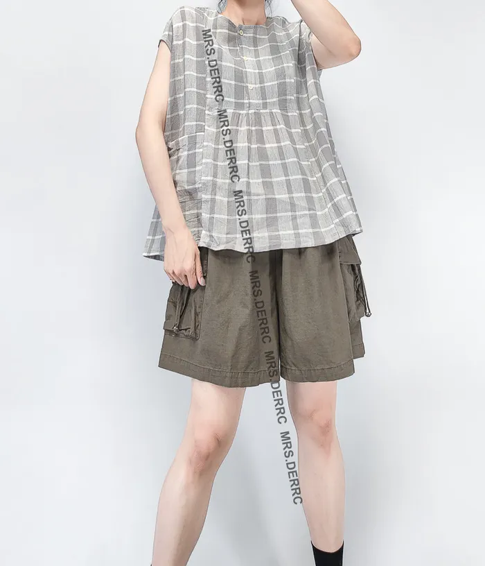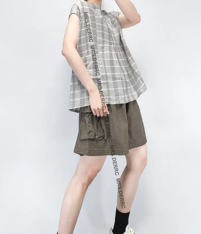 棉麻包肩半開釦格紋小口袋上衣(灰格)