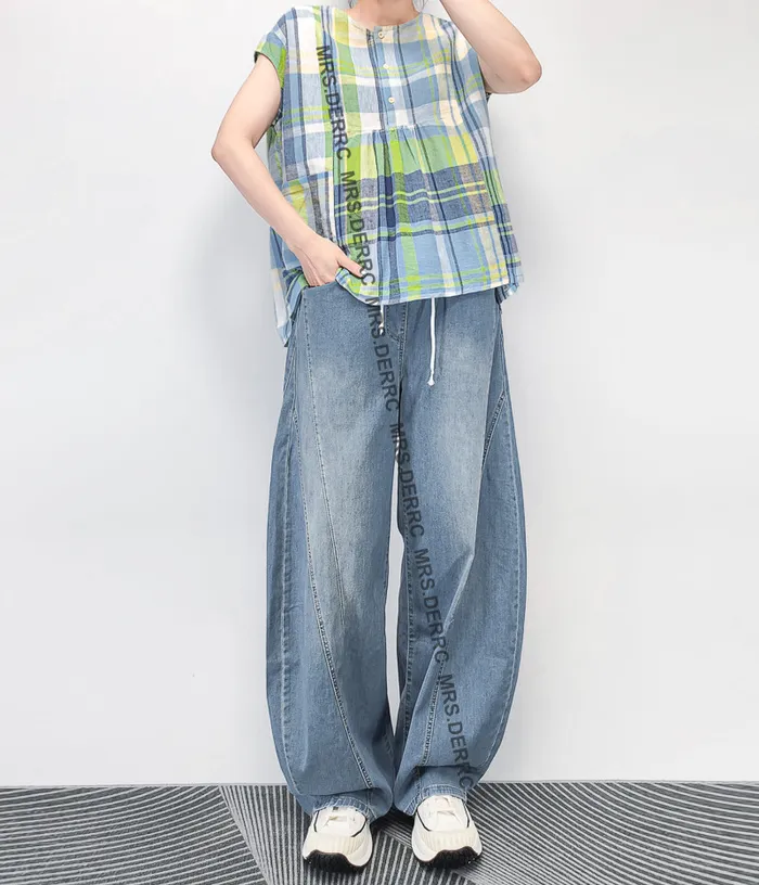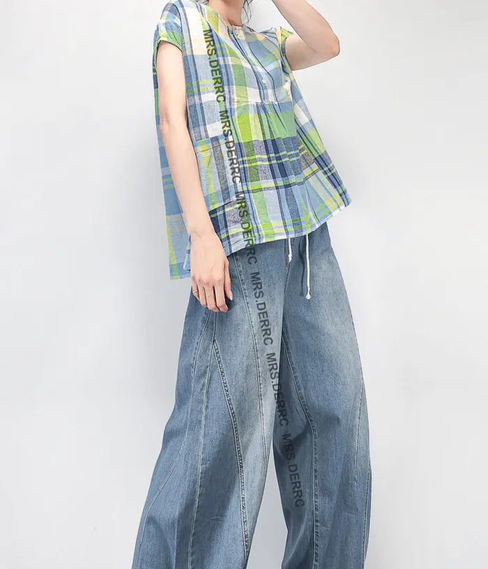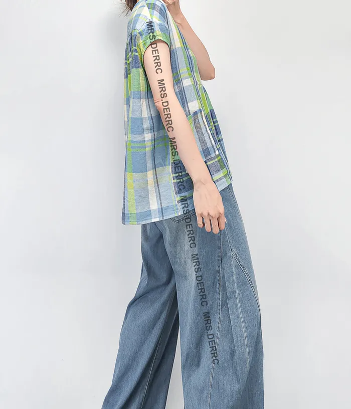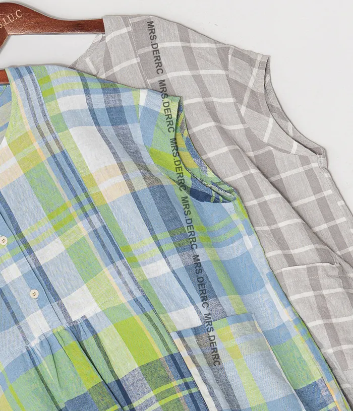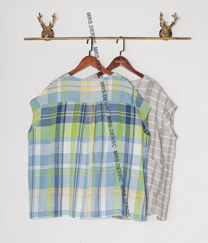 棉麻包肩半開釦格紋小口袋上衣(黃綠格)