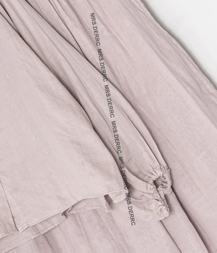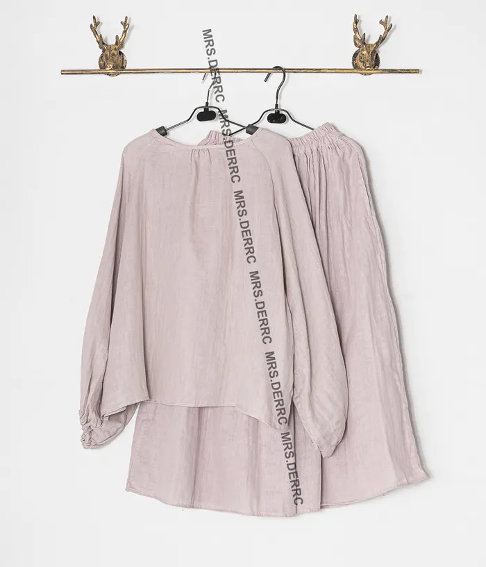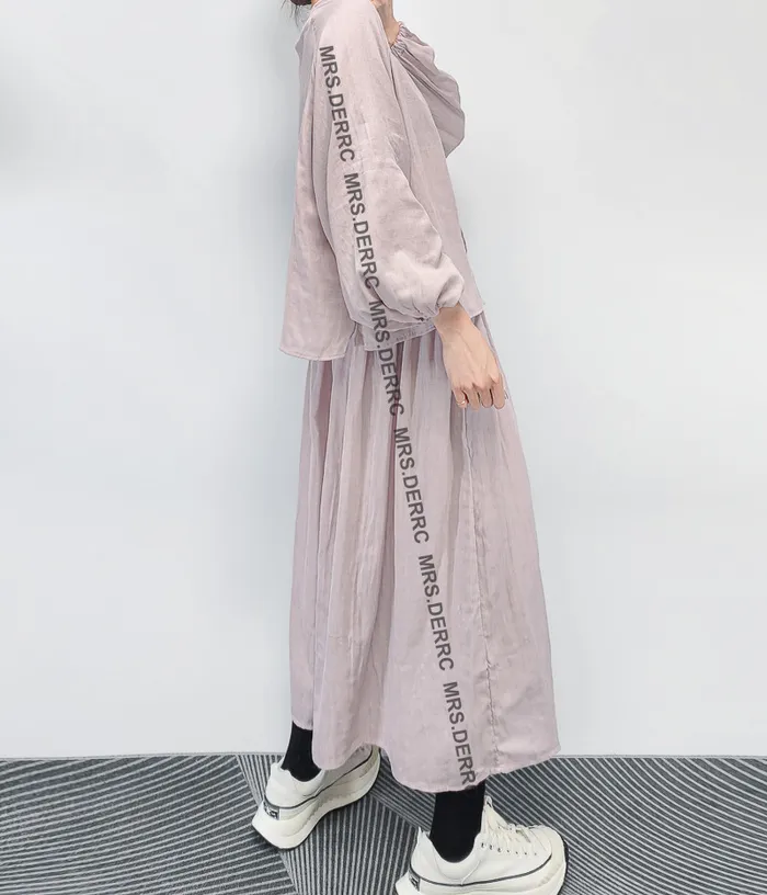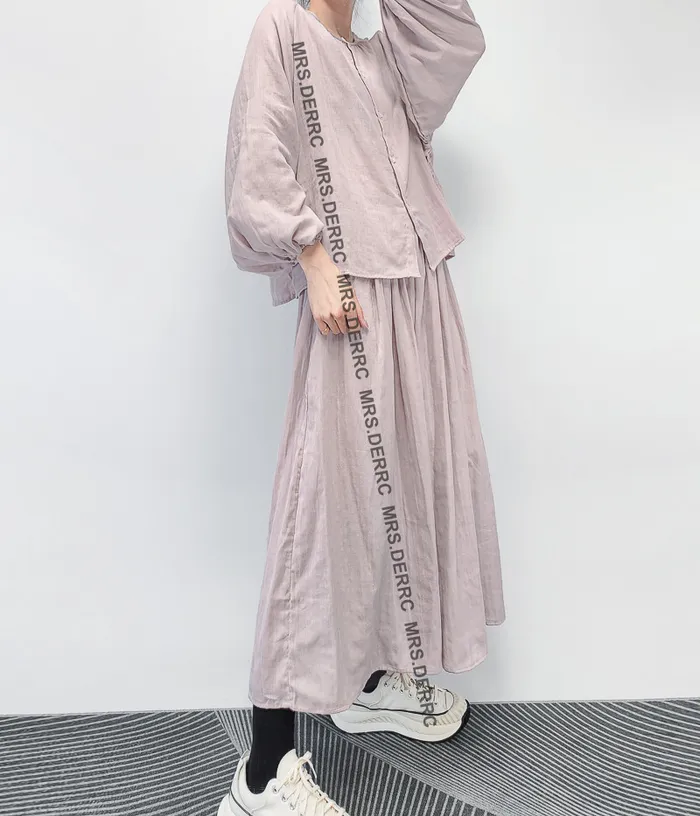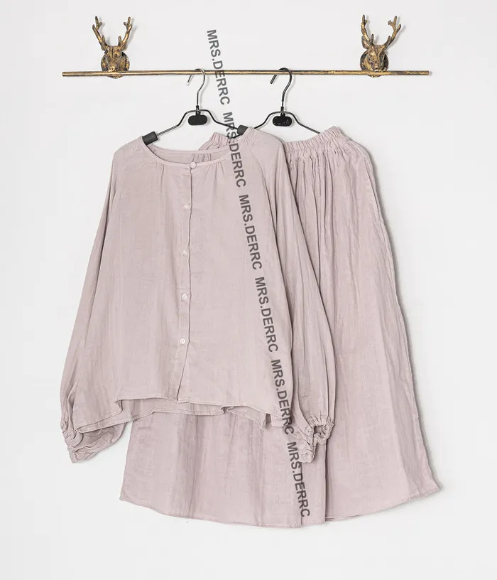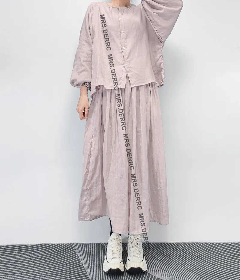 棉混紡微皺開釦寬袖上衣+鬆緊飄飄裙(藕粉)