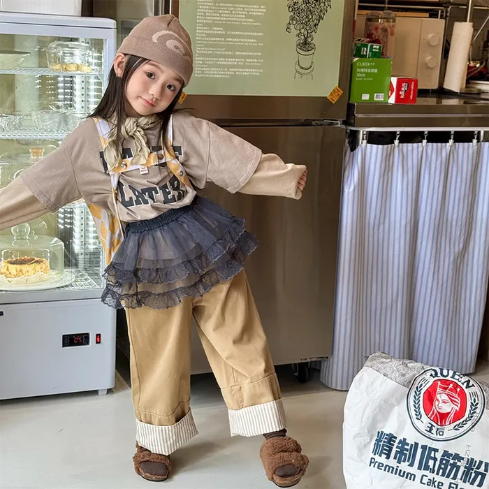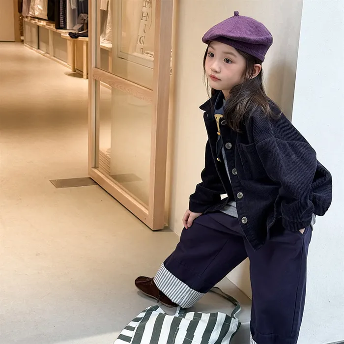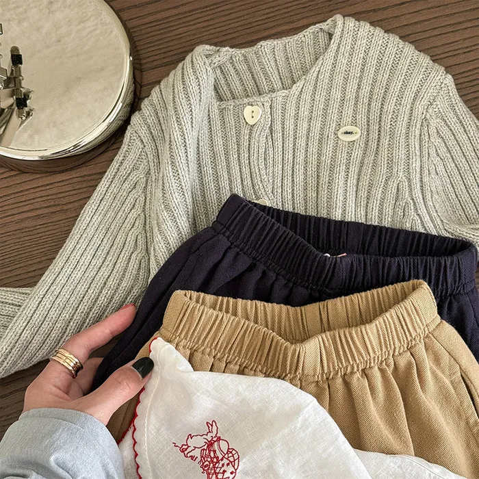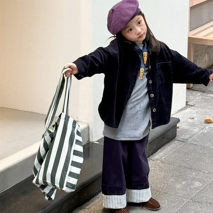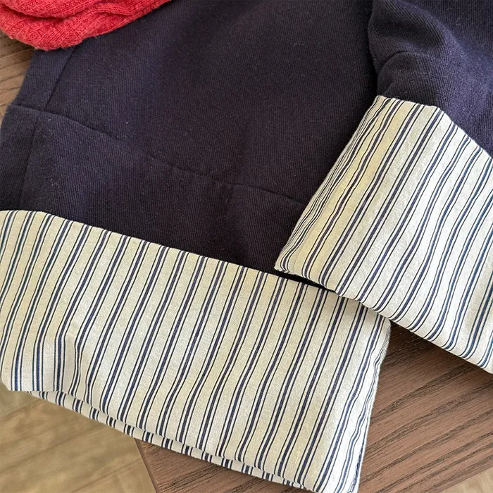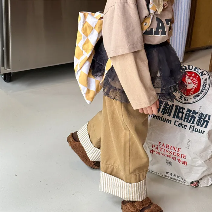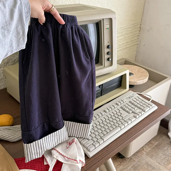 棉質褲腳拚直條反摺鬆緊口袋褲