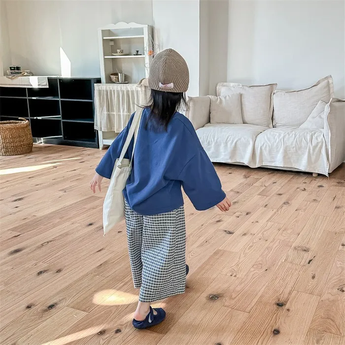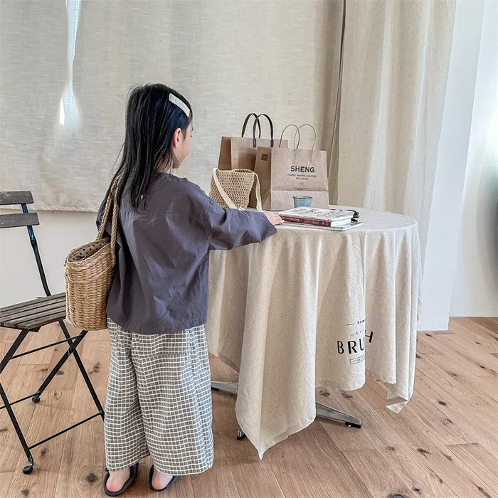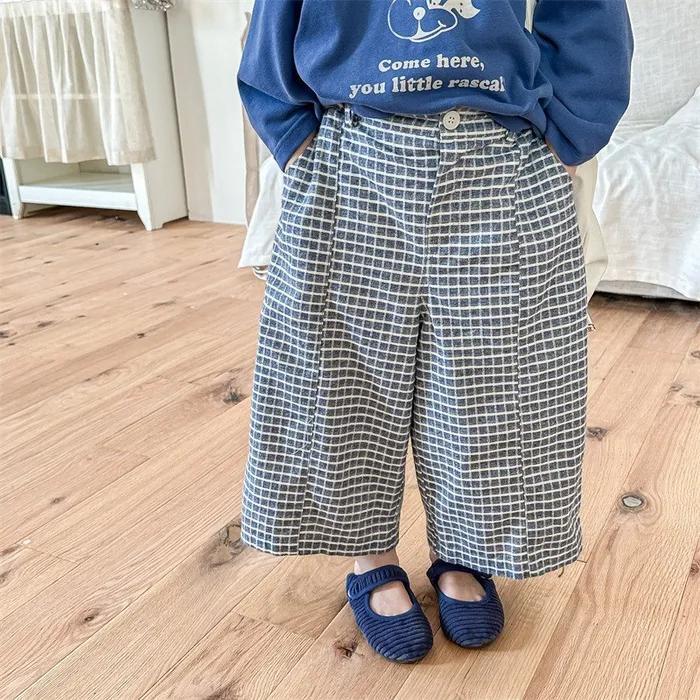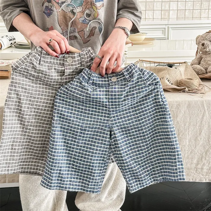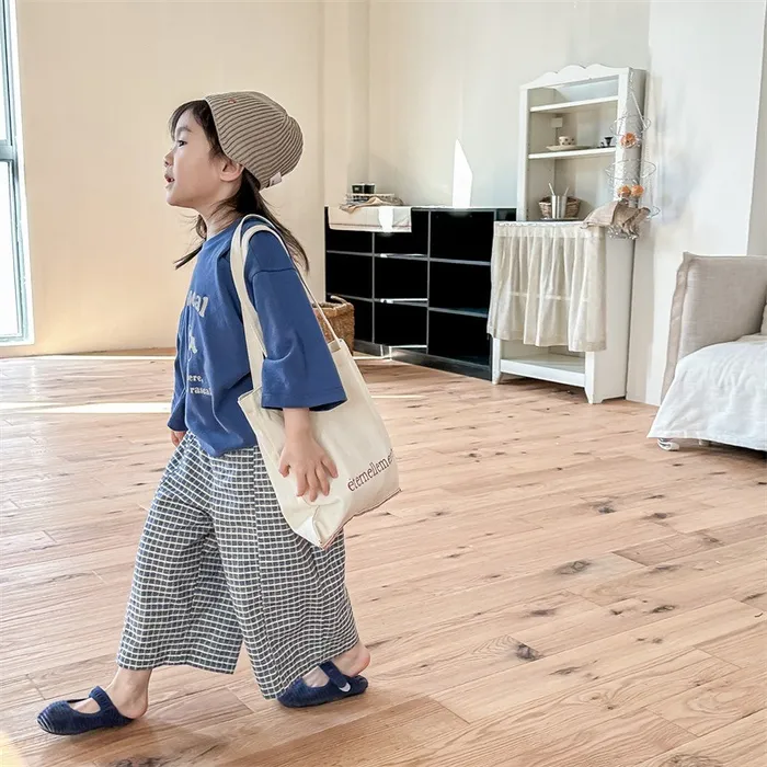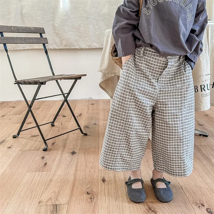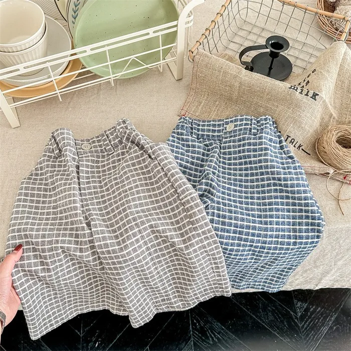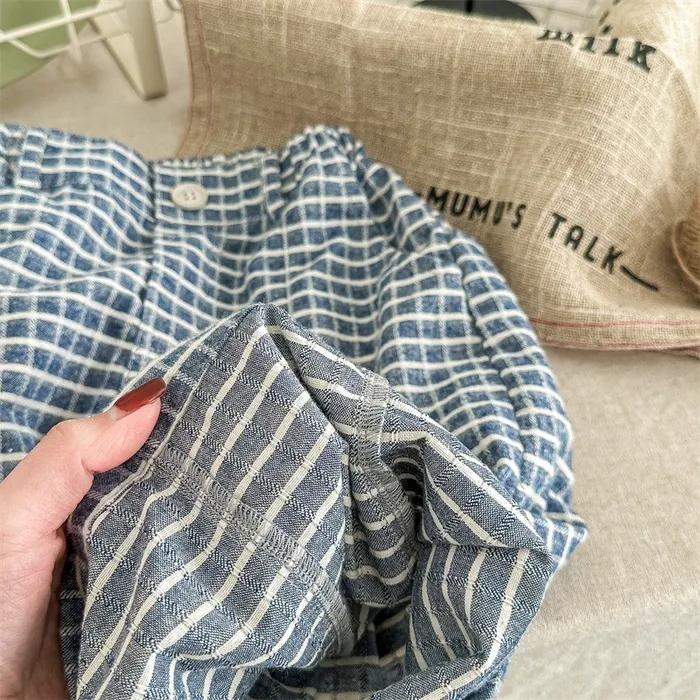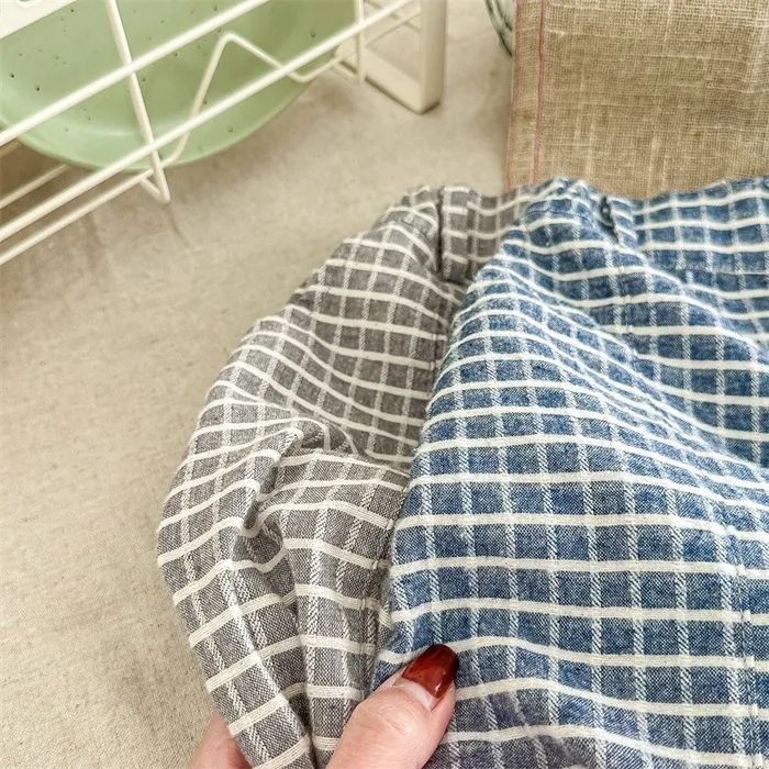 棉質水洗格紋鬆緊腰口袋長褲
