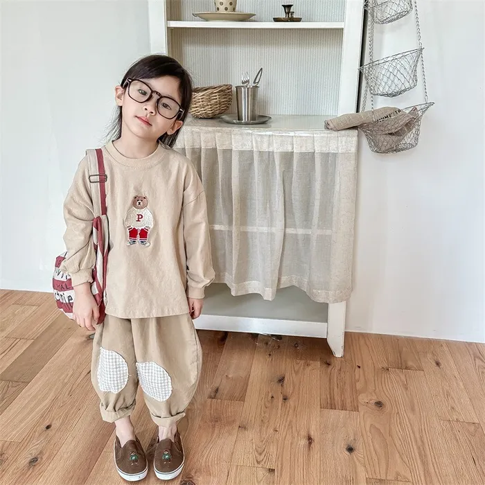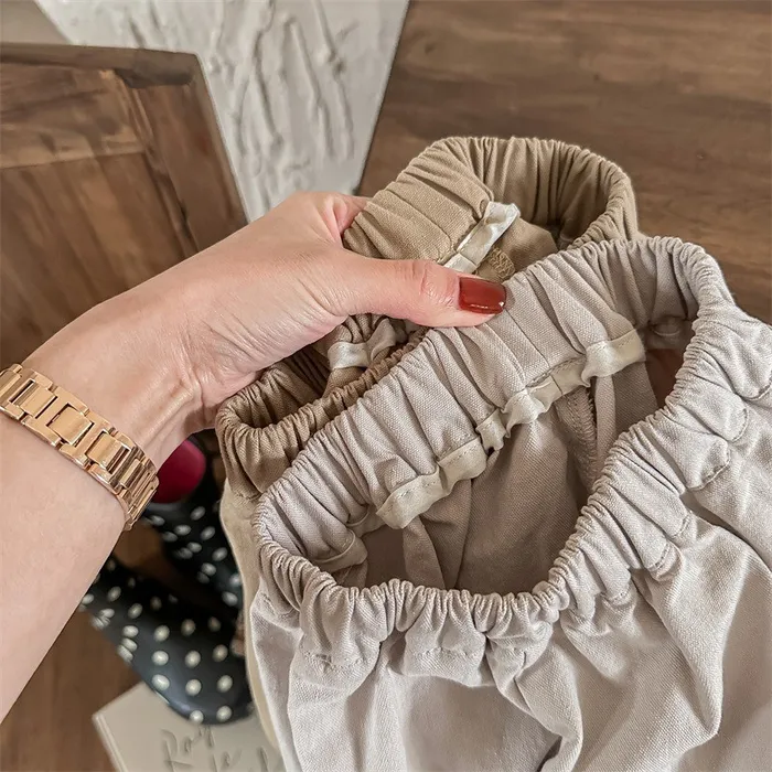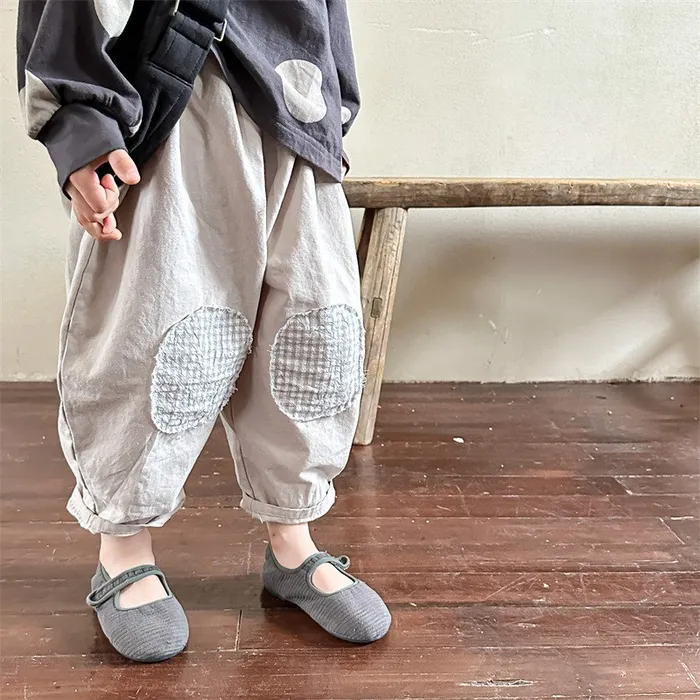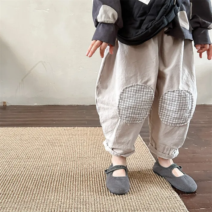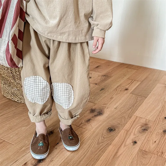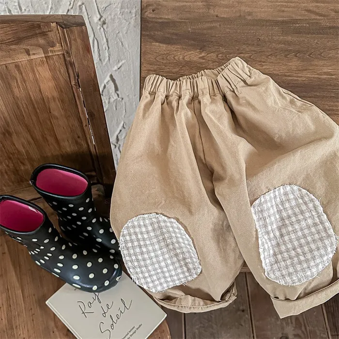 棉質格紋膝補釘鬆緊腰長褲
