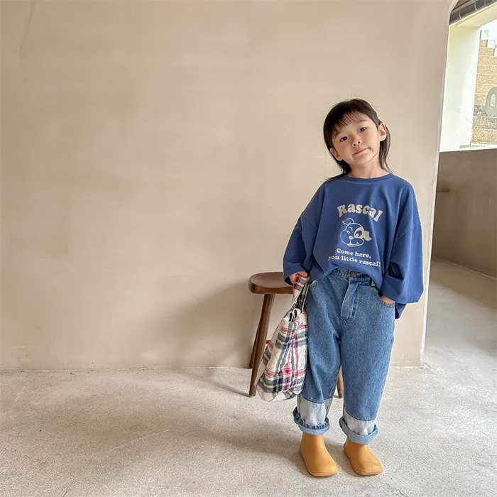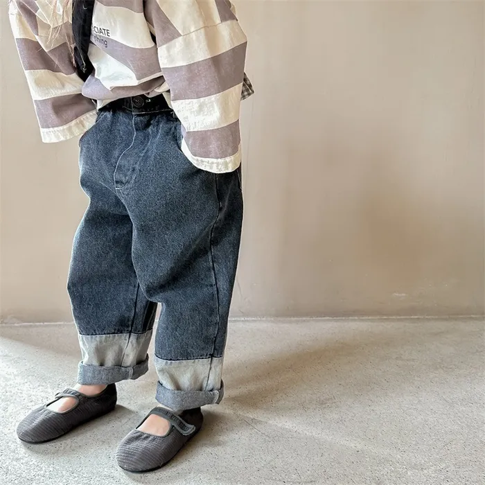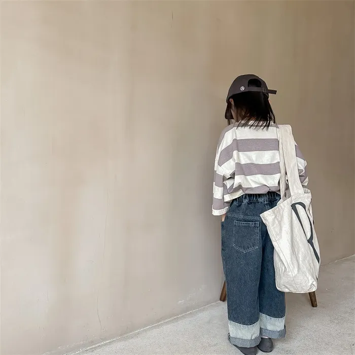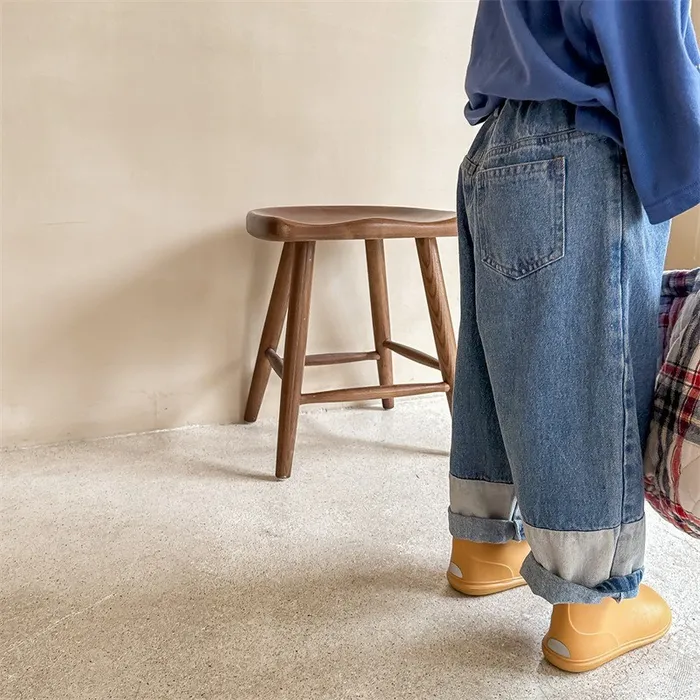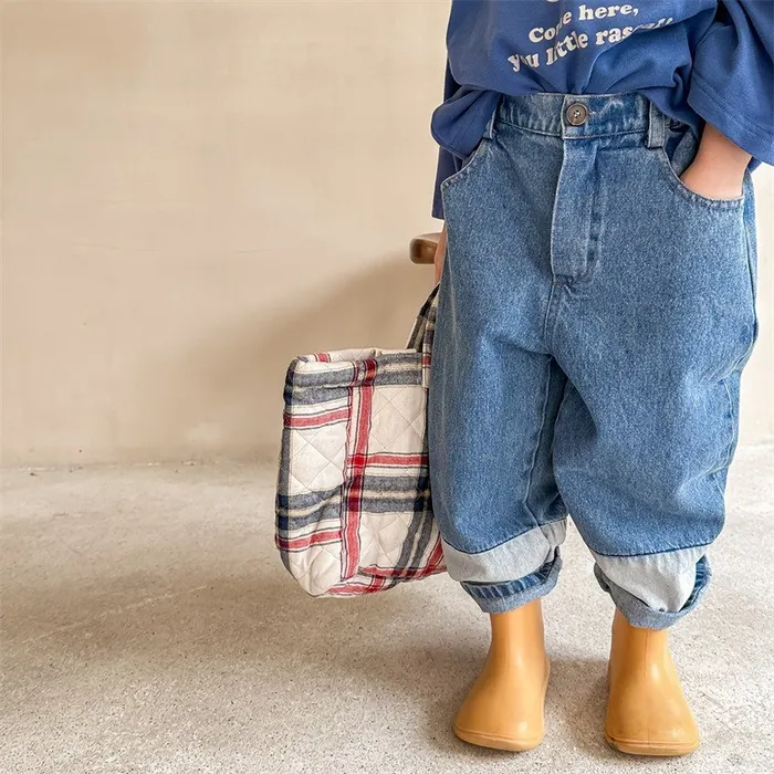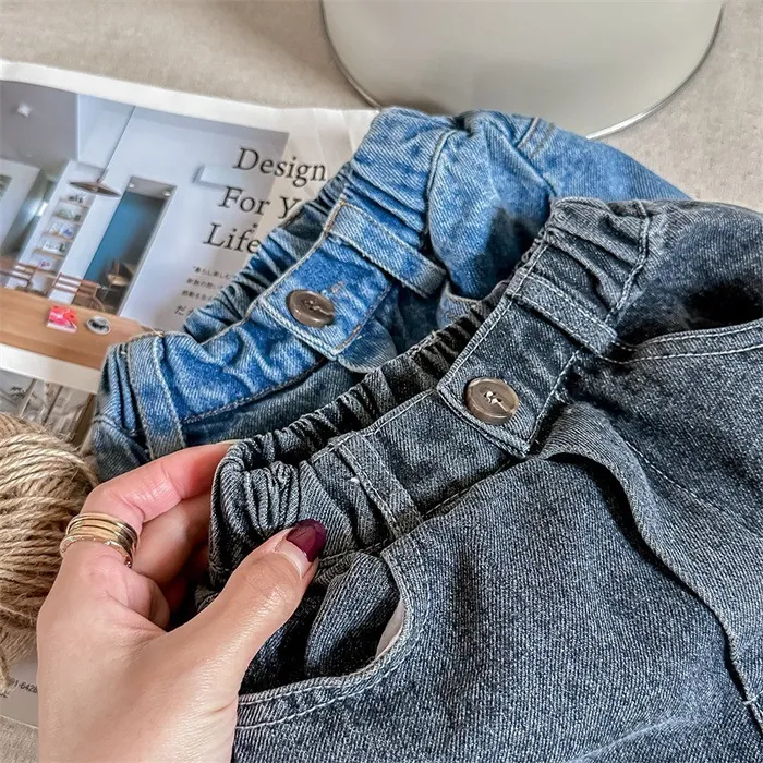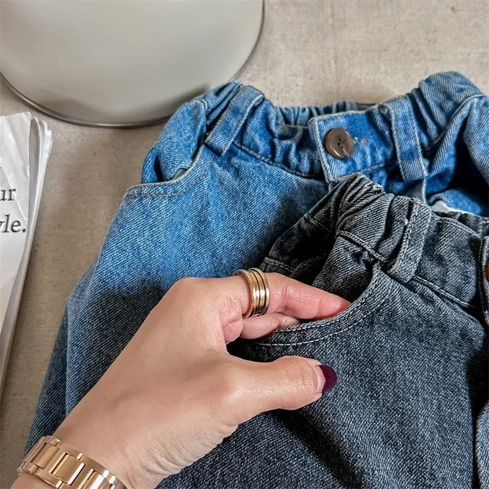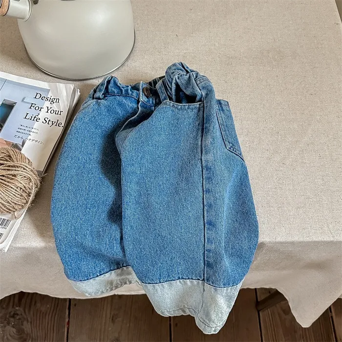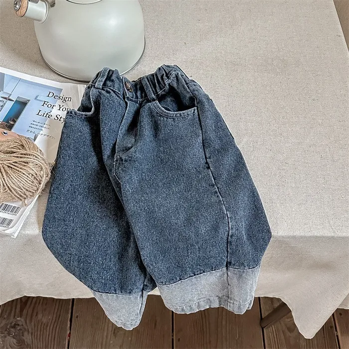 牛仔水洗色塊拼接鬆緊腰口袋褲