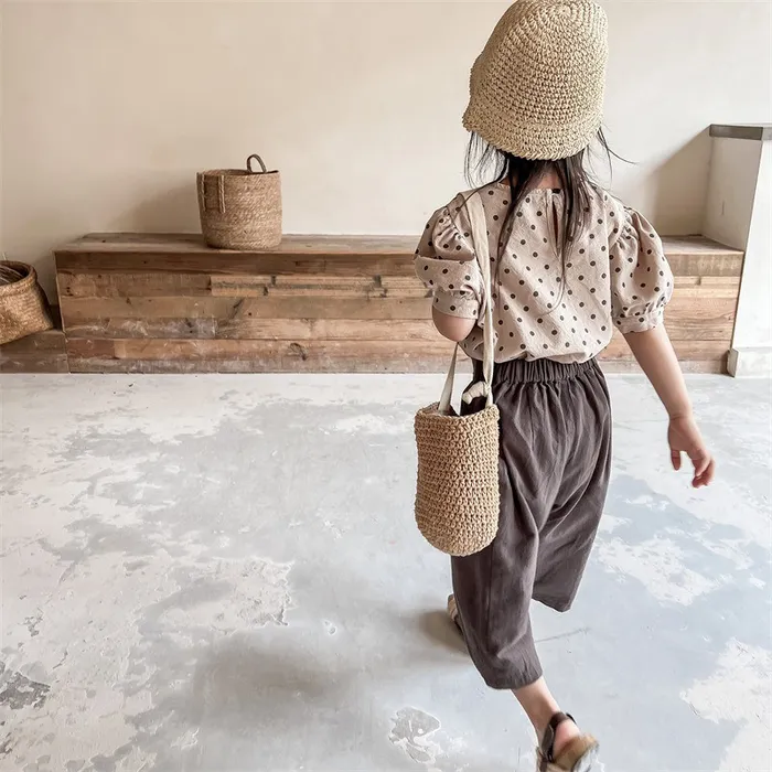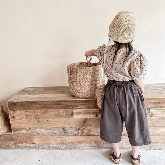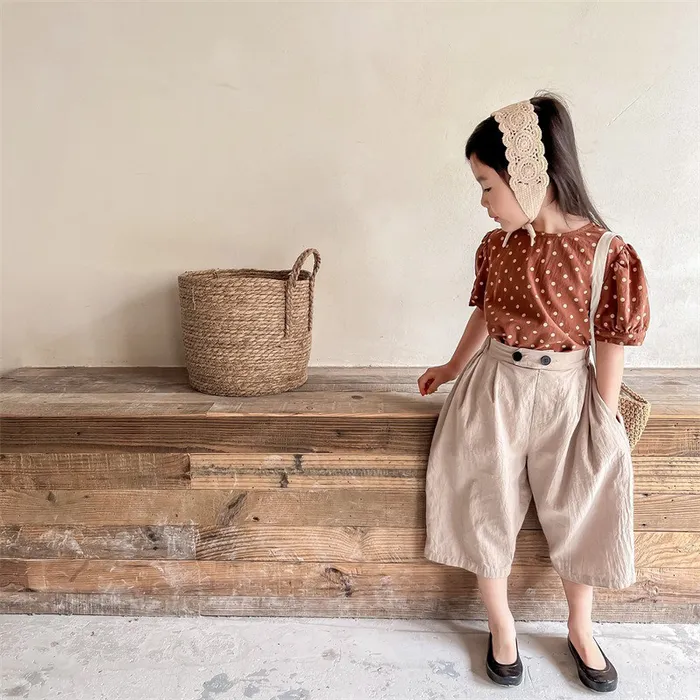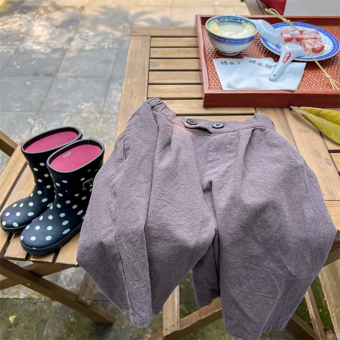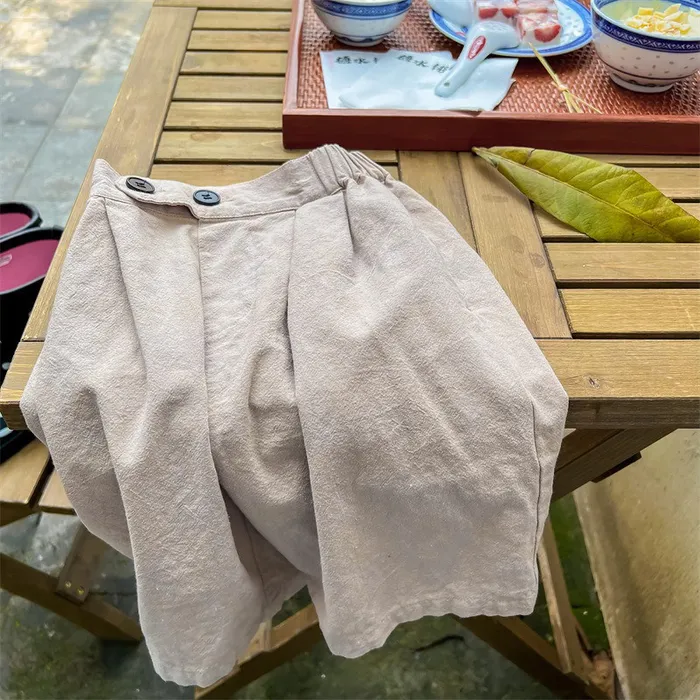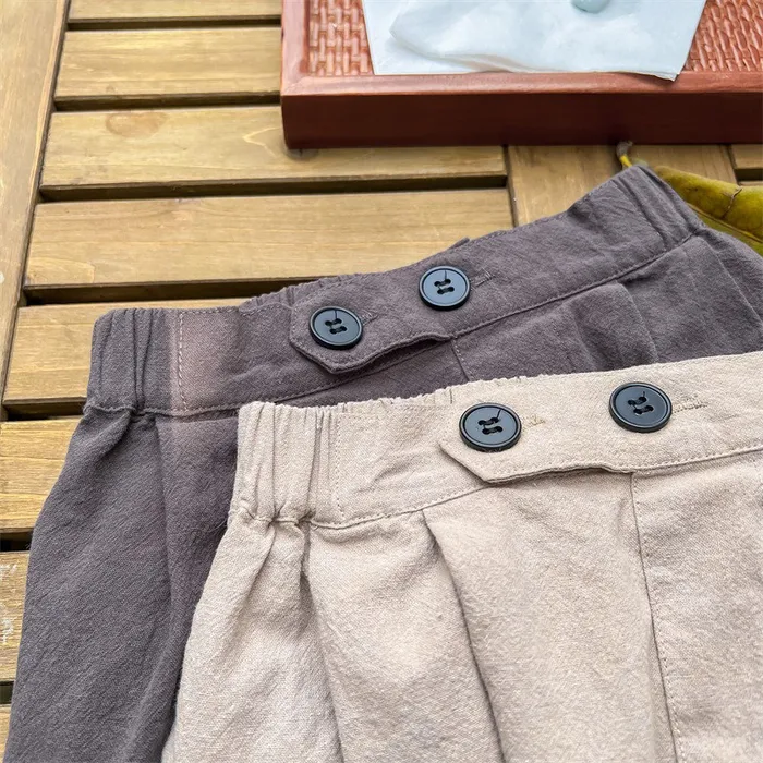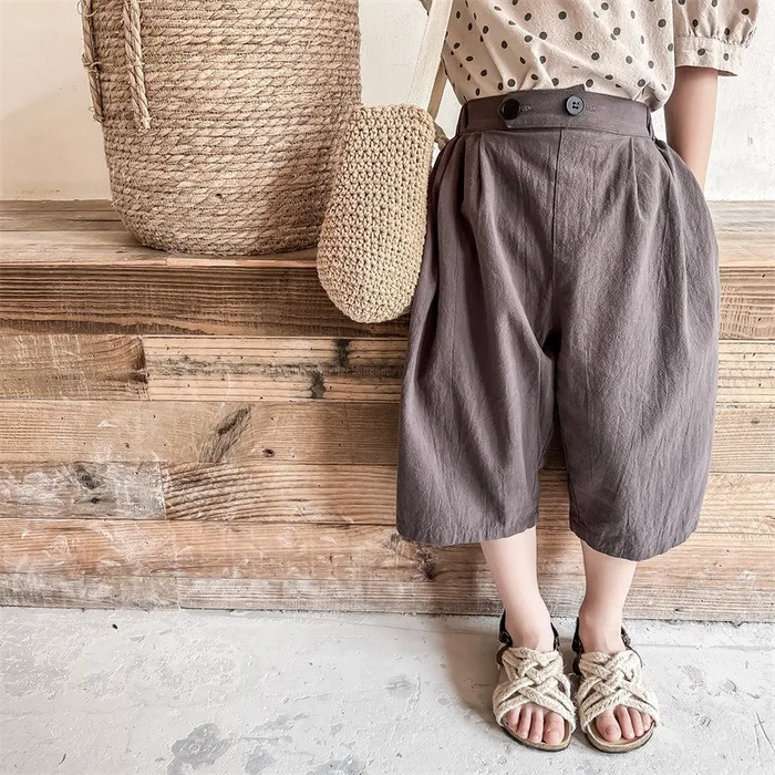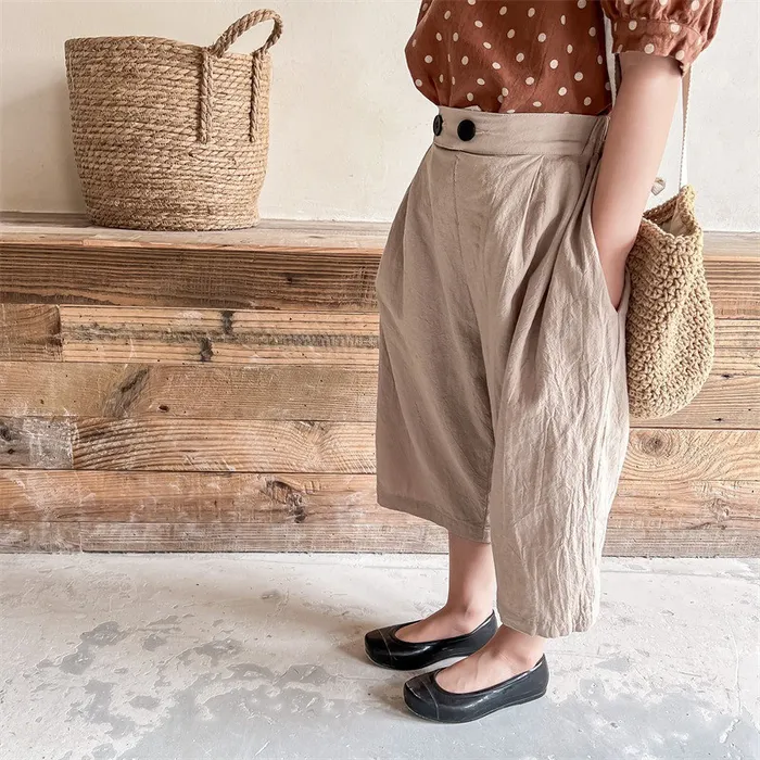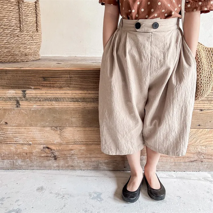 棉麻兩顆釦口袋七分休閒寬褲