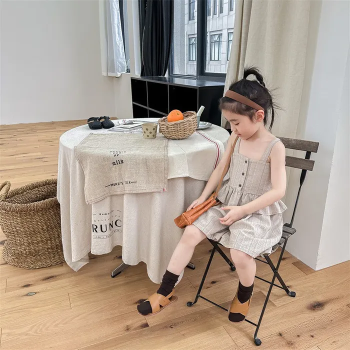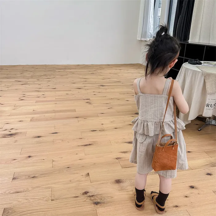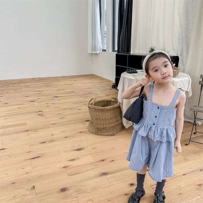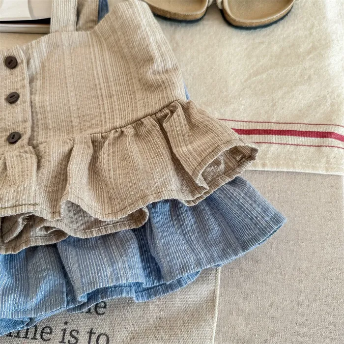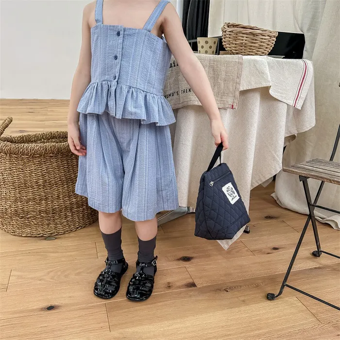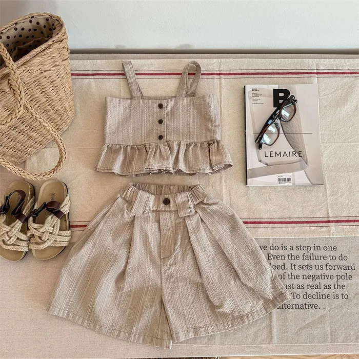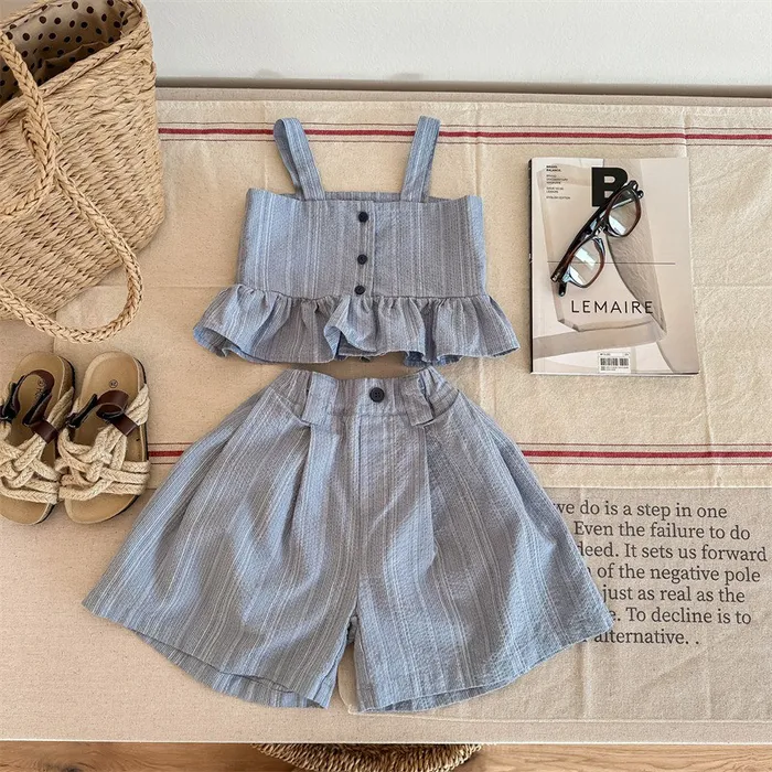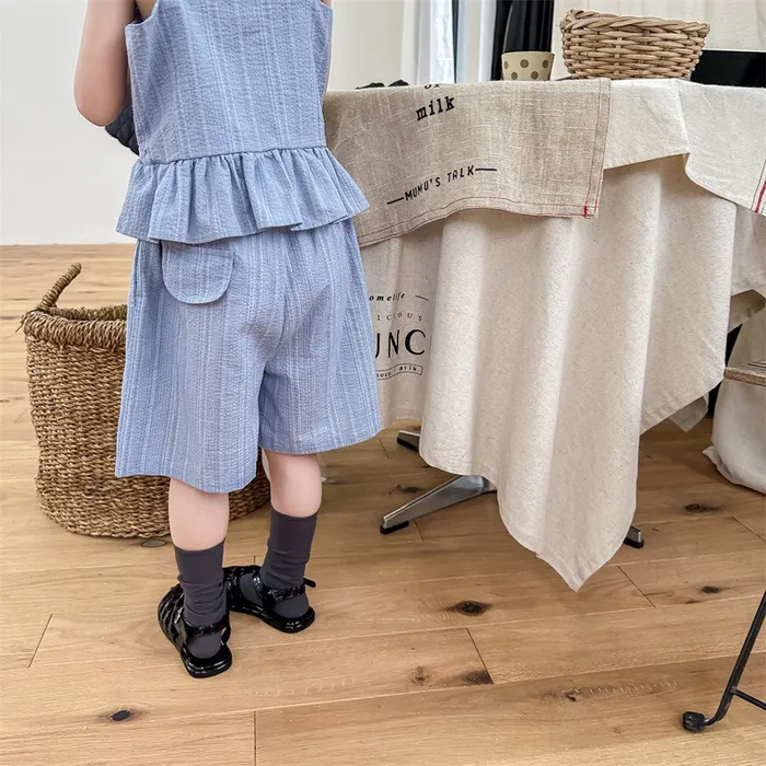 棉混紡荷葉邊兩件式套裝(吊帶背心+短褲)