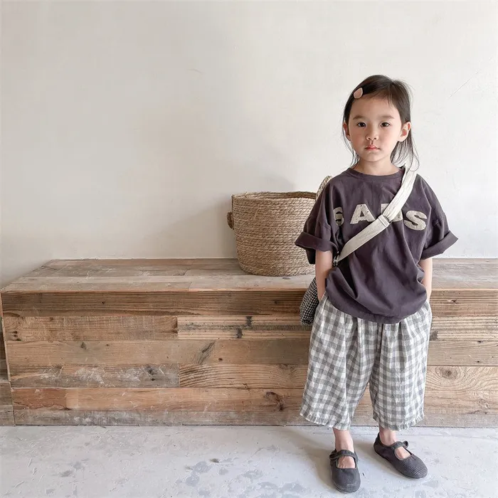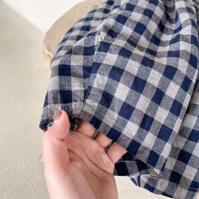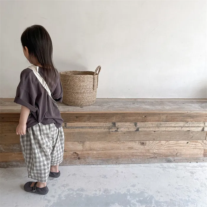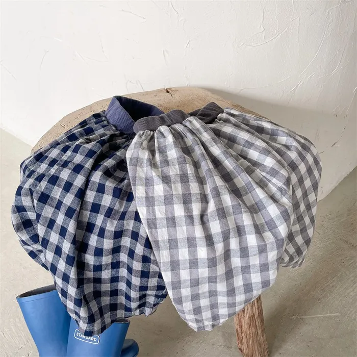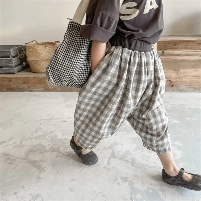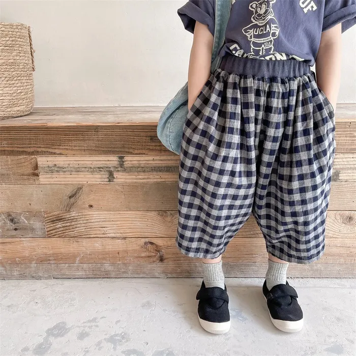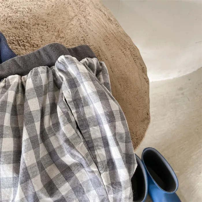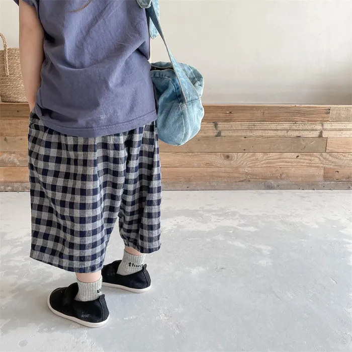 棉質格紋鬆緊腰口袋休閒褲