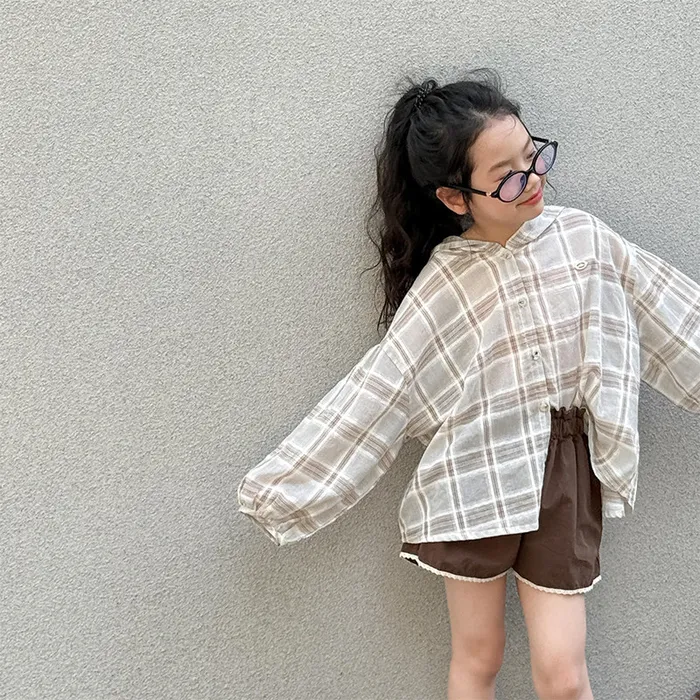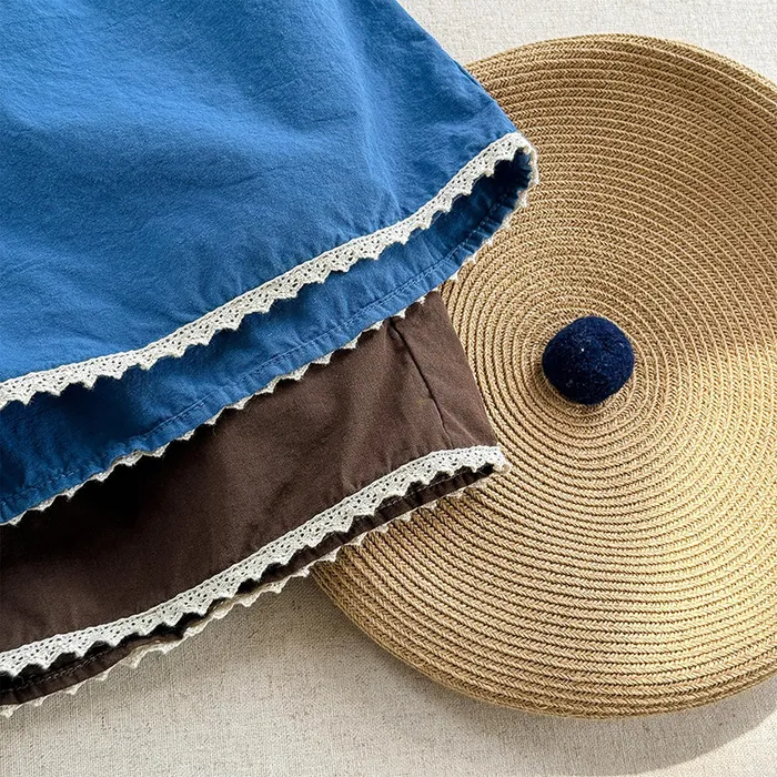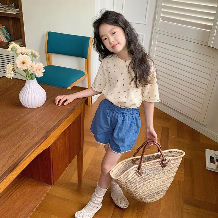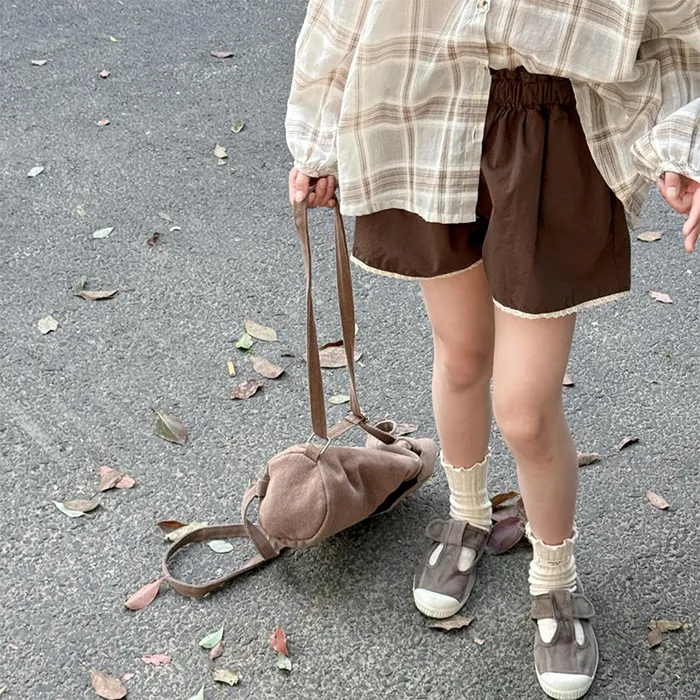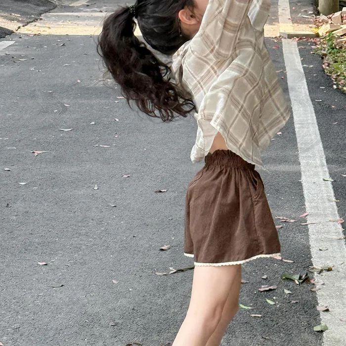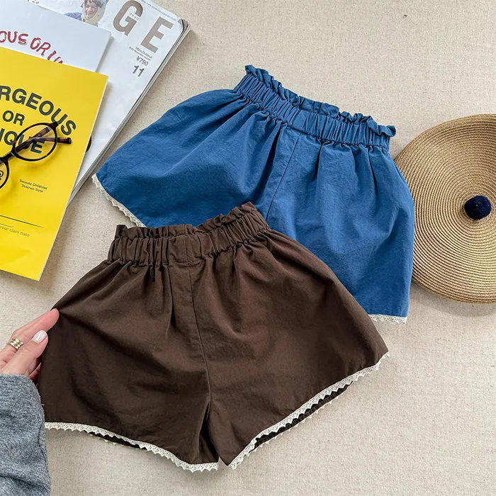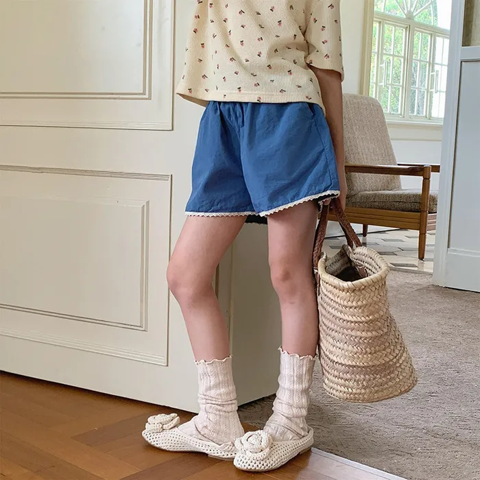 棉混紡鬆緊腰褲腳蕾絲花邊口袋短褲